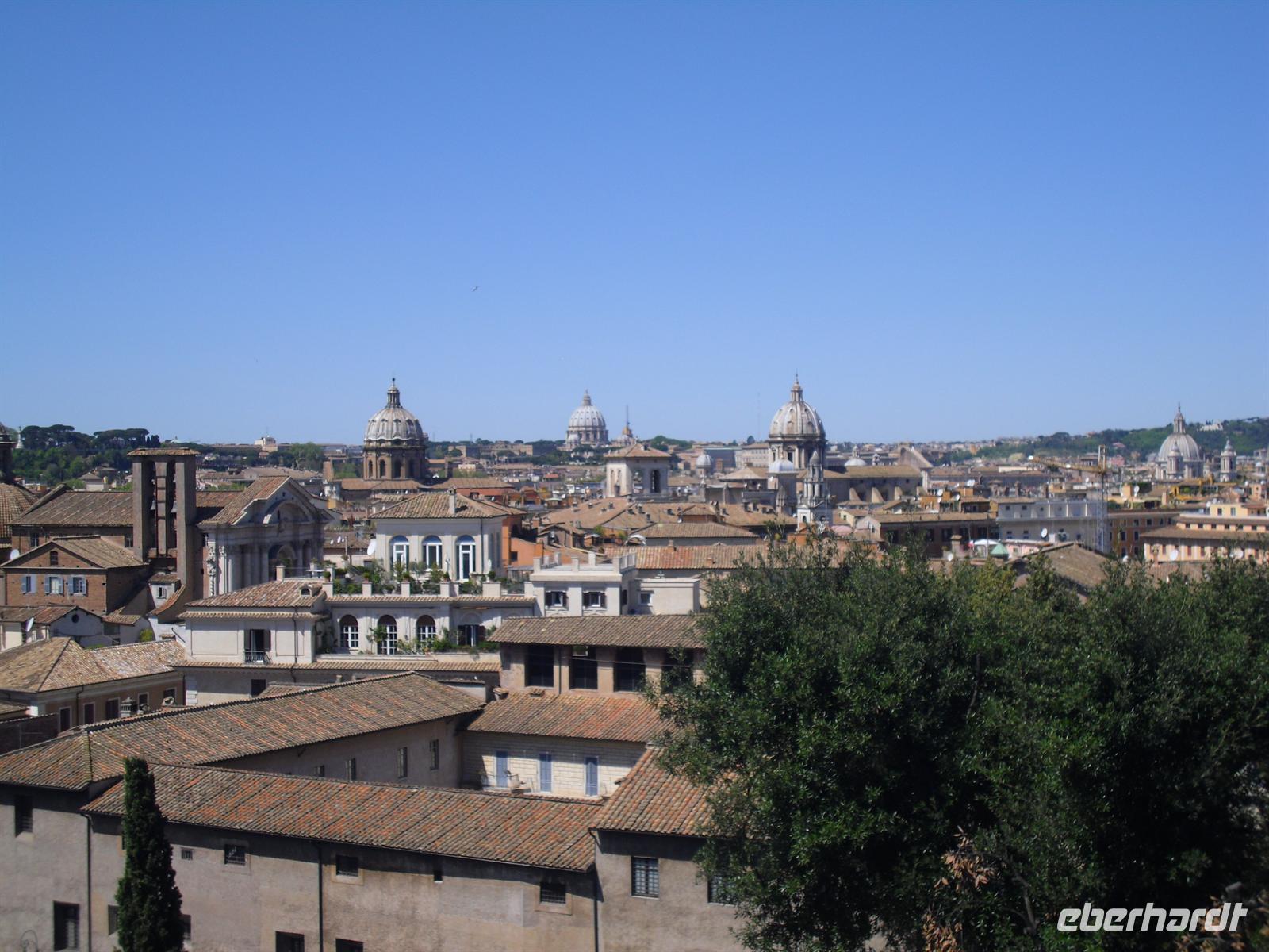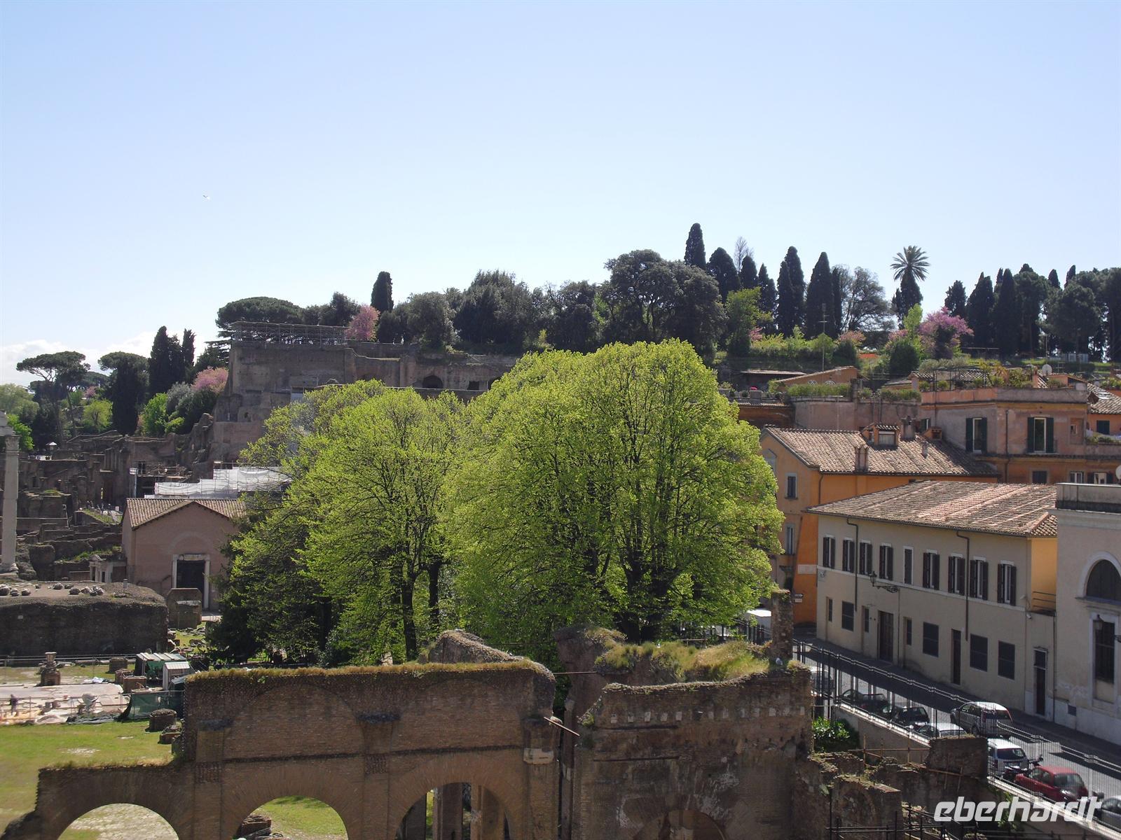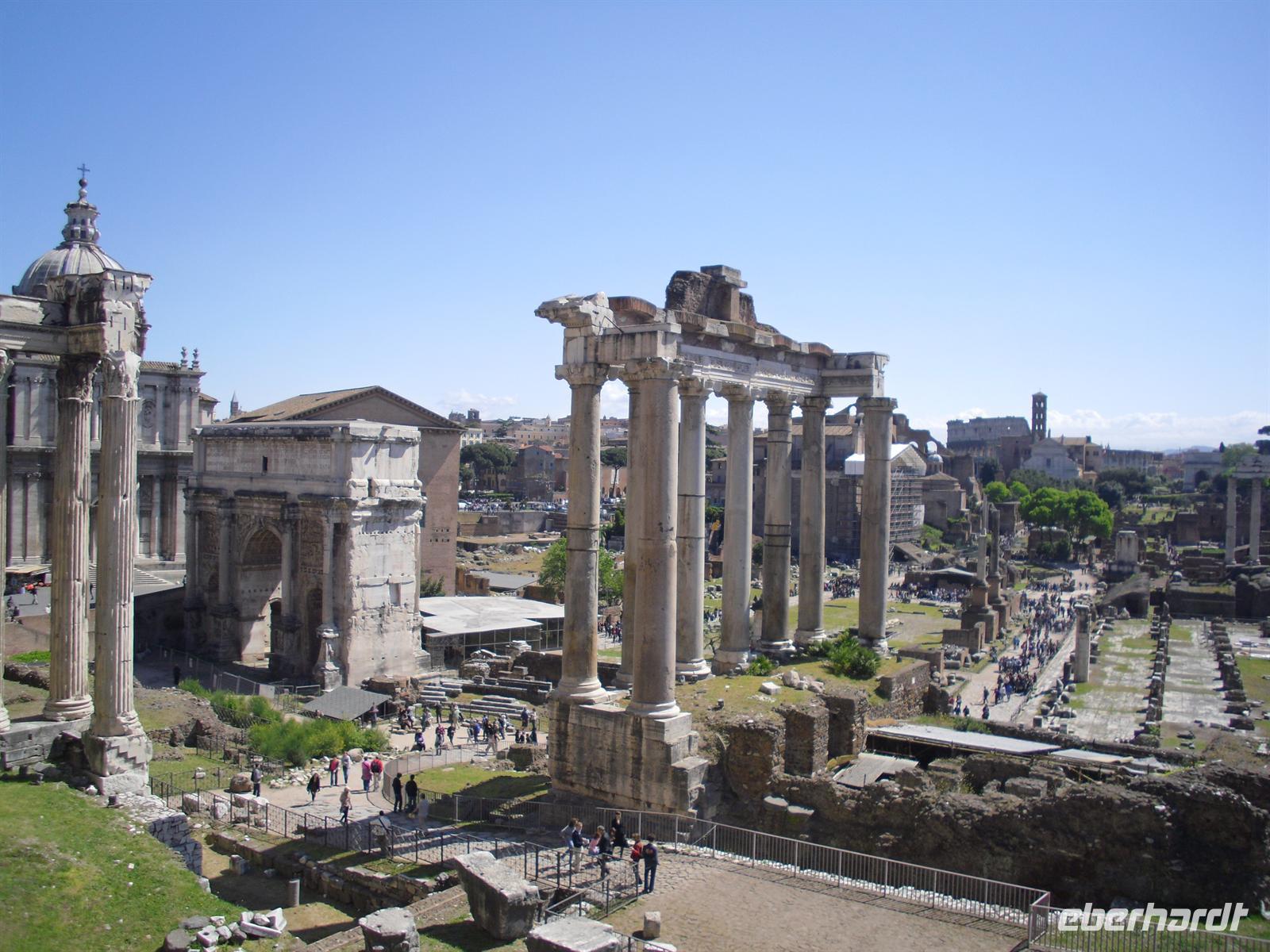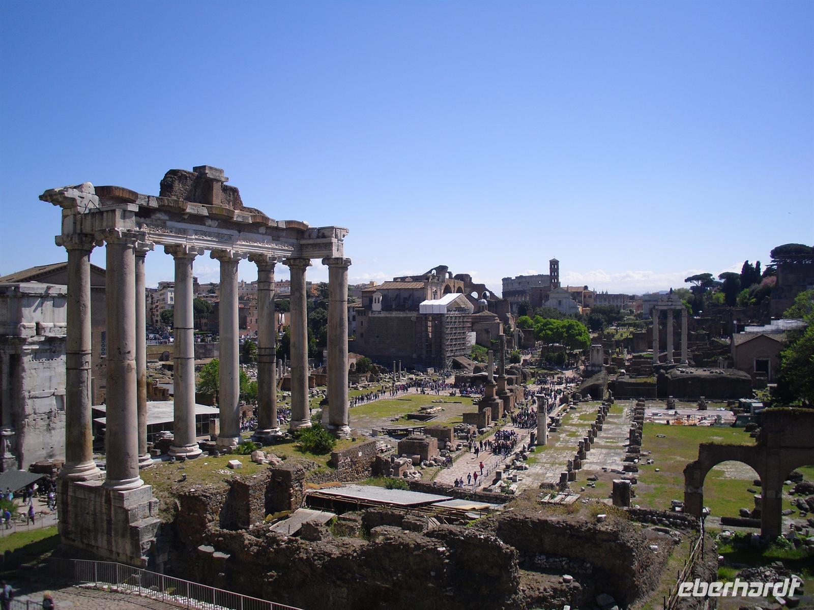 Das Kolosseum sehen wir von außen, ansonsten würde das unseren zeitlichen Rahmen sprengen; Kaiser Vespasian begann den Bau 72 n. Chr., sein Sohn Titus weihte die Arena nach nur achtjähriger Bauzeit mit hunderttägigen Festspielen ein. Unzählige Tiere und Gladiatoren wurden geopfert. Sehr lebendig sind allerdings noch die Legionäre, mit denen man hier gegen ein Entgeld für ein Foto posieren kann. Weiter spazieren wir durch das Forum Romanum. Von den Kaiserforen wurde nicht nur Rom, sondern das ganze Römische Reich regiert. Hier lag für fast 1.000 Jahre das Zentrum der Antike. Der Etruskerkönig Priscus hatte im 6. Jh. v. Chr. den Sumpf zwischen Kapitol, Palatin und Esquilin entwässert und als „Cloaca Maxima“, die erste große Kläranlage der Antike, dem Tiber zugeführt. Das Forum Romanum, ursprünglich als Vestaheiligtum gedacht, entwickelte sich vom Viehmarkt zur politischen Arena. Anschließend spazieren wir zum Kapitolshügel hinauf - hier standen einst die Tempel Jupiters und Junos. Michelangelo gestaltete im Jahr 1536 den trapezförmigen Kapitolsplatz, der vom Palazzo dei Senatori, dem Palazzo dei Conservatori und dem Palazzo Nuovo gerahmt wird. Den Piedestal, wo Kaiser Mark Aurel seit 1538 mit erhobener Hand grüßte, schmückt heute eine Kopie. Vor Umweltschäden bewahrt steht das originale Reiterstandbild aus dem 2. Jh. in den Kapitolinischen Museen.