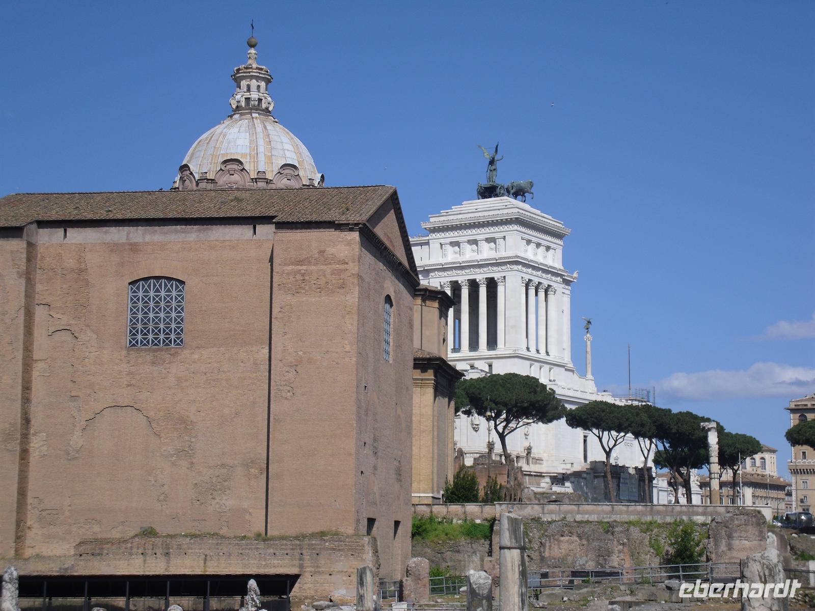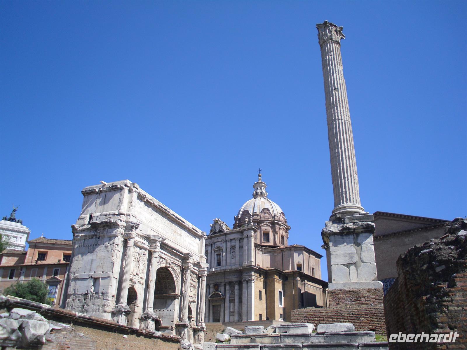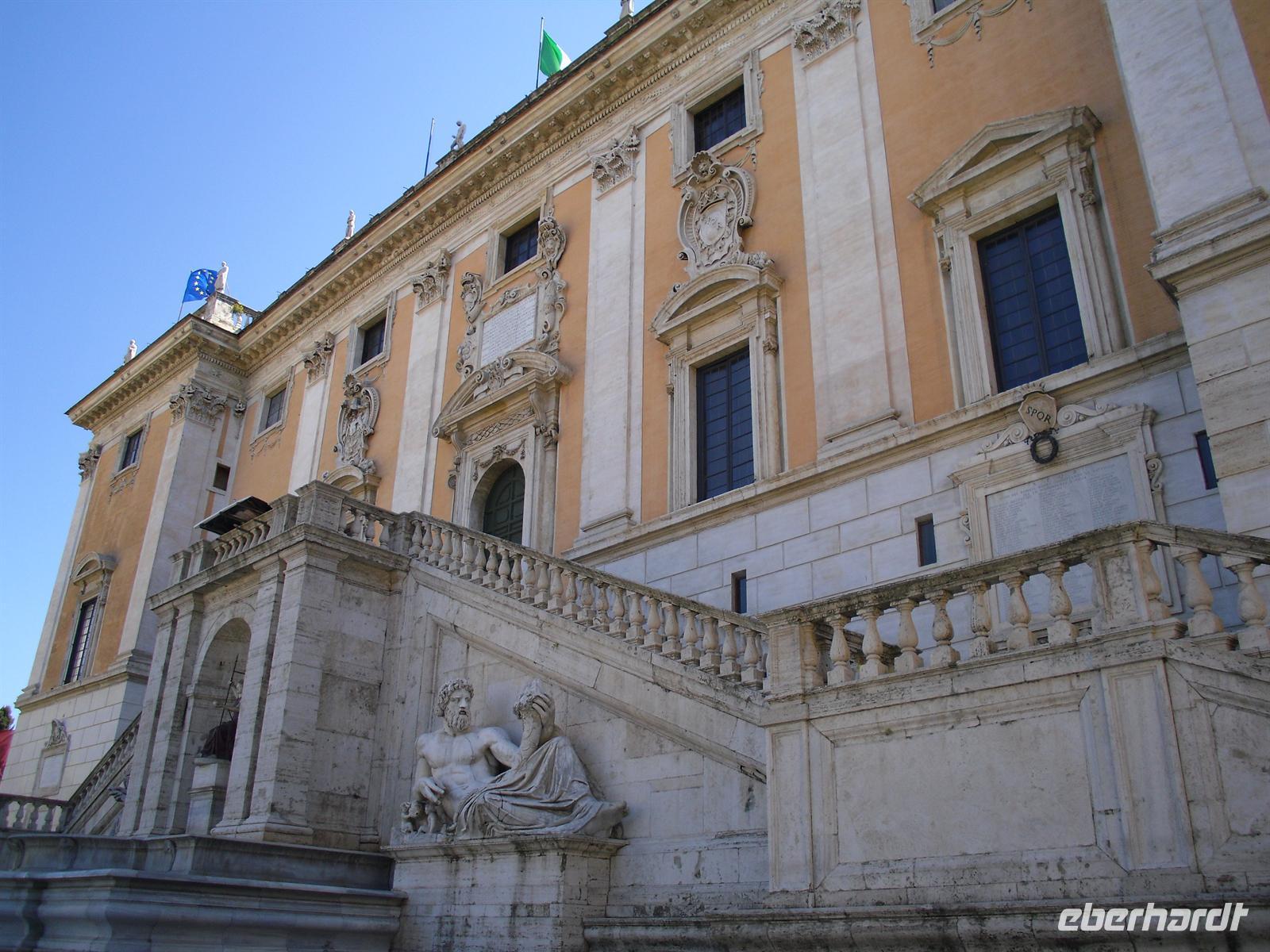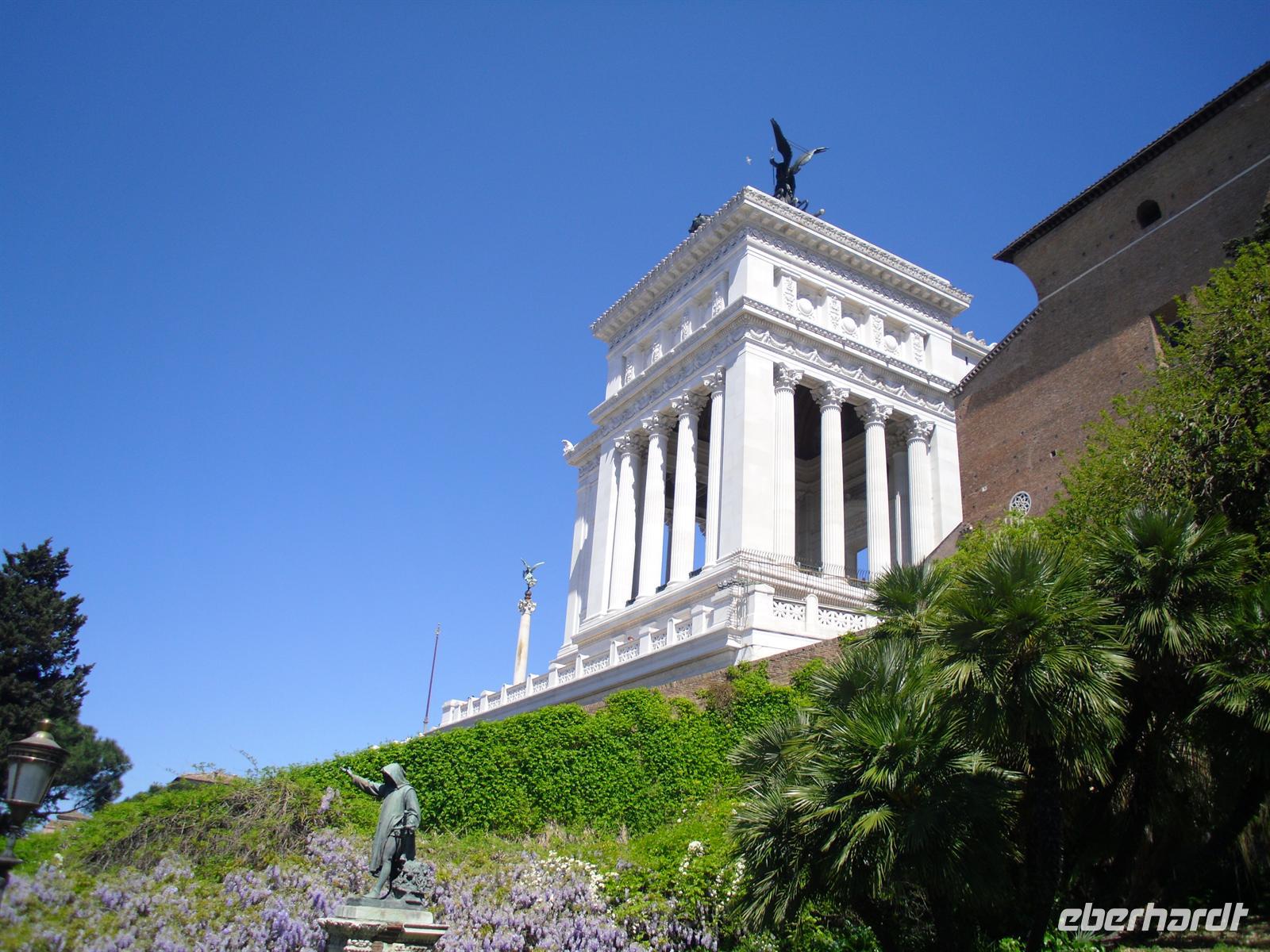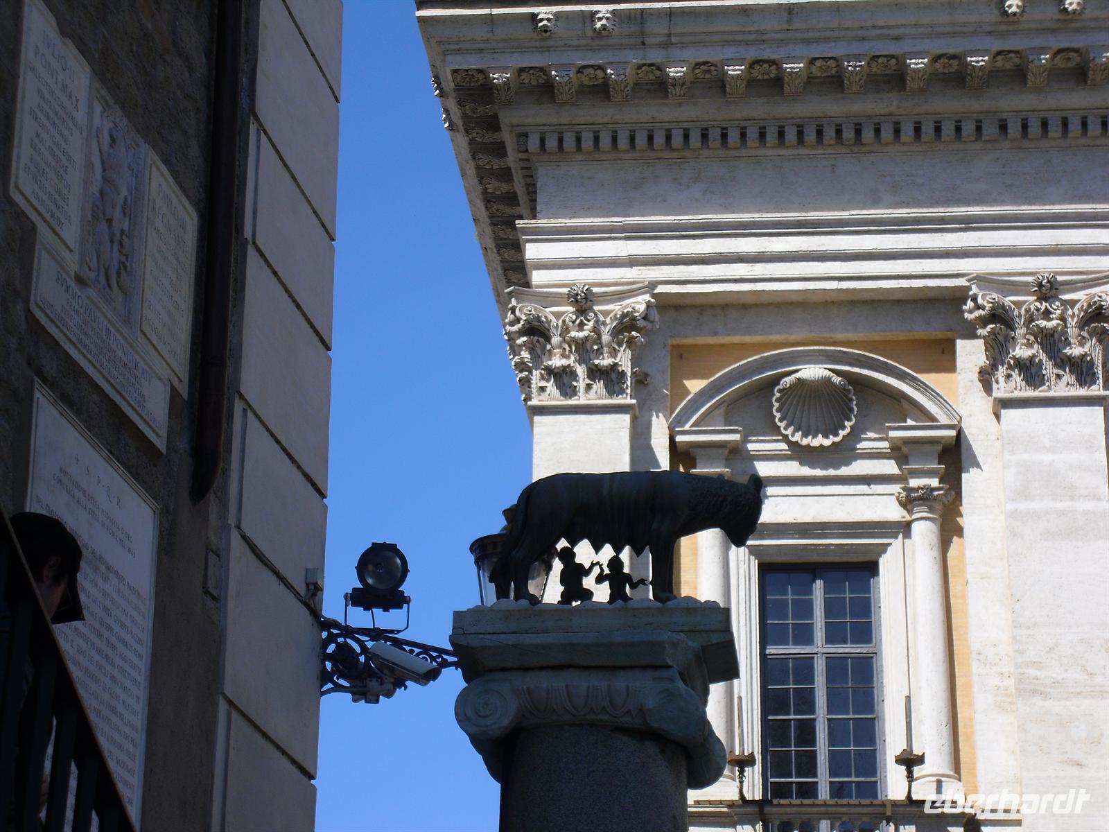 Das Kolosseum sehen wir von außen, ansonsten würde das unseren zeitlichen Rahmen sprengen; Kaiser Vespasian begann den Bau 72 n. Chr., sein Sohn Titus weihte die Arena nach nur achtjähriger Bauzeit mit hunderttägigen Festspielen ein. Unzählige Tiere und Gladiatoren wurden geopfert. Sehr lebendig sind allerdings noch die Legionäre, mit denen man hier gegen ein Entgeld für ein Foto posieren kann. Weiter spazieren wir durch das Forum Romanum. Von den Kaiserforen wurde nicht nur Rom, sondern das ganze Römische Reich regiert. Hier lag für fast 1.000 Jahre das Zentrum der Antike. Der Etruskerkönig Priscus hatte im 6. Jh. v. Chr. den Sumpf zwischen Kapitol, Palatin und Esquilin entwässert und als „Cloaca Maxima“, die erste große Kläranlage der Antike, dem Tiber zugeführt. Das Forum Romanum, ursprünglich als Vestaheiligtum gedacht, entwickelte sich vom Viehmarkt zur politischen Arena. Anschließend spazieren wir zum Kapitolshügel hinauf - hier standen einst die Tempel Jupiters und Junos. Michelangelo gestaltete im Jahr 1536 den trapezförmigen Kapitolsplatz, der vom Palazzo dei Senatori, dem Palazzo dei Conservatori und dem Palazzo Nuovo gerahmt wird. Den Piedestal, wo Kaiser Mark Aurel seit 1538 mit erhobener Hand grüßte, schmückt heute eine Kopie. Vor Umweltschäden bewahrt steht das originale Reiterstandbild aus dem 2. Jh. in den Kapitolinischen Museen.