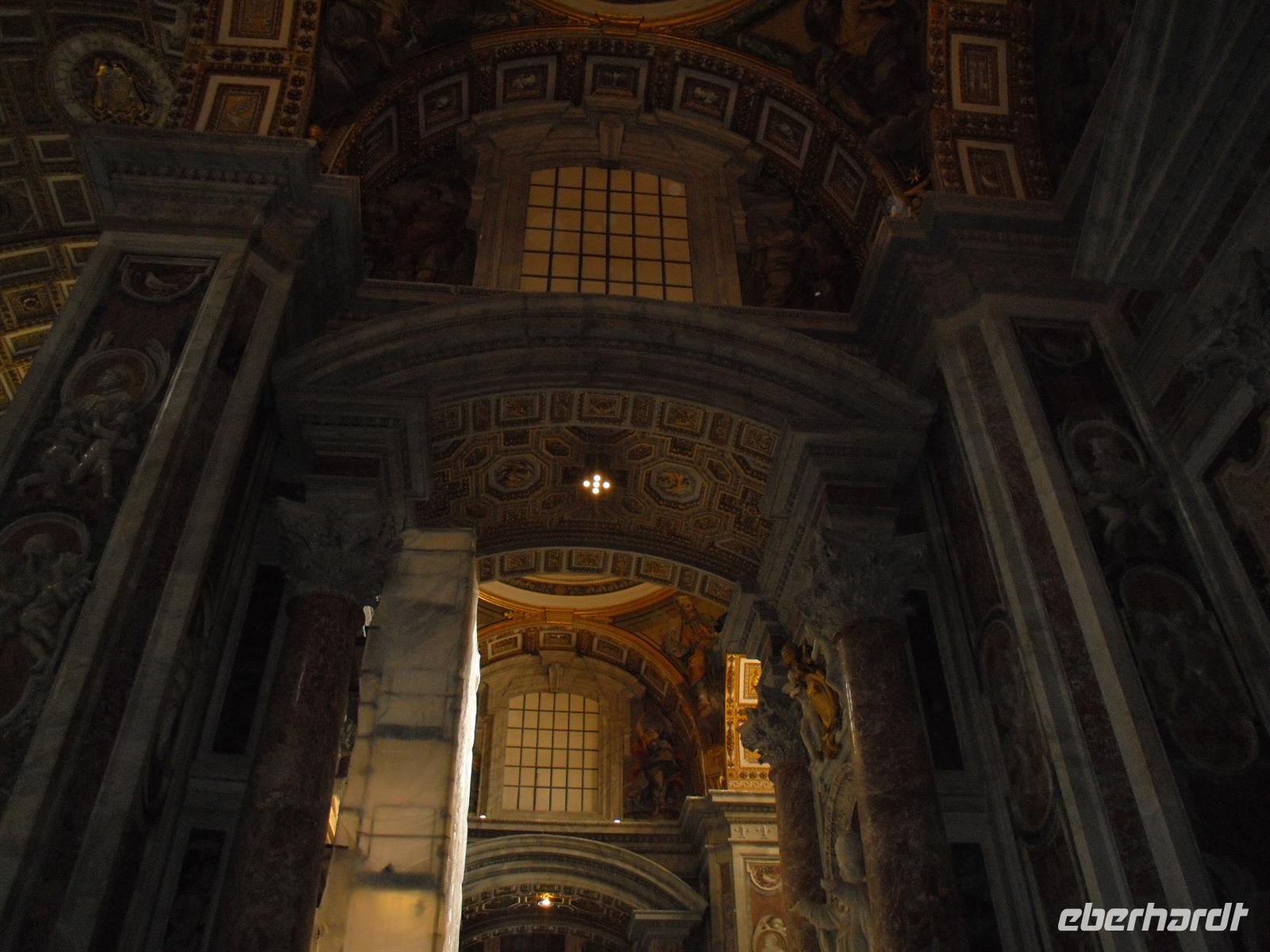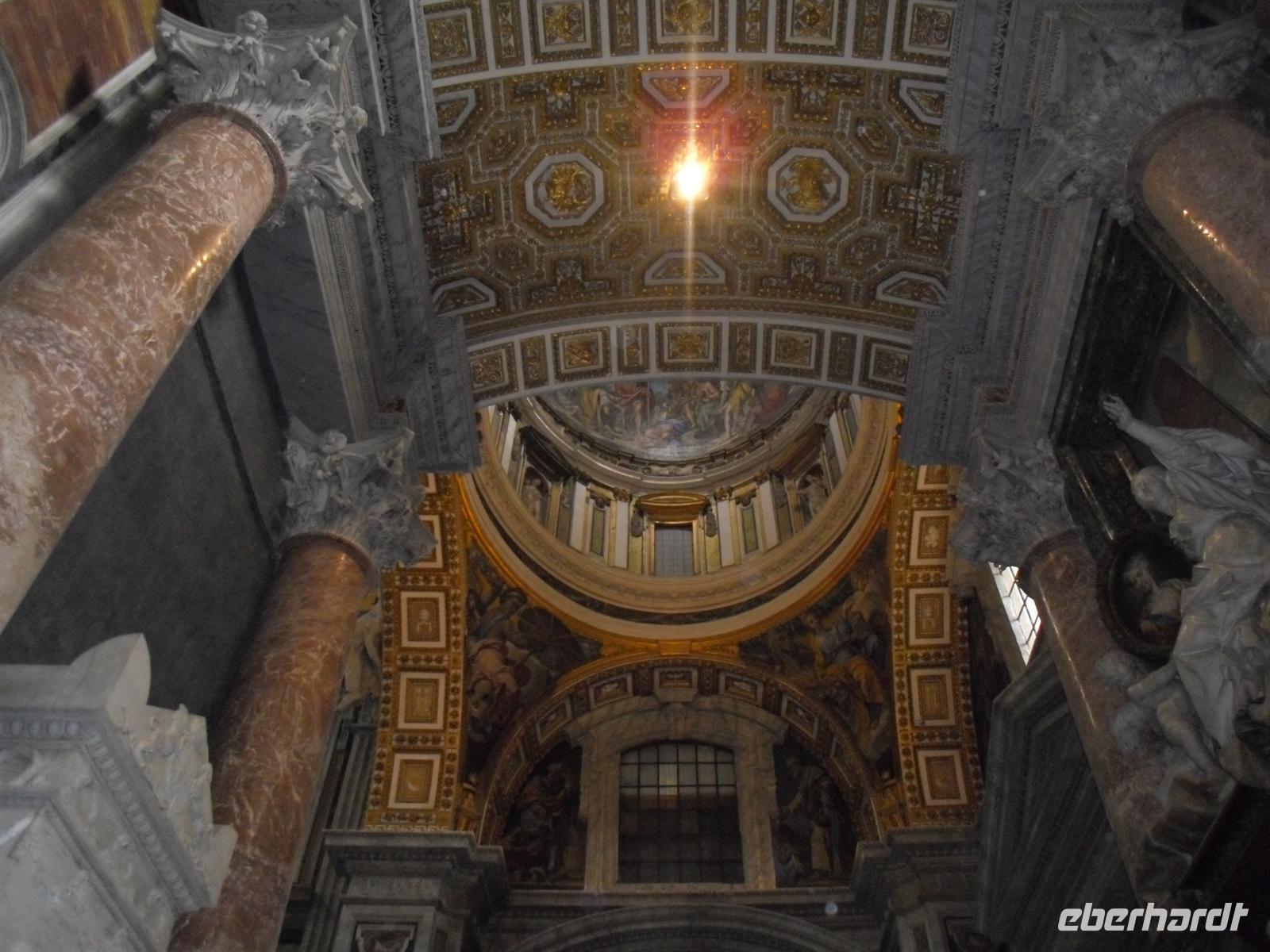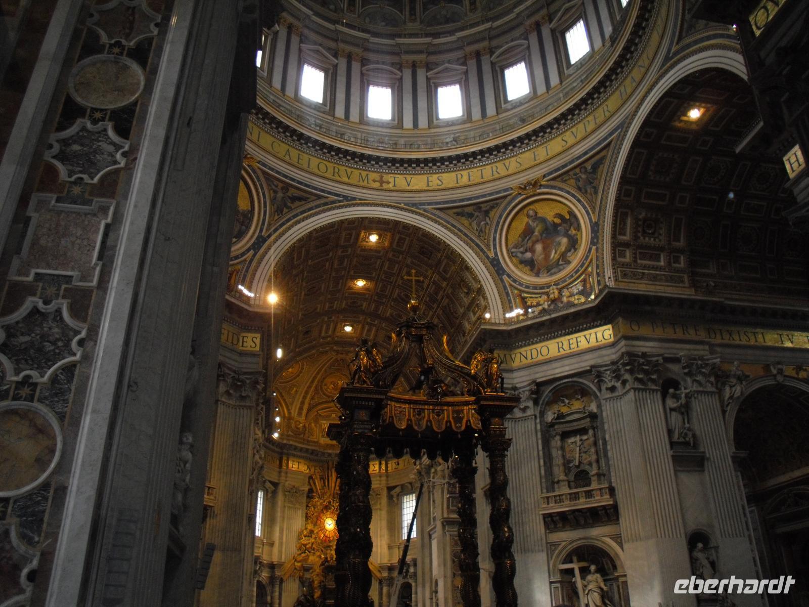 Wenn man von hier nach ganz rechts oben schaut, sieht man das Arbeitszimmer des Papstes, letzter Stock des Apostolischen Palastes, zweites Fenster von rechts. Sonntags um zwölf spricht er hier das Angelus-Gebet. Unter den Kolonnaden des Bernini erspäht man die Schweizergarde, jawohl, immer noch echte Schweizer, und die Uniform ist noch die, welche Michelangelo entworfen hat. Am anderen Ende der Piazza, majestätisch wie ein ruhender Löwe - die Peterskirche. Allein der Baldachin über dem Petrusgrab ist genauso hoch wie der Palazzo Farnese, einfach gigantisch! Aber die größte Kirche der Christenheit befindet sich im kleinsten Staat der Welt, denn der Vatikan ist mit 44 Hektar Staatsgebiet nicht gewaltiger als ein mittlerer Bauernhof. Seine knapp 500 Einwohner bilden das, was man andernorts eine Dorfgemeinschaft nennen würde. Eine Kaffeebar gibt es nicht, dagegen hält der Vatikan zu 170 Staaten diplomatische Beziehungen und der Papst empfängt weitaus mehr Staatsmänner zur Audienz als die italienische Regierung zu offiziellen Unterredungen. Die katholische Kirche ist übrigens die einzige Weltreligion, deren Oberhaupt gleichzeitig unumschränkte Autorität eines souveränen Staates ist. Zuerst besuchen wir den Petersdom, hier ist Geduld gefragt, denn wir sind nicht die einzigen die hinein wollen... Nach dem Passieren der Sicherheitskontrolle ist es soweit, wir sind einfach überwältigt!
