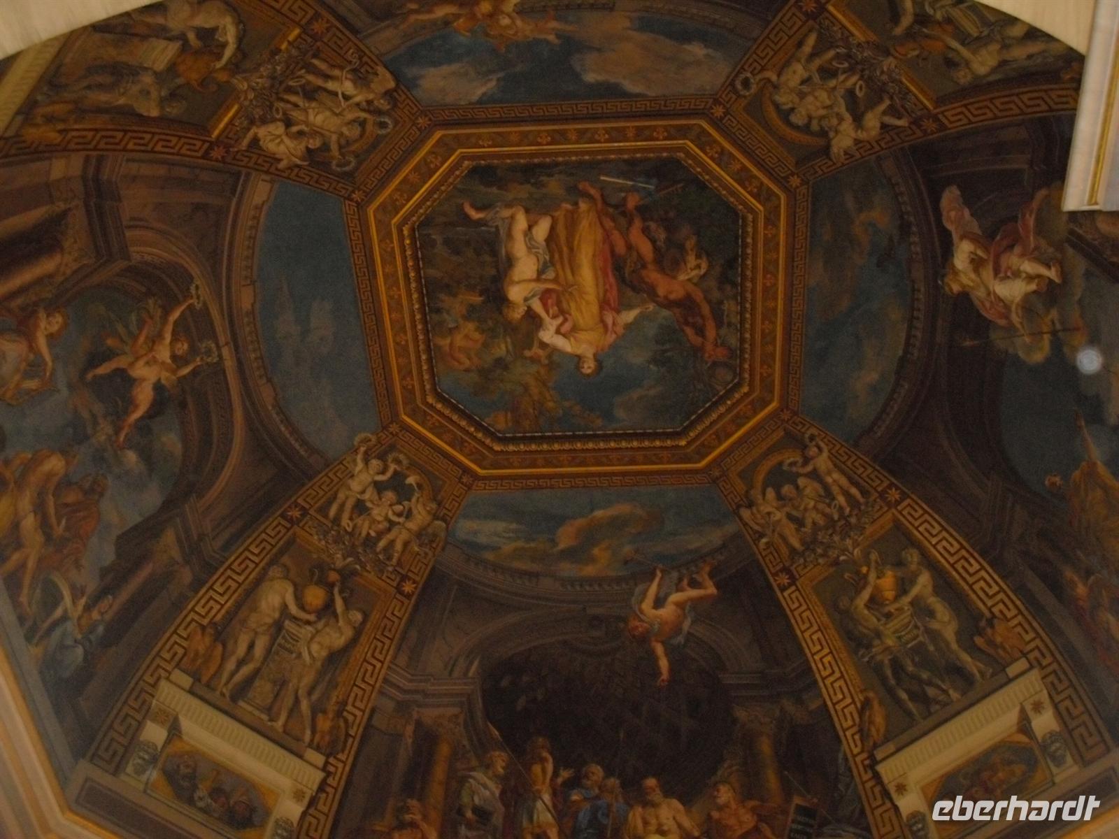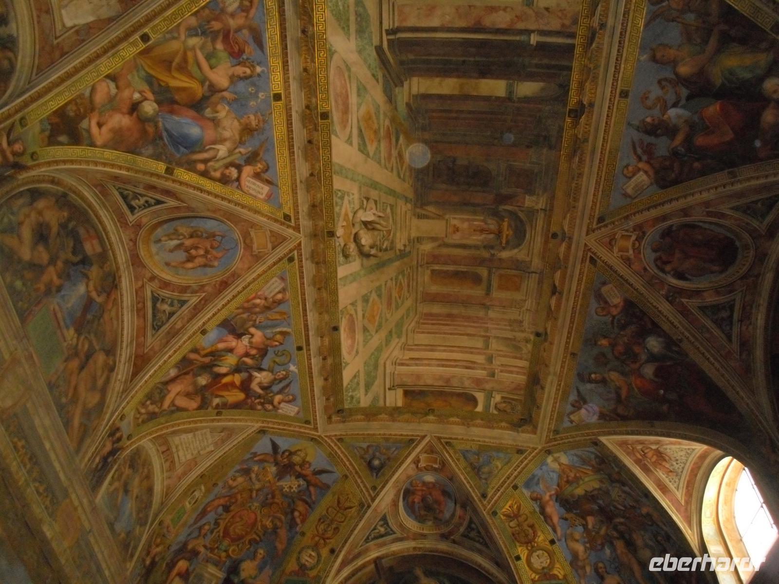 Schaut man sich die Karten genau an, so erkennt man auch Darstellungen geschichtlicher Ereignisse, die sich an den verschiedenen, abgebildeten Orten zugetragen haben. Auch die goldene Decke ist in diese übergrosse Landkarte einbezogen, dort sieht man in Gemälden Episoden aus der Heiligen- und Kirchengeschichte, die sich an verschiedenen Orten zugetragen haben. In der Sixtinischen Kapelle angekommen, ist man zunächst ein wenig irritiert. Man kommt in einen großen Raum mit jeder Menge Menschen, alle schauen nach oben, allgemeines Gemurmel und das Licht ist im Vergleich zum vorher langgezogenen Gang mit goldfarbener Decke sehr dunkel. Ich zumindest brauchte bei meinem ersten Besuch einen Moment, bis ich verstand, dass ich in der Sixtinischen Kapelle angekommen war und die Menschen mit ihren Blicken nach oben das Werk Michelangelos bewunderten. Die Sixtinische Kapelle wurde von 1475 bis 1483 unter Papst Sixtus IV. della Rovere erbaut. An den Wänden sind Malereien von vielen Meistern dieser Zeit zu bewundern. Hauptanziehungspunkt sind aber die Deckengemälde Michelangelos, die er von 1508 n. Chr. bis 1512 n. Chr. gemalt hat. In den Fresken werden mehrere Episoden der Schöpfungsgeschichte dargestellt. Während man langsam in die Sixtinische Kapelle geht und sich einen Platz sucht, um ungestört nach oben schauen zu können, bemerkt man, wie einer der Museumswächter “Schhhhhhhhhh, silencio, silence.” ruft. Daraufhin ebbt das Gemurmel langsam ab, bis es für einen kurzen Moment völlig ruhig ist.