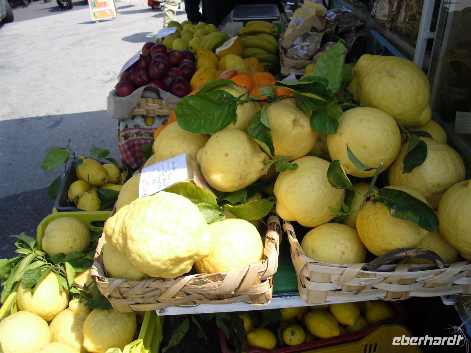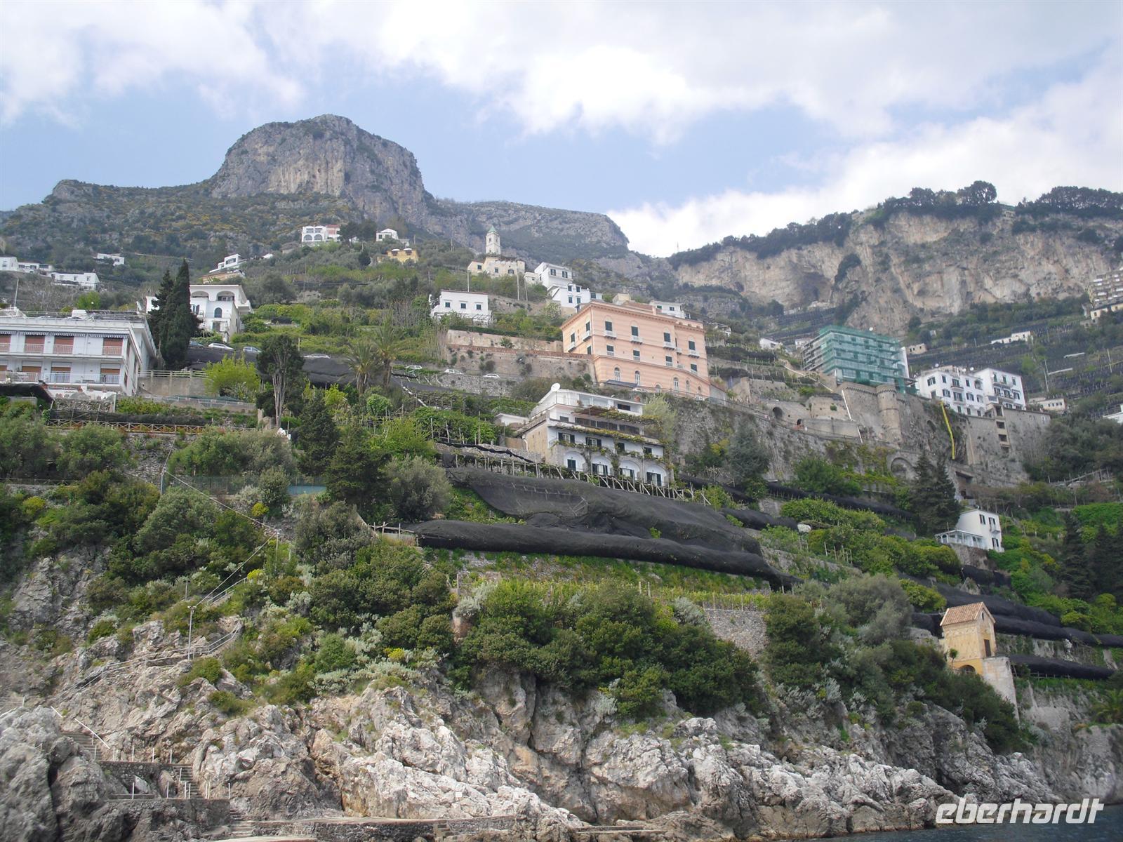 Kurz vor Positano planen wir einen Aufenthalt. Positano ist ein Traum von übereinander verschachtelten, rosa, weißen, hellgrünen und wieder weißen Häuserkuben im üppigen Grün von tropischen Bäumen, Steineichen und Oliven, im Halbrund einer Bucht. Dahinter Berge mit über 1.000 Metern, fast senkrecht! Bevor wir weiterfahren, gibt es für uns die Möglichkeit die typischen Esszitronen zu verkosten. Diese isst man mit der Schale, wahlweise mit Zucker oder Salz. Des weiteren gab es hier herrliche Gewürze, Olivenöl und Obst zu kaufen - irgendetwas nimmt schließlich jeder von uns mit…! Nun aber weiter in Richtung Amalfi. Oberhalb von Conca dei Marini können wir von der Küstenstraße aus sogar unser Hotel „Sant´Orsola“ in Agerola ausmachen. Hier in Conca dei Marini machen wir eine kleine Kaffeepause und nach weiteren etwa 15 Minuten Busfahrt kommen wir in Amalfi an - auf beiden Seiten eines schmalen Tals steigen die Häuser den Berg hoch. Ihre Bauweise ist städtisch mit 3 - 5 Stockwerken, am Hang stehen sie übereinandergebaut. Wir machen einen kleinen Rundgang durch schmale Treppengäßchen, teilweise so eng, dass man vorsichtig aneinander vorbei gehen muss, nur die Hauptgasse auf „Eselsbreite“.