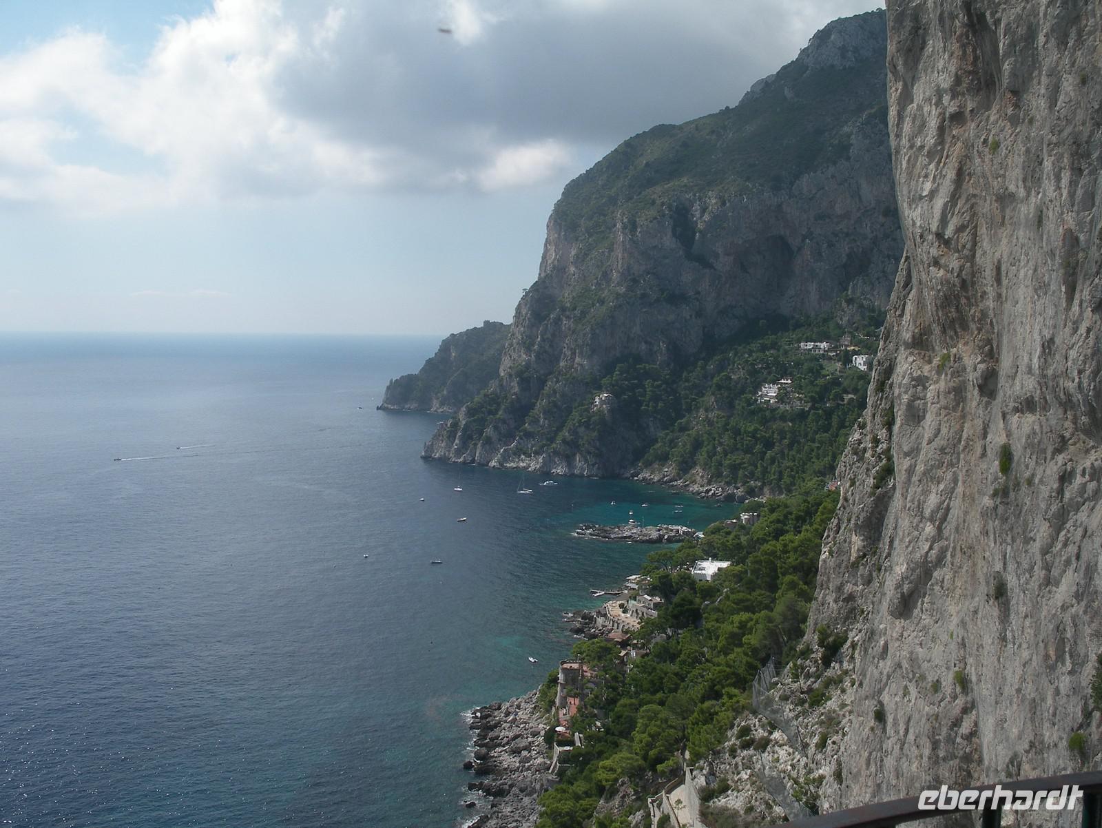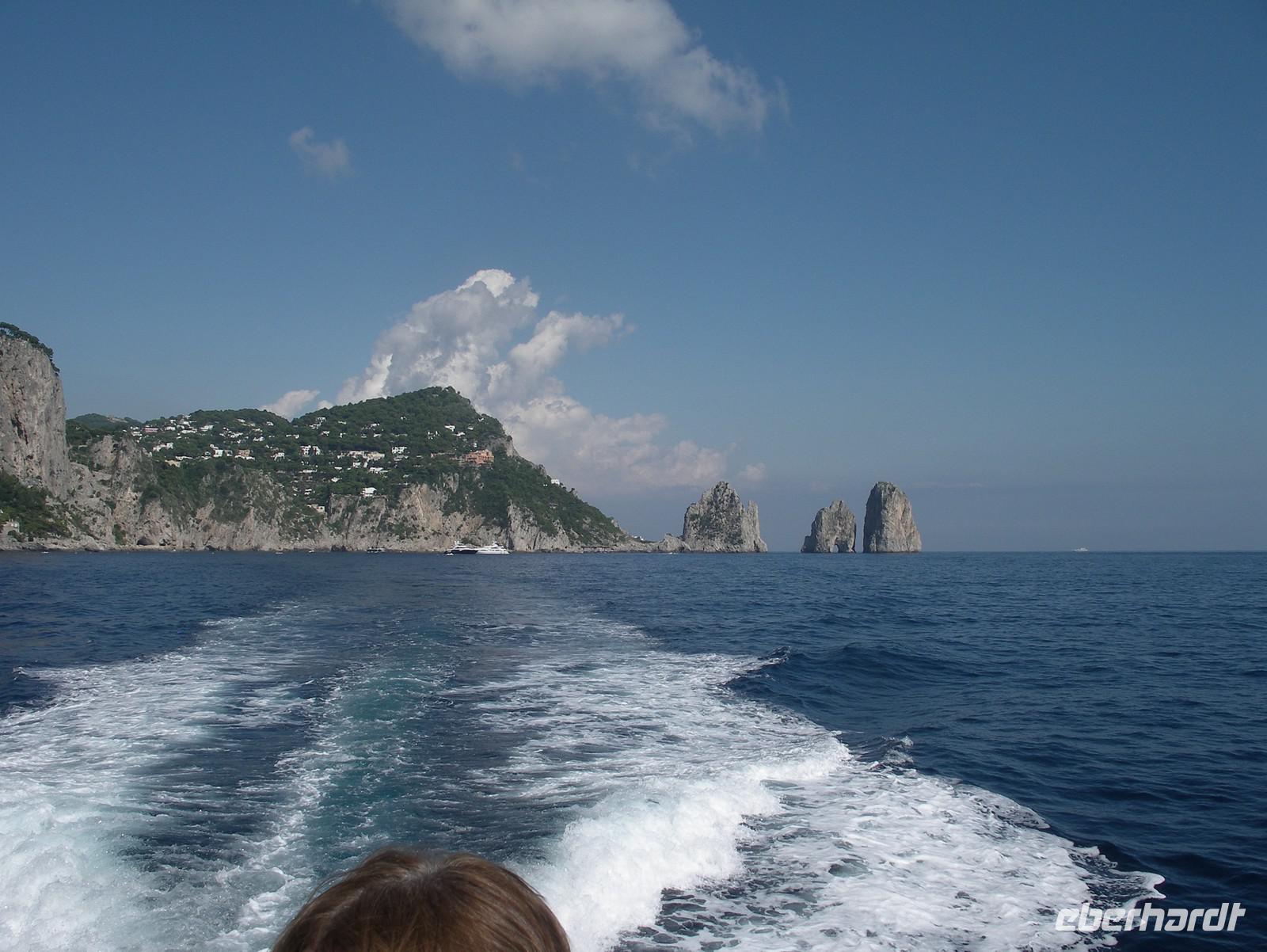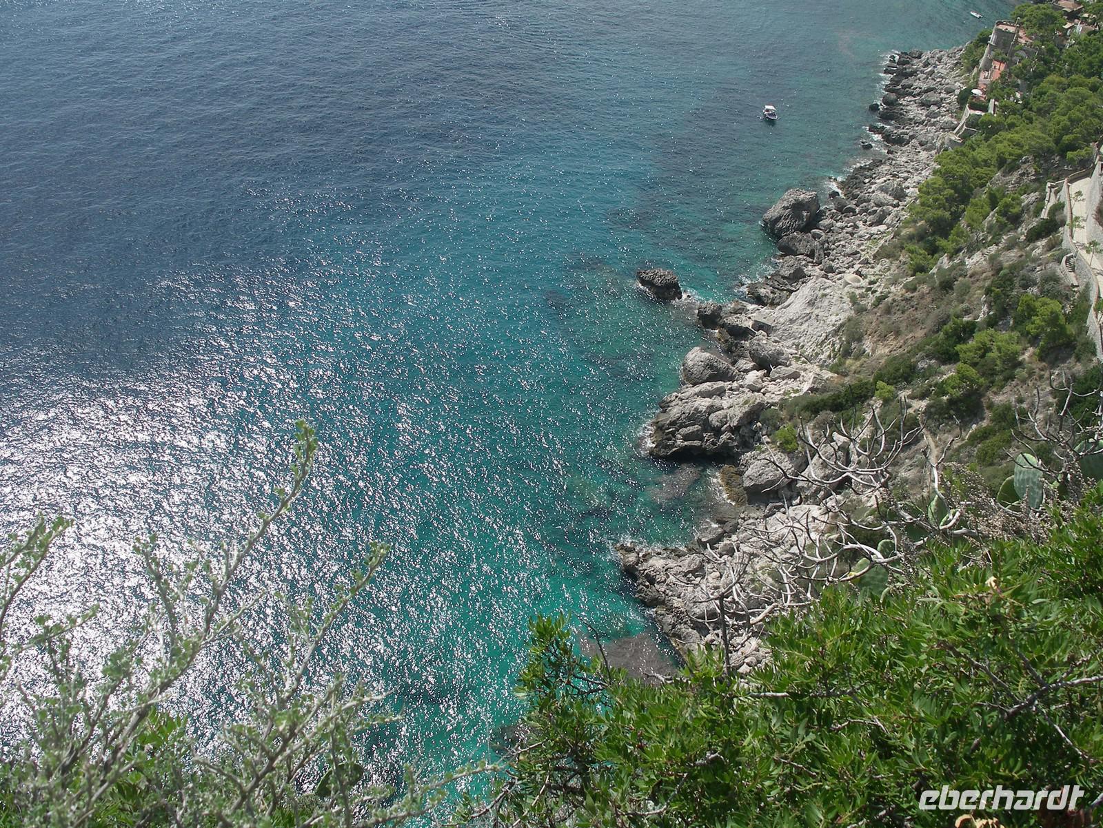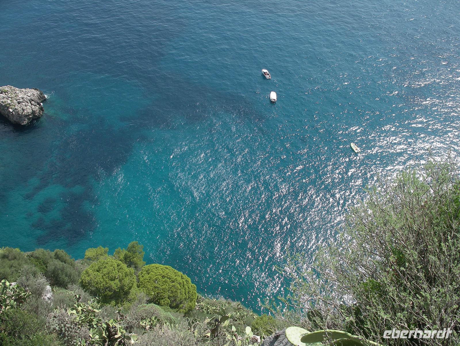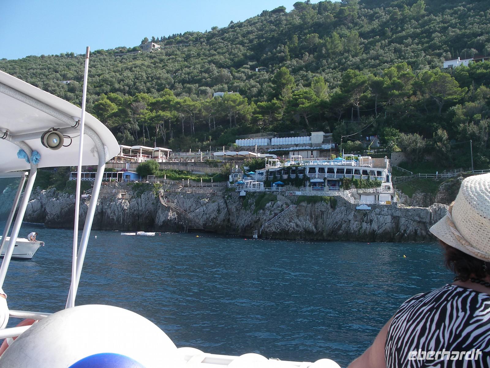 Am Nachmittag folgte noch ein besonderes Erlebnis, eine Bootstour um die Insel. Vom Meer aus kann man erst so richtig die Schönheit der Insel entdecken, die Kalksteinfelsen, die Grotten mit ihren orangefarbenen „Korallen", und wir bewunderten die verschiedenfarbigen Blautöne des Meeres! Die berühmte Blaue Grotte war heute wegen der Wellen geschlossen, aber sie stand sowieso nicht auf unserem Programm, da man oft sehr lange warten muss!