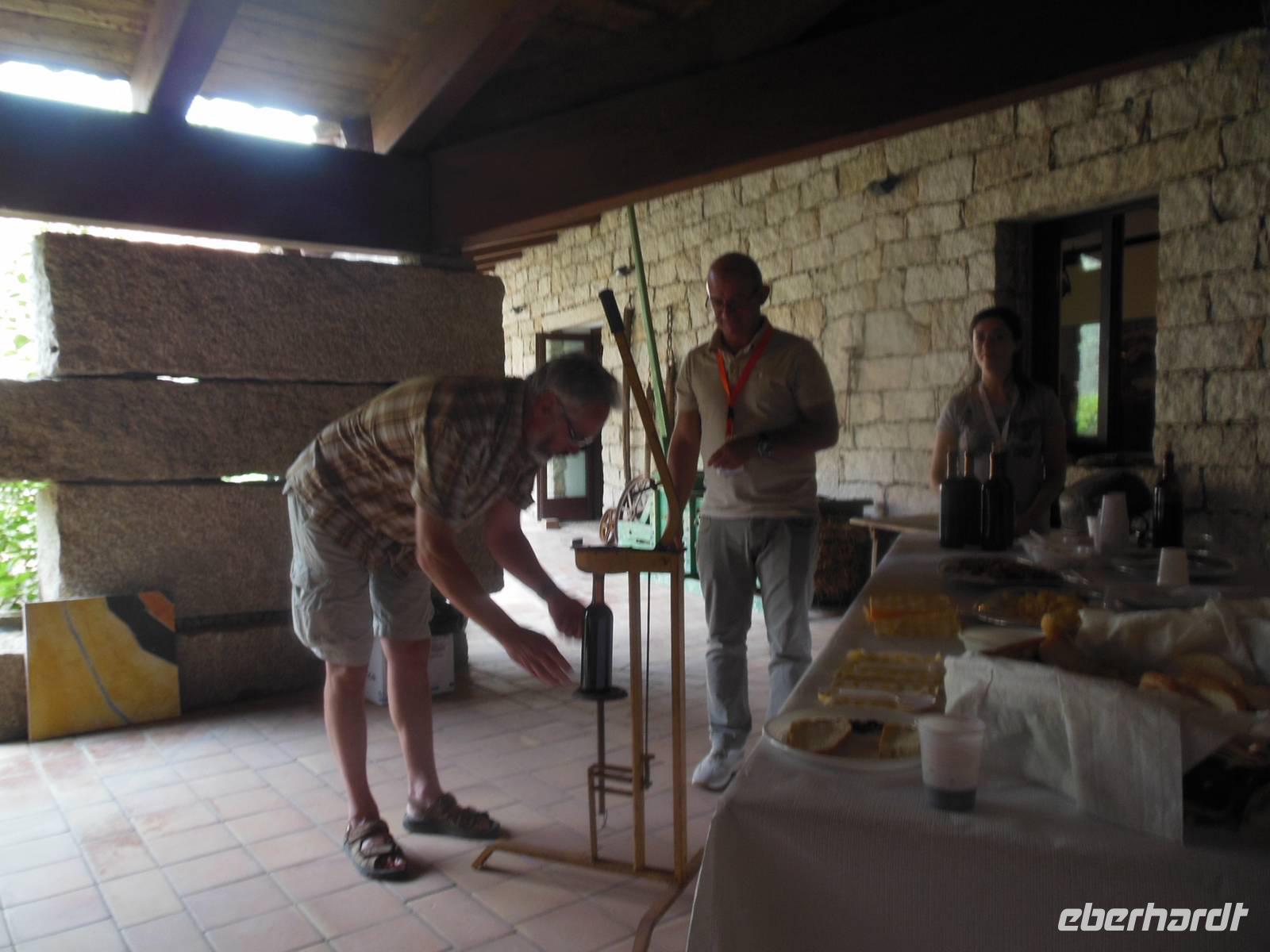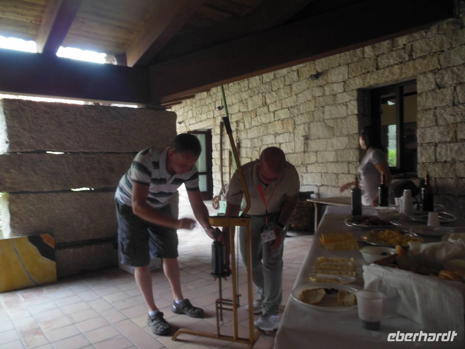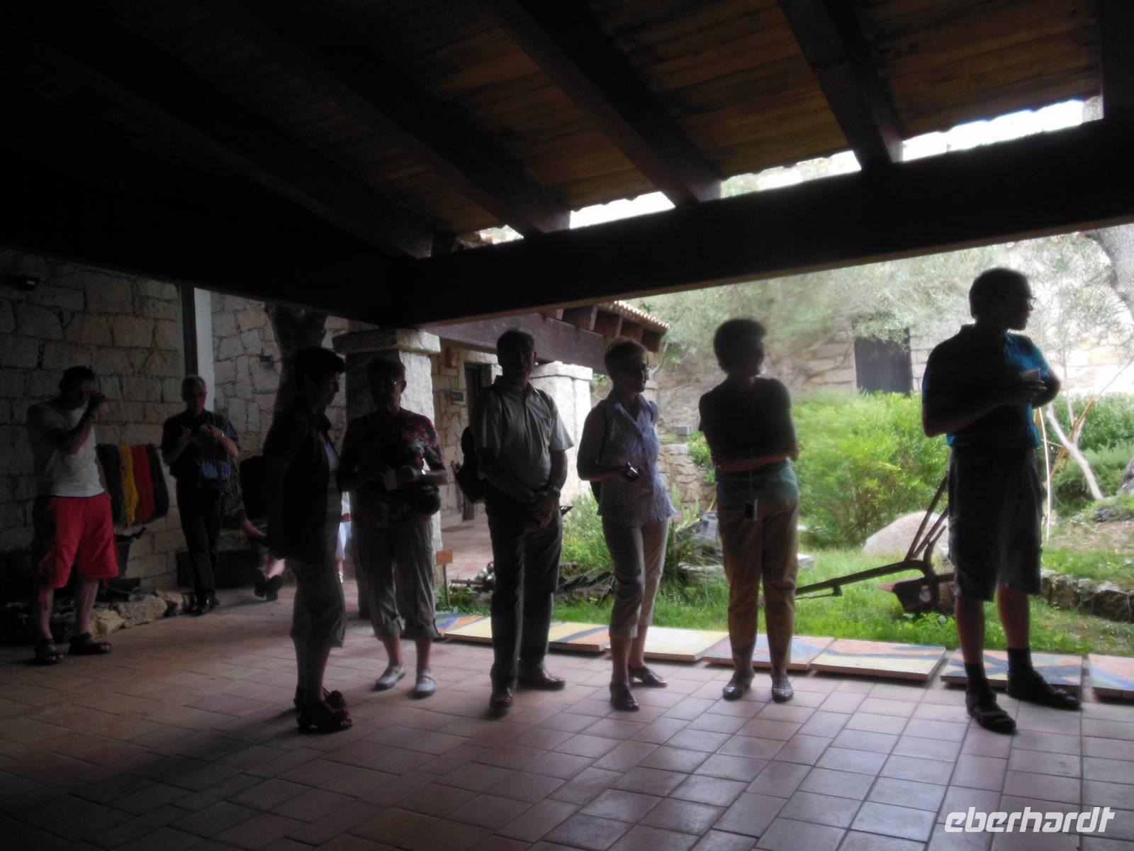 Nachdem wir die Koffer geladen hatten ging es via Sassari nach Castelsardo. Wir fuhren mit dem öffentlichen Shuttle hoch zum Kastell und spazierten oben mit Blick auf die Insel Asinara und auf Korsika herum und besuchten die Santa Maria Kirche, die wegen ihrer „Lunissanti" Prozession bekannt ist. Auf dem weiteren Weg fuhren wir danach beim bekannten Elefantenfelsen vorbei und stoppten natürlich auch hier für Fotos. Danach ging es durch das „Mondtal" via Aggius. Dort erklärte uns Luigi viel über das Dorf von Aggius und im Volkskundemuseum erhielten wir Einblicke in sardische Traditionen und das sardische Handwerk. Im Anschluss an die Führung durften wir einen Rotwein sowie einen typischen sardischen Imbiss geniessen. Und jeder durfte eine Weinflasche selbst verkorken. Das war vielleicht ein Spaß! Danach fuhren wir mit unserem Bus weiter durch die schönen Korkeichenwälder der Gallura nach Tempio-Pausania. Nach einem kurzen Rundgang und Aufenthalt in der Granitstadt fuhren wir über Calanganius, wo die Korkernte gelagert und verarbeitet wird und besuchten eine Korkfabrik. Die Besichtigung war sehr interessant und man konnte sehen was man heuzutage alles so aus Kork produzieren kann. Danach führte uns der Weg zu unserem jetzigen Hotel Airone nach Arzachena/Cannigione. Nachdem wir eingecheckt hatten, begrüßte man uns auch hier mit einem Cocktail und nach einem gemeinsamen 3 Gang Abendessen fielen alle müde ins Bett.