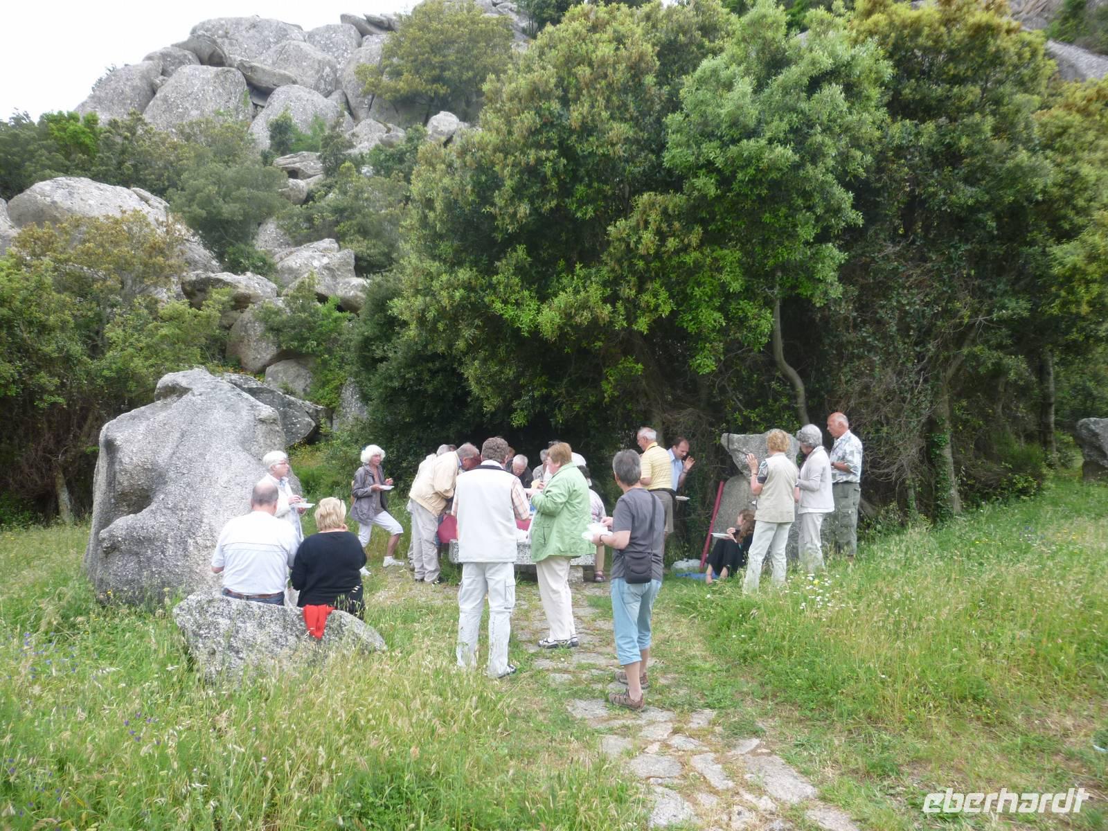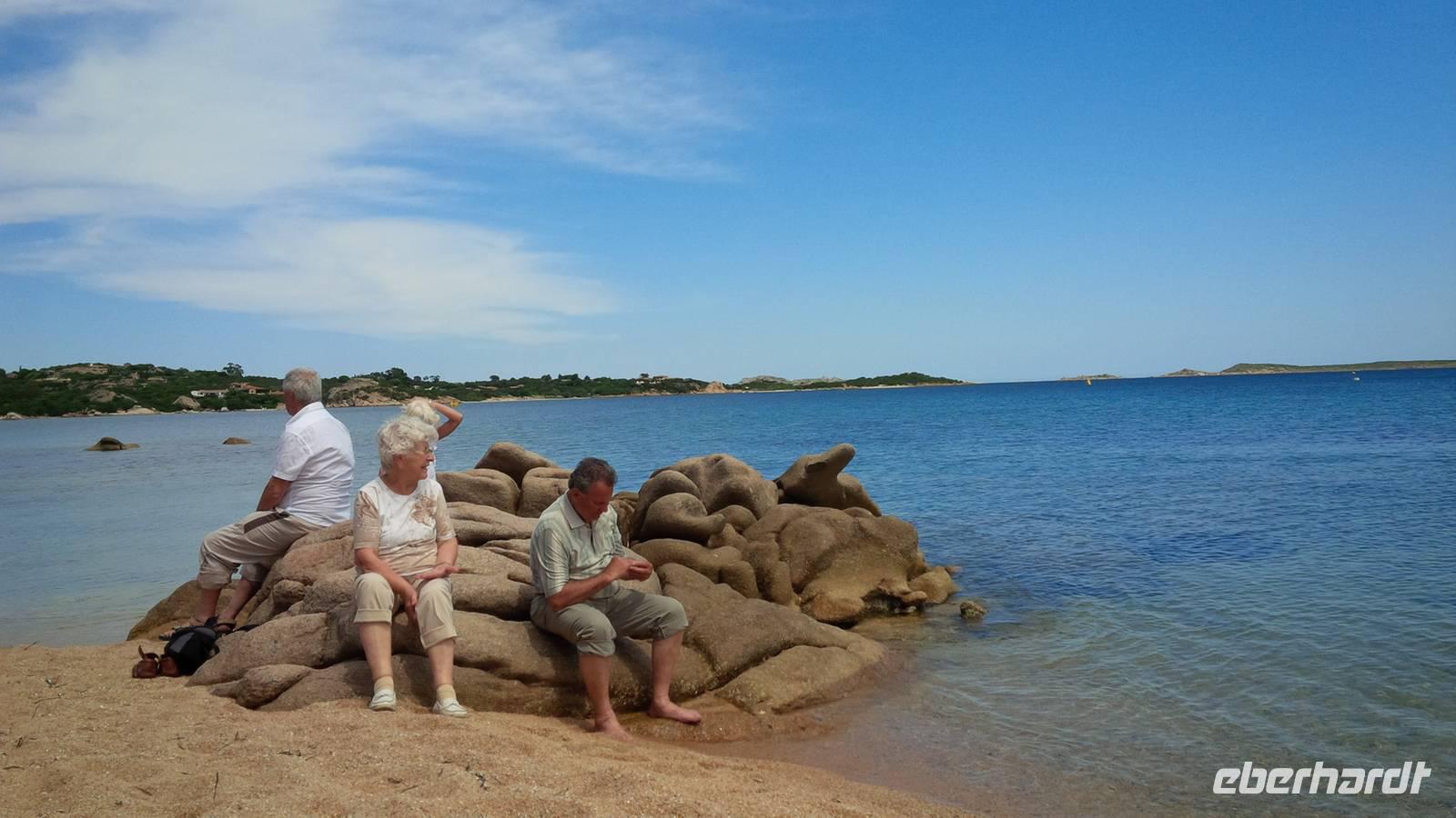 Vormittags fuhren wir zu einem Punkt mit einem klasse Blick auf das La Maddalena Archipel, und seine Umgebung bevor wir weiter mit dem Bus nach Palau und direkt in die Fähre einfuhren, um nach „La Maddalena" überzusetzen. La Maddalena hat als Einzige des Archipels einen städteähnlichen Ausbau mit Gebäuden aus dem 8. Jahrhundert und schöne Gässchen sowie hübsche Geschäfte und eine kleine, aber feine Markthalle. Im Jahr 1996 wurde der gesamte Archipel zum Nationalpark erklärt. Nachdem wir den Ort La Maddalena genossen hatten fuhren wir mit unserem Bus weiter über den Damm Passo della Moneta und auf die Nachbarinsel Caprera, die Ziegeninsel. Diese bewohnte Giuseppe Garibaldi bis zu seinem Tod im Jahr 1882. Nach einem kleinen Aufenthalt ging es zurück zur Insel La Maddalena und wir fuhren diese einmal ab, vorbei an schönen Buchten, hinauf zum „Guardia Vecchia" mit Aussicht auf La Maddalena Ort und weiter vorbei an der „Höllenbucht". Hier stiegen wir aus und es gab einen kleinen Umtrunk „Schnaps und Likör". Gemütlich und mit ausgelassener Stimmung fuhren wir zu einem wunderschönen Strand und badeten an der Sonne und im Meer. Nachmittags fuhren wir wieder zum Hafen von La Maddalena und setzten wieder über nach Palau. Von hier aus fuhren wir weiter zum Gigantengrab der Nuraghenkultur „Coddu Vecchiu". Mario führte uns und erklärte uns alles was wir wissen wollten zu dieser bekannten Grabstätte. Es war sehr interessant, was wir hier über die Nuragher erfahren konnten. Ein kurzer Schwenker führte uns noch nach Baia Sardinia vor Rückkehr ins unser schönes Hotel. Ein 4-Gang-Abendessen rundete den Tag ab.