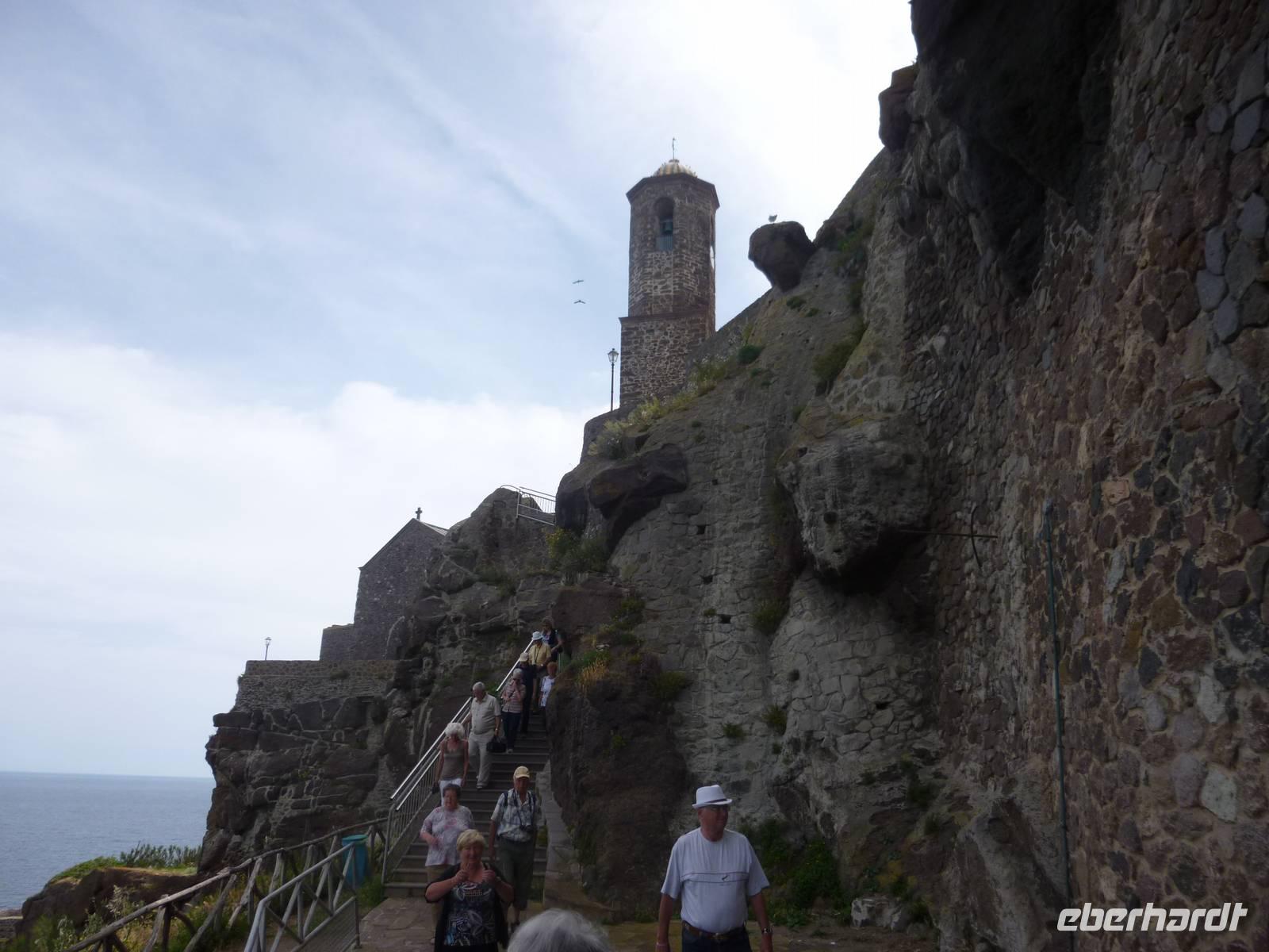 Wir fuhren gemütlich am Vormittag nach Alghero und unternahmen zuerst die Bootsfahrt zu den Nepungrotten am Capa Cacchia. Die Tropfsteinhöhle ist ein wahres Naturwunder, welches sich über 2.500 Meter lang ausstreckt. Direkt von Alghero fährt das Schiff in knapp einer dreiviertel-Stunde zum Eingang der Grotte. Zuerst war die See ganz ruhig, doch kaum waren wir bei den Grotten, wurde sie unruhig. Dennoch konnten wir aussteigen und die Grotte besichtigen. Die Fahrt führte uns entlang der Korallenküste, die sehr beeindruckend ist. In der Grotte befindet sich unter unendlich vielen Stalagmiten und Stalagtiten ein 120 Meter langer Salzwassersee, der mit dem Meer verbunden ist. Danach machten wir einen Spaziergang durch Alghero und in der Freizeit nahmen sich Viele Zeit für einen „Mittagsnack" oder Kaffee und Shopping bevor wir am Nachmittag wieder zu unserem Hotel zurückkehrten, wo wir vor dem Abendessen inmitten einer sardischen Hochzeit landeten.