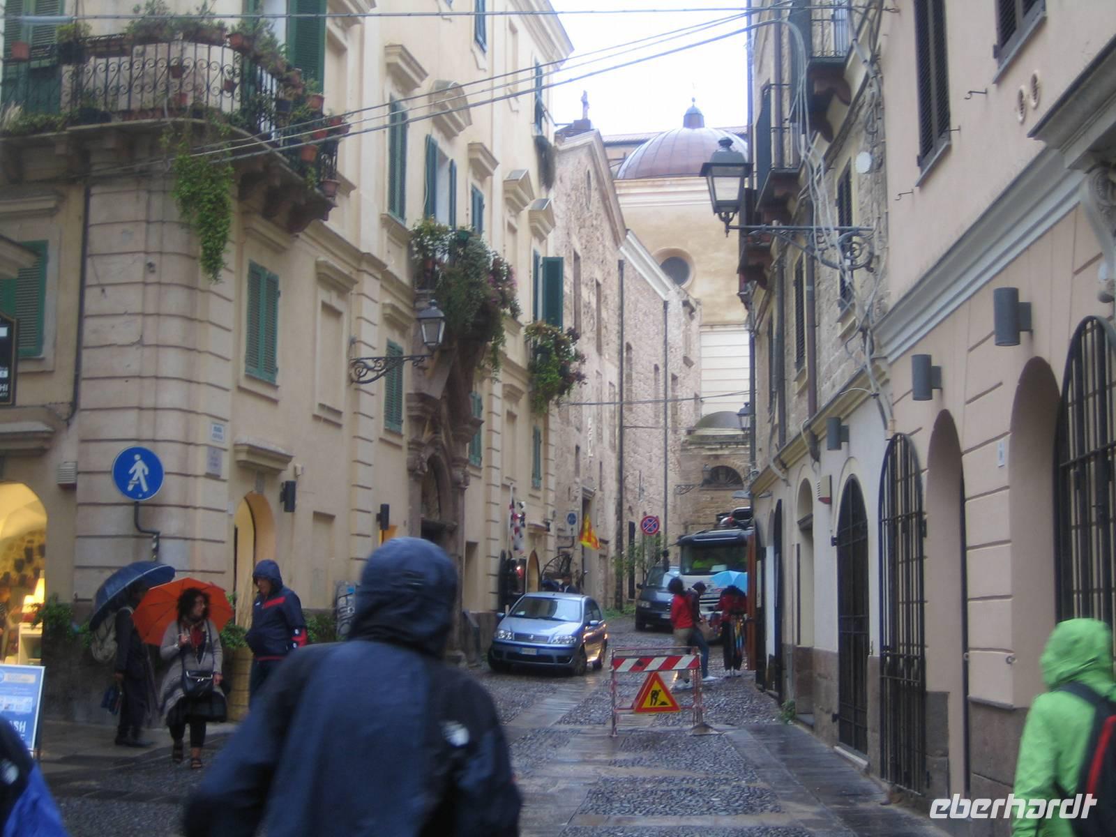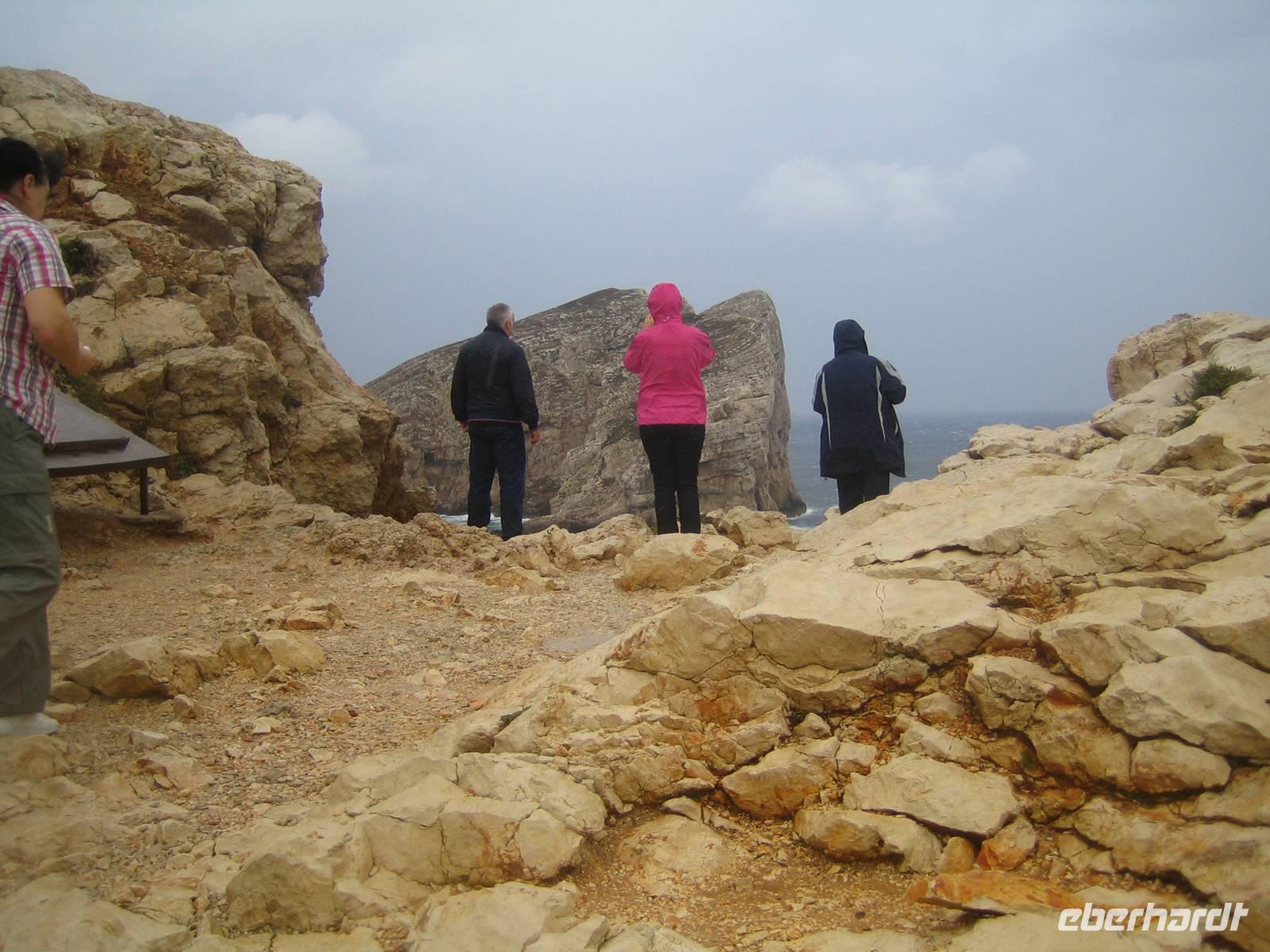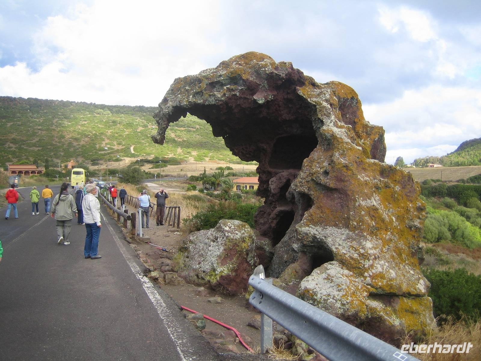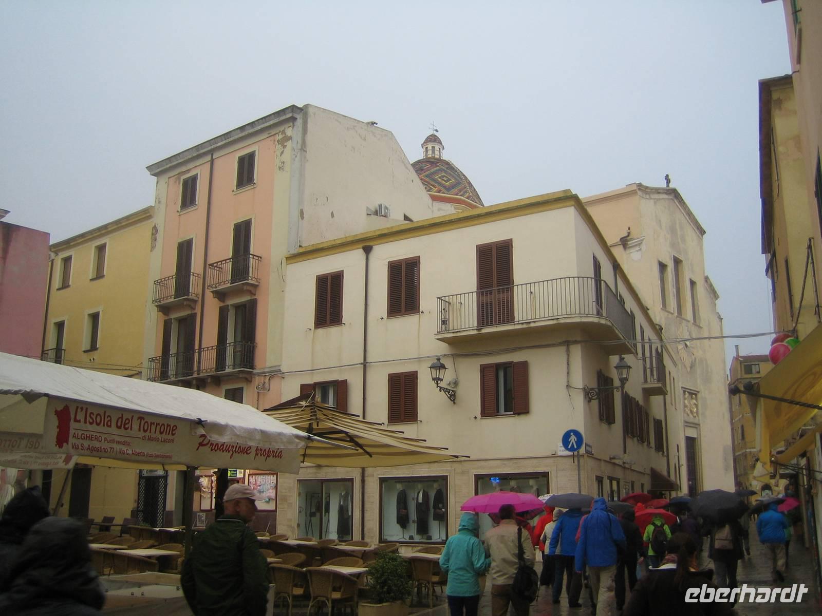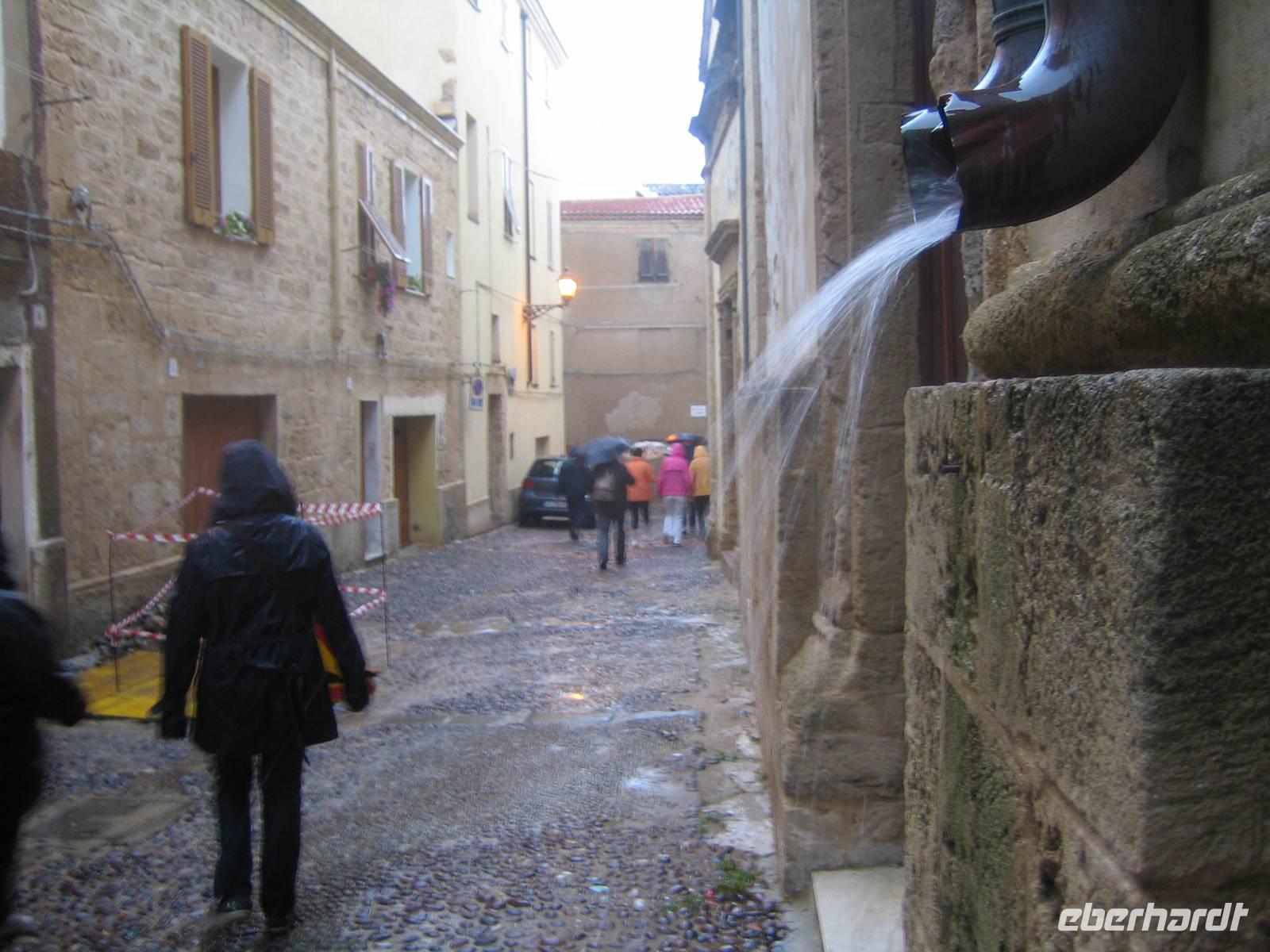 Es hatte die ganze Nacht gestürmt, der Morgen empfängt uns mit strömendem Regen und starkem Wind. Für die großen Städte des Nordens ist Flutalarm ausgerufen und viele Straßennetze sind gesperrt. Kleine Bäche verwandeln sich in reißende Ungeheuer und wir fragen uns, ob wir unseren Ausflug heute überhaupt durchführen können. Rebecca kennt den sardischen Wetterbericht wie ihre Jackentasche und so findet sie den einzigen Ort in ganz Sardinien, in dem es heute nicht regnet: Castelsardo. Wir zaudern nicht und fahren gleich nach dem Frühstück los. Mit uns reist heute die Wandergruppe, denn für sie ist der Sturm zu gefährlich zum Wandern. Nach einer Stunde Fahrt werden wir von einem Regenbogen begleitet, der sich über Artischocken- und Melonenfelder spannt. Die Haupteinnahmequelle im Norden Sardiniens ist jedoch nicht die Landwirtschaft, sondern die Hummerfischerei, der Mittelmeerhummer ist sehr begehrt. Kurz vor Castelsardo halten wir an einem bizarren Elefantenfelsen und da es schon hier nicht mehr regnet, können wir ihn im Lichte besehen und fotografieren. Wieder halten wir am Eingang zum Ort, gehen zu Fuß in die Stadt. Castelsardo ist ein Ort rund um eine mittelalterliche Burg, die in den Lavastein hinein gebaut wurde. Die Burg wurde bis 1939 ununterbrochen genutzt und dabei auch immer instand gehalten. Die Stadt hat heute siebentausend Einwohner. Bei einer Einwohnerzahl von 1,6 Millionen Menschen in ganz Sardinien ist das ziemlich viel. Von der Unterstadt wandern wir hinauf zur oberen Stadt und durchstreifen die historischen Straßen. Rebecca erklärt uns so viel zur Geschichte und zum Alltag von Castelsardo, dass wir immer neugieriger werden. Zum Mittag verweilen wir im „Cafe´de Paris" und fahren dann über eine wilde, felsige Bucht des Capo Caccia weiter nach Alghero. Auch diese Stadt möchten wir sehen und lassen uns von dem windigen Regensturm nicht davon abhalten. Doch ob uns nach unserer Rückkehr jemand glauben wird, dass wir auf einer Mittelmeerinsel waren? Die Fotos sehen ganz anders aus.