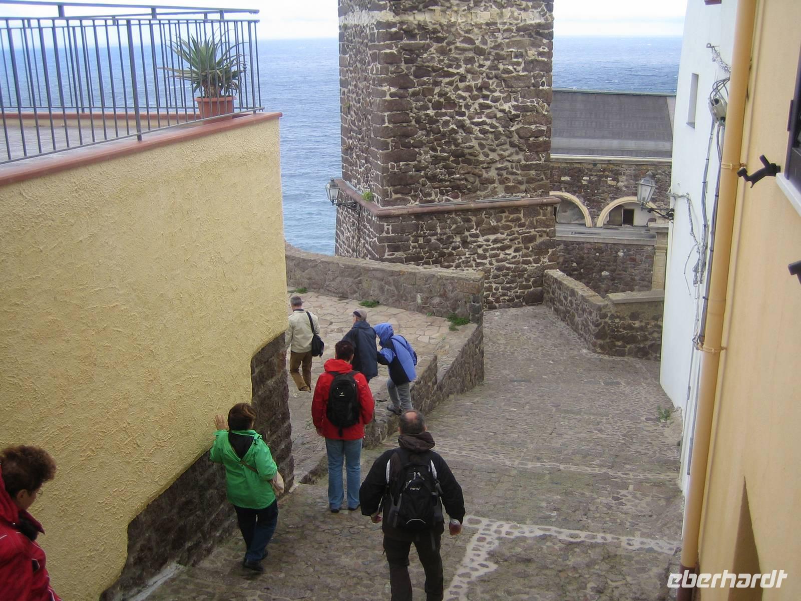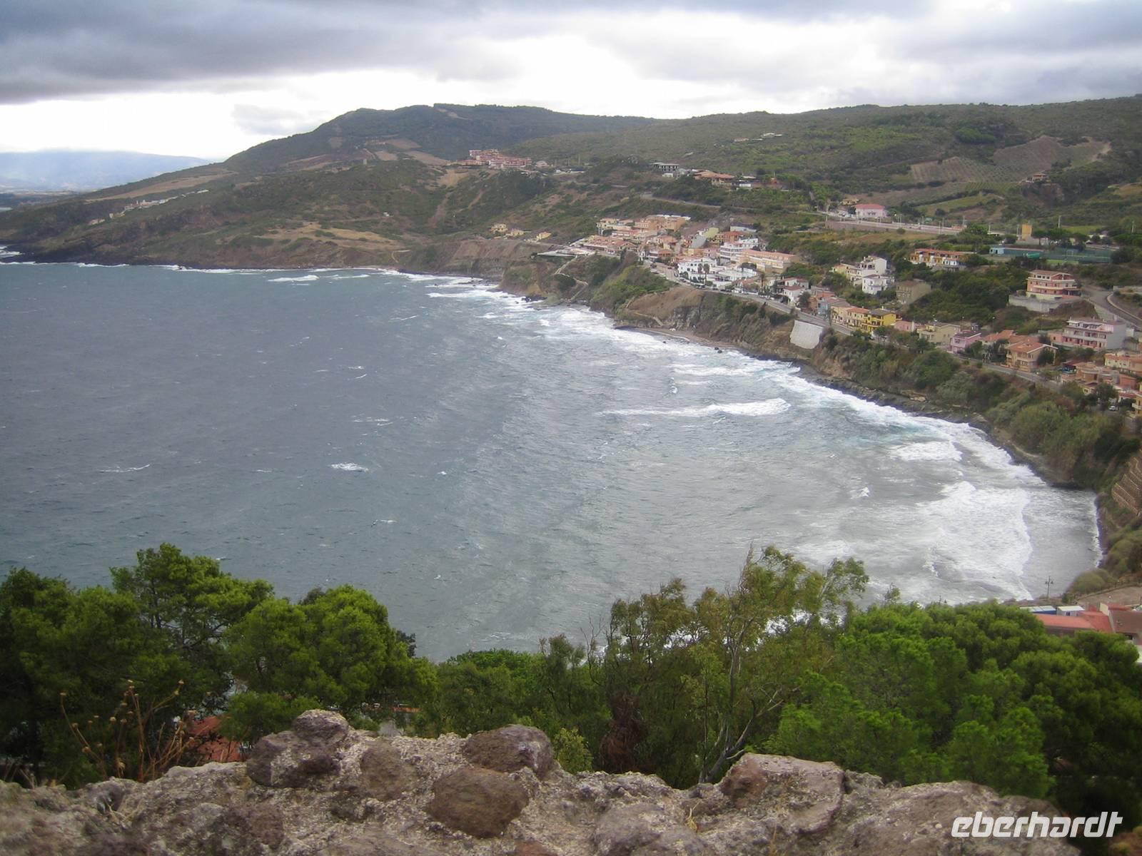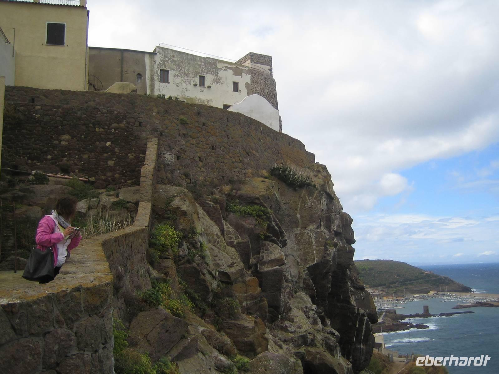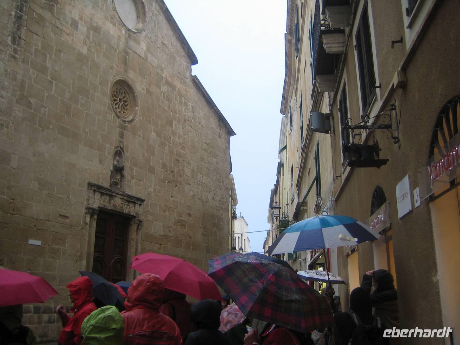 Es hatte die ganze Nacht gestürmt, der Morgen empfängt uns mit strömendem Regen und starkem Wind. Für die großen Städte des Nordens ist Flutalarm ausgerufen und viele Straßennetze sind gesperrt. Kleine Bäche verwandeln sich in reißende Ungeheuer und wir fragen uns, ob wir unseren Ausflug heute überhaupt durchführen können. Rebecca kennt den sardischen Wetterbericht wie ihre Jackentasche und so findet sie den einzigen Ort in ganz Sardinien, in dem es heute nicht regnet: Castelsardo. Wir zaudern nicht und fahren gleich nach dem Frühstück los. Mit uns reist heute die Wandergruppe, denn für sie ist der Sturm zu gefährlich zum Wandern. Nach einer Stunde Fahrt werden wir von einem Regenbogen begleitet, der sich über Artischocken- und Melonenfelder spannt. Die Haupteinnahmequelle im Norden Sardiniens ist jedoch nicht die Landwirtschaft, sondern die Hummerfischerei, der Mittelmeerhummer ist sehr begehrt. Kurz vor Castelsardo halten wir an einem bizarren Elefantenfelsen und da es schon hier nicht mehr regnet, können wir ihn im Lichte besehen und fotografieren. Wieder halten wir am Eingang zum Ort, gehen zu Fuß in die Stadt. Castelsardo ist ein Ort rund um eine mittelalterliche Burg, die in den Lavastein hinein gebaut wurde. Die Burg wurde bis 1939 ununterbrochen genutzt und dabei auch immer instand gehalten. Die Stadt hat heute siebentausend Einwohner. Bei einer Einwohnerzahl von 1,6 Millionen Menschen in ganz Sardinien ist das ziemlich viel. Von der Unterstadt wandern wir hinauf zur oberen Stadt und durchstreifen die historischen Straßen. Rebecca erklärt uns so viel zur Geschichte und zum Alltag von Castelsardo, dass wir immer neugieriger werden. Zum Mittag verweilen wir im „Cafe´de Paris" und fahren dann über eine wilde, felsige Bucht des Capo Caccia weiter nach Alghero. Auch diese Stadt möchten wir sehen und lassen uns von dem windigen Regensturm nicht davon abhalten. Doch ob uns nach unserer Rückkehr jemand glauben wird, dass wir auf einer Mittelmeerinsel waren? Die Fotos sehen ganz anders aus.