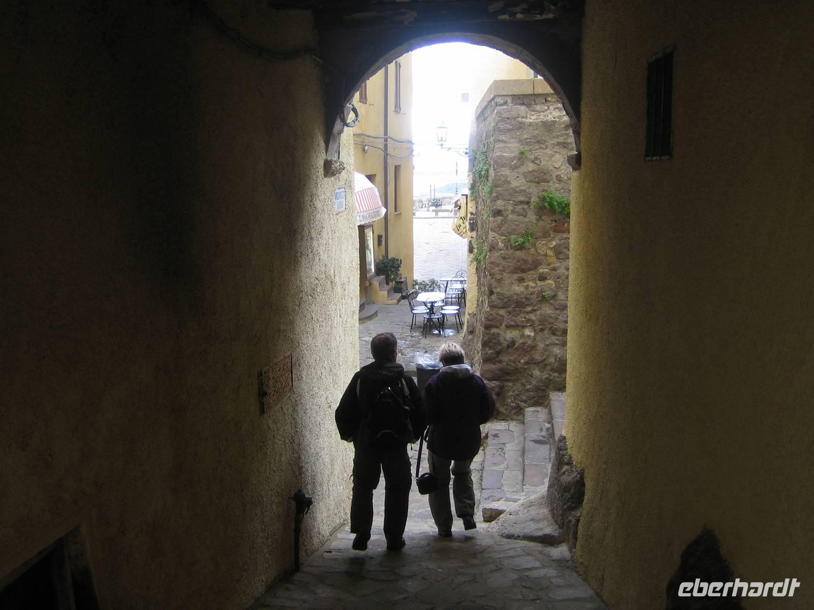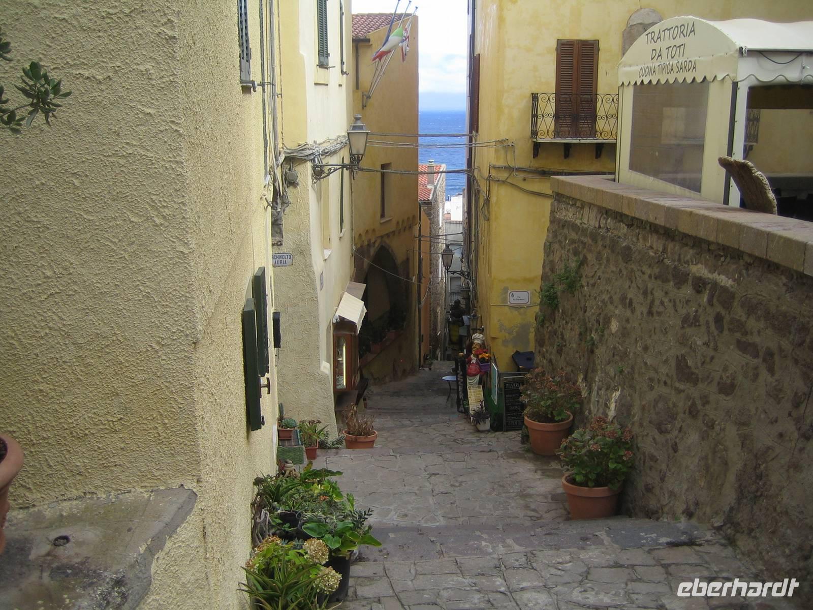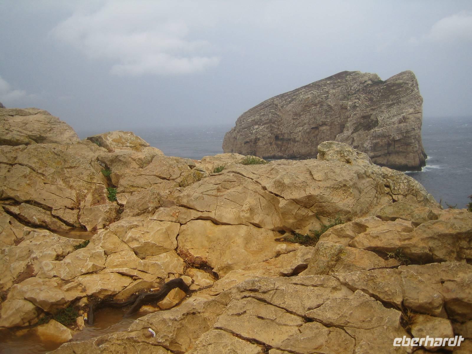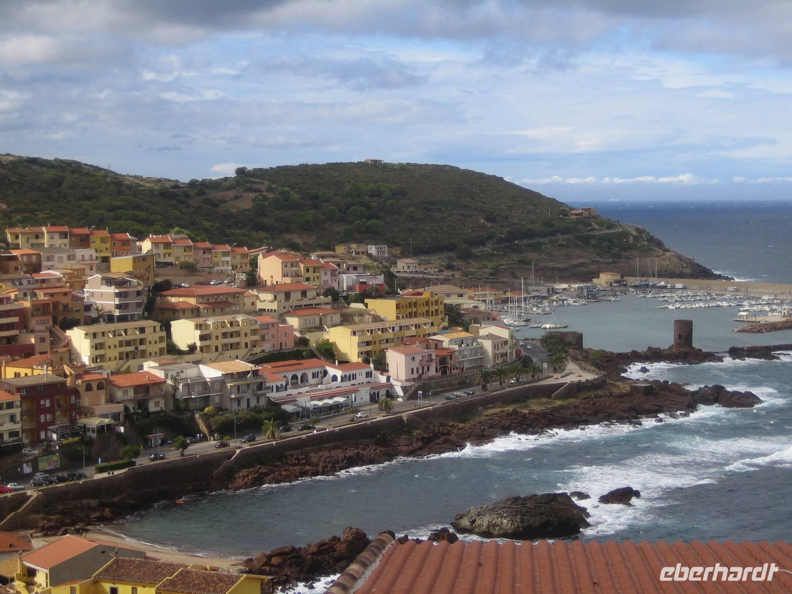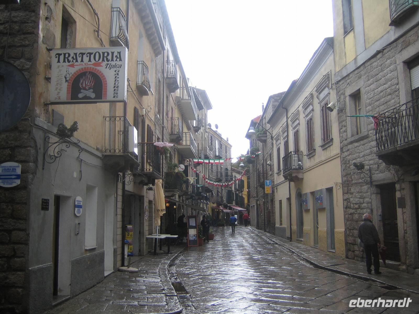 Es hatte die ganze Nacht gestürmt, der Morgen empfängt uns mit strömendem Regen und starkem Wind. Für die großen Städte des Nordens ist Flutalarm ausgerufen und viele Straßennetze sind gesperrt. Kleine Bäche verwandeln sich in reißende Ungeheuer und wir fragen uns, ob wir unseren Ausflug heute überhaupt durchführen können. Rebecca kennt den sardischen Wetterbericht wie ihre Jackentasche und so findet sie den einzigen Ort in ganz Sardinien, in dem es heute nicht regnet: Castelsardo. Wir zaudern nicht und fahren gleich nach dem Frühstück los. Mit uns reist heute die Wandergruppe, denn für sie ist der Sturm zu gefährlich zum Wandern. Nach einer Stunde Fahrt werden wir von einem Regenbogen begleitet, der sich über Artischocken- und Melonenfelder spannt. Die Haupteinnahmequelle im Norden Sardiniens ist jedoch nicht die Landwirtschaft, sondern die Hummerfischerei, der Mittelmeerhummer ist sehr begehrt. Kurz vor Castelsardo halten wir an einem bizarren Elefantenfelsen und da es schon hier nicht mehr regnet, können wir ihn im Lichte besehen und fotografieren. Wieder halten wir am Eingang zum Ort, gehen zu Fuß in die Stadt. Castelsardo ist ein Ort rund um eine mittelalterliche Burg, die in den Lavastein hinein gebaut wurde. Die Burg wurde bis 1939 ununterbrochen genutzt und dabei auch immer instand gehalten. Die Stadt hat heute siebentausend Einwohner. Bei einer Einwohnerzahl von 1,6 Millionen Menschen in ganz Sardinien ist das ziemlich viel. Von der Unterstadt wandern wir hinauf zur oberen Stadt und durchstreifen die historischen Straßen. Rebecca erklärt uns so viel zur Geschichte und zum Alltag von Castelsardo, dass wir immer neugieriger werden. Zum Mittag verweilen wir im „Cafe´de Paris" und fahren dann über eine wilde, felsige Bucht des Capo Caccia weiter nach Alghero. Auch diese Stadt möchten wir sehen und lassen uns von dem windigen Regensturm nicht davon abhalten. Doch ob uns nach unserer Rückkehr jemand glauben wird, dass wir auf einer Mittelmeerinsel waren? Die Fotos sehen ganz anders aus.