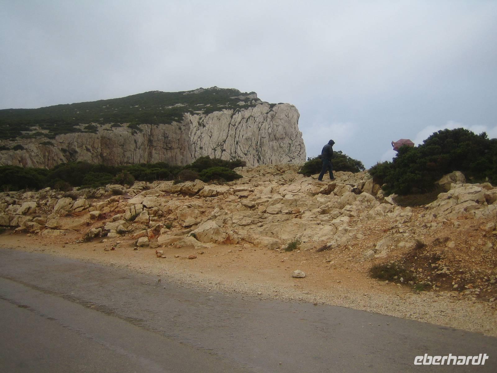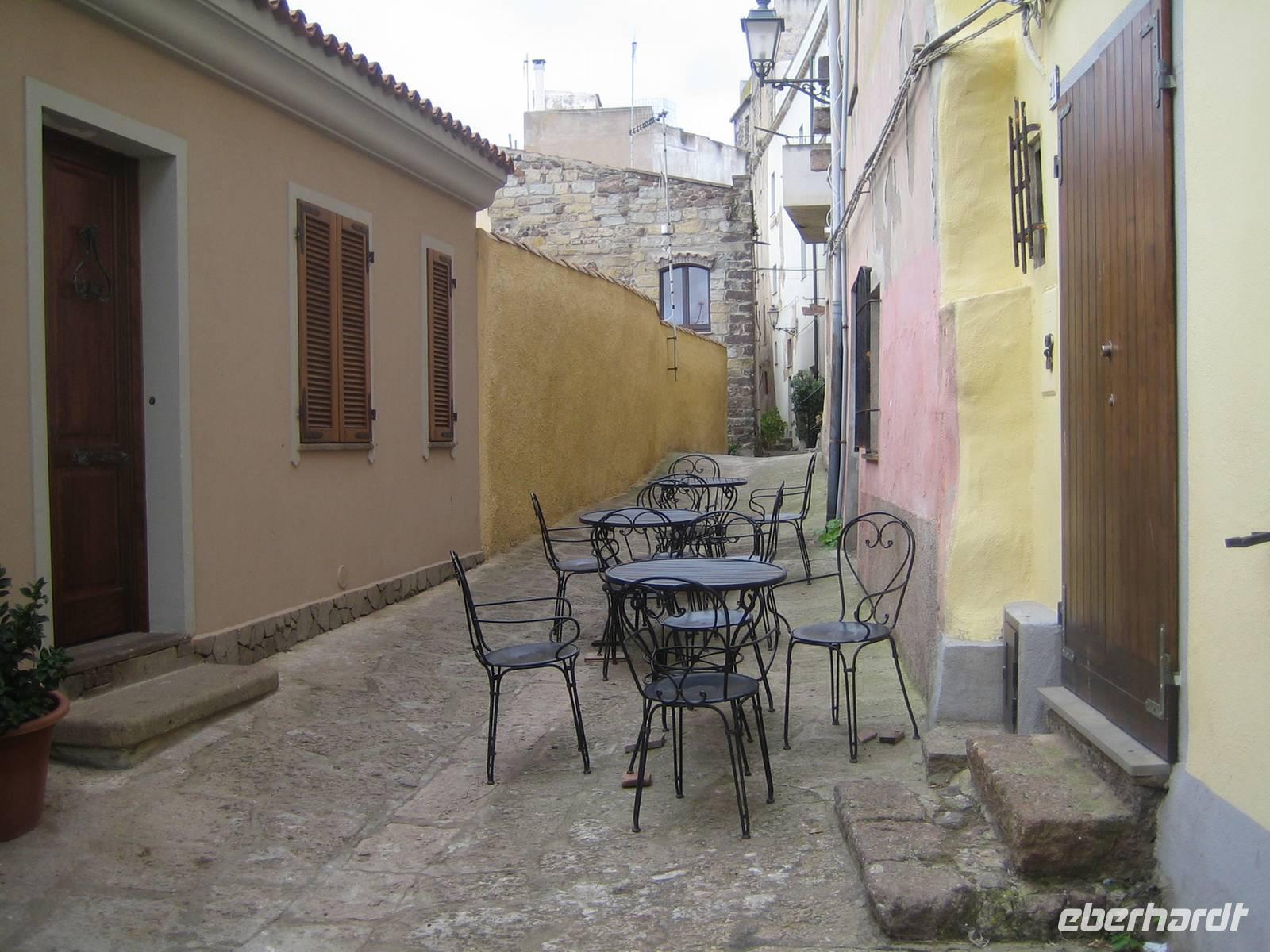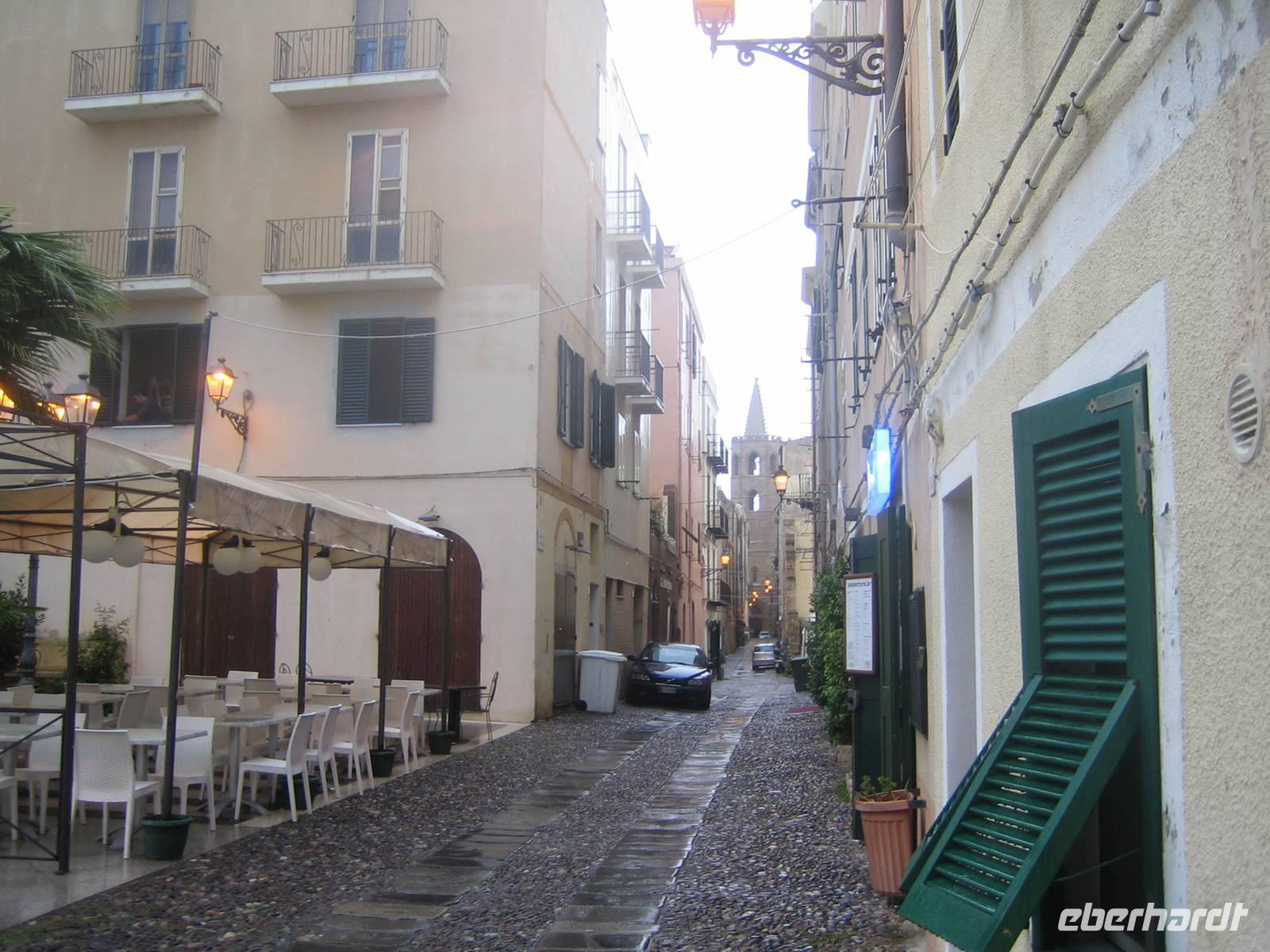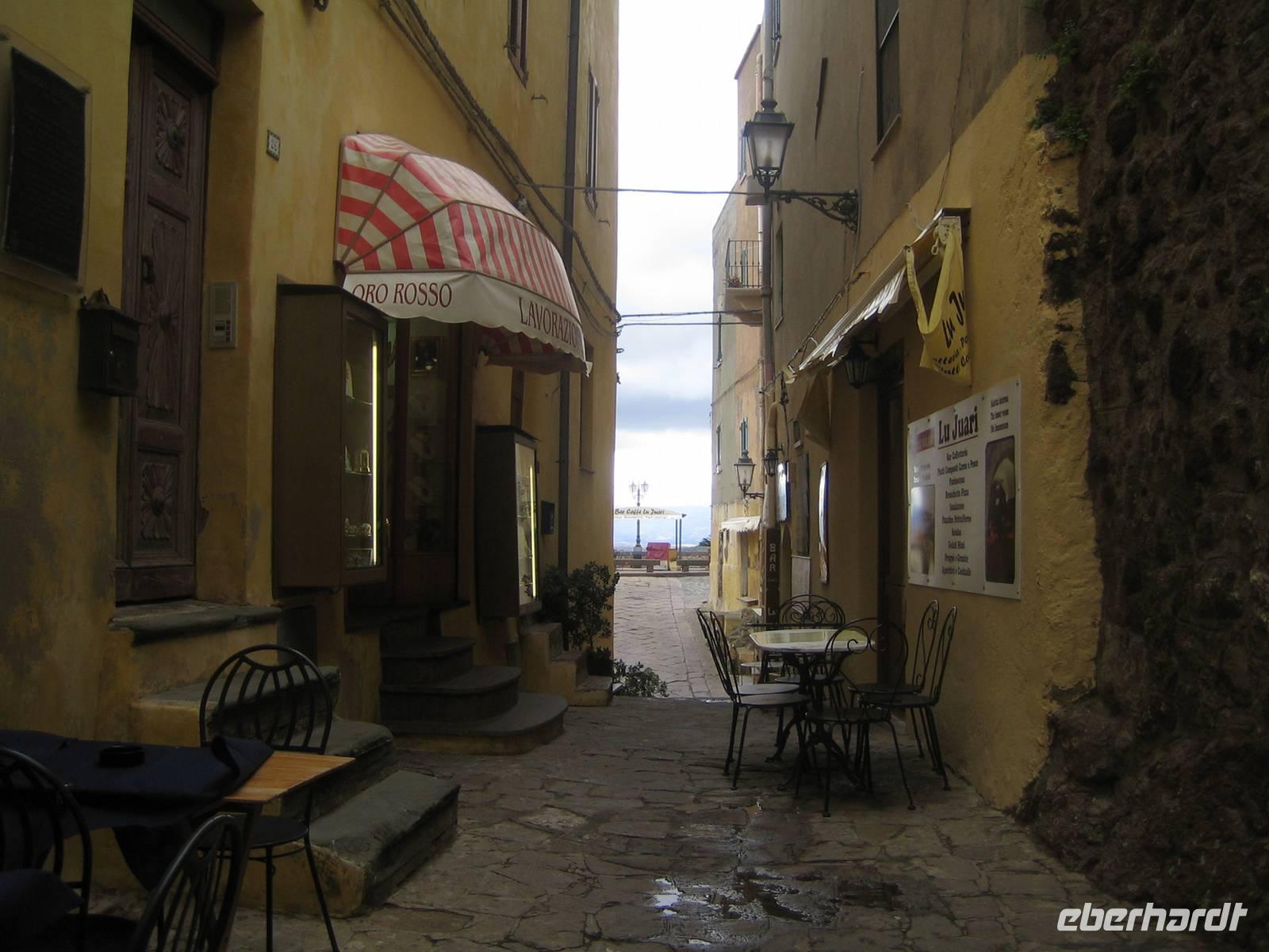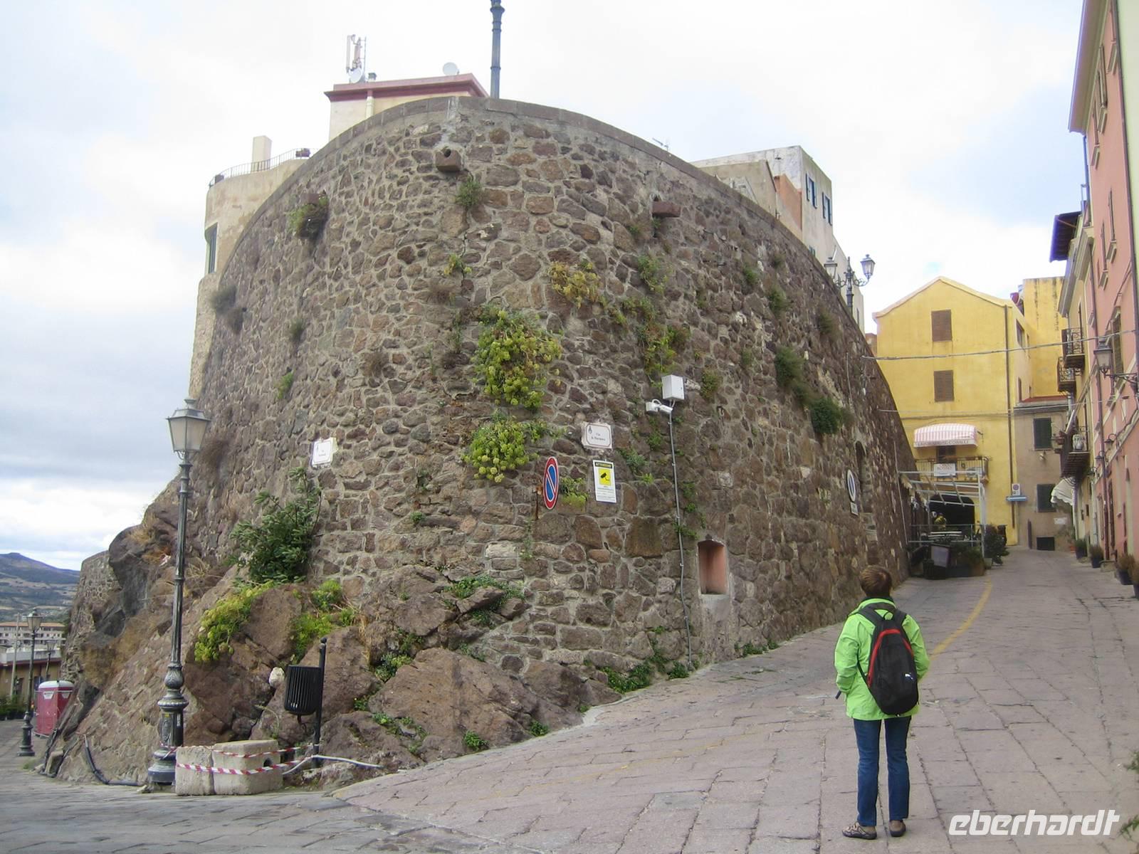 Es hatte die ganze Nacht gestürmt, der Morgen empfängt uns mit strömendem Regen und starkem Wind. Für die großen Städte des Nordens ist Flutalarm ausgerufen und viele Straßennetze sind gesperrt. Kleine Bäche verwandeln sich in reißende Ungeheuer und wir fragen uns, ob wir unseren Ausflug heute überhaupt durchführen können. Rebecca kennt den sardischen Wetterbericht wie ihre Jackentasche und so findet sie den einzigen Ort in ganz Sardinien, in dem es heute nicht regnet: Castelsardo. Wir zaudern nicht und fahren gleich nach dem Frühstück los. Mit uns reist heute die Wandergruppe, denn für sie ist der Sturm zu gefährlich zum Wandern. Nach einer Stunde Fahrt werden wir von einem Regenbogen begleitet, der sich über Artischocken- und Melonenfelder spannt. Die Haupteinnahmequelle im Norden Sardiniens ist jedoch nicht die Landwirtschaft, sondern die Hummerfischerei, der Mittelmeerhummer ist sehr begehrt. Kurz vor Castelsardo halten wir an einem bizarren Elefantenfelsen und da es schon hier nicht mehr regnet, können wir ihn im Lichte besehen und fotografieren. Wieder halten wir am Eingang zum Ort, gehen zu Fuß in die Stadt. Castelsardo ist ein Ort rund um eine mittelalterliche Burg, die in den Lavastein hinein gebaut wurde. Die Burg wurde bis 1939 ununterbrochen genutzt und dabei auch immer instand gehalten. Die Stadt hat heute siebentausend Einwohner. Bei einer Einwohnerzahl von 1,6 Millionen Menschen in ganz Sardinien ist das ziemlich viel. Von der Unterstadt wandern wir hinauf zur oberen Stadt und durchstreifen die historischen Straßen. Rebecca erklärt uns so viel zur Geschichte und zum Alltag von Castelsardo, dass wir immer neugieriger werden. Zum Mittag verweilen wir im „Cafe´de Paris" und fahren dann über eine wilde, felsige Bucht des Capo Caccia weiter nach Alghero. Auch diese Stadt möchten wir sehen und lassen uns von dem windigen Regensturm nicht davon abhalten. Doch ob uns nach unserer Rückkehr jemand glauben wird, dass wir auf einer Mittelmeerinsel waren? Die Fotos sehen ganz anders aus.