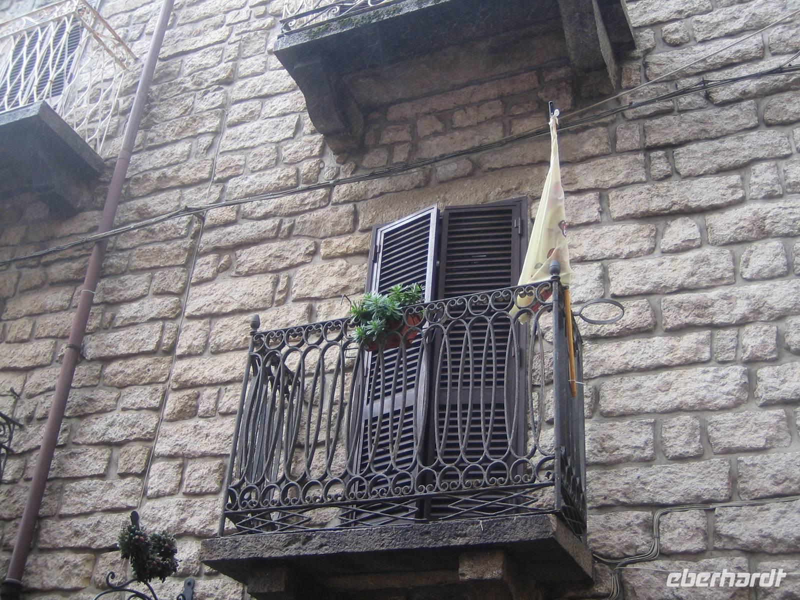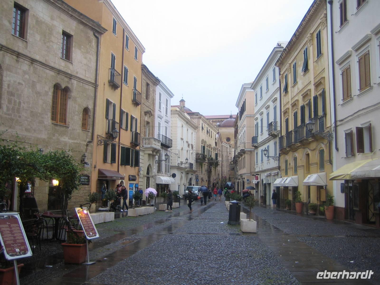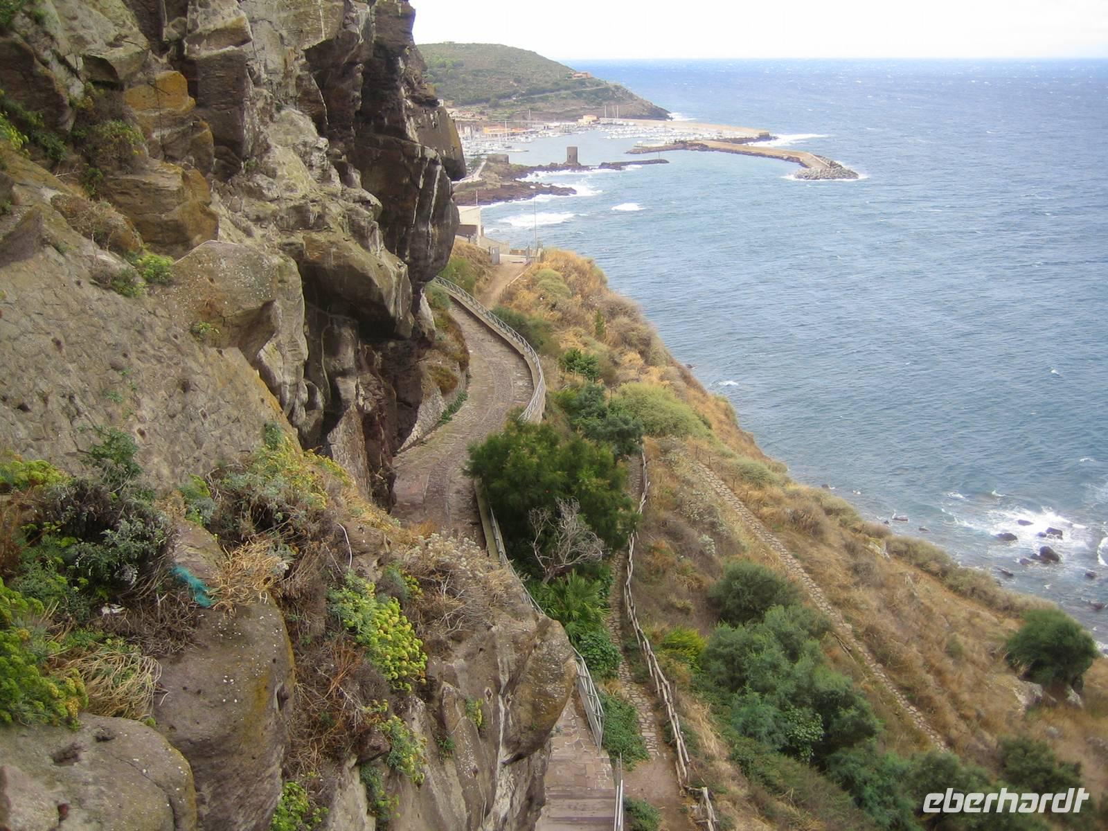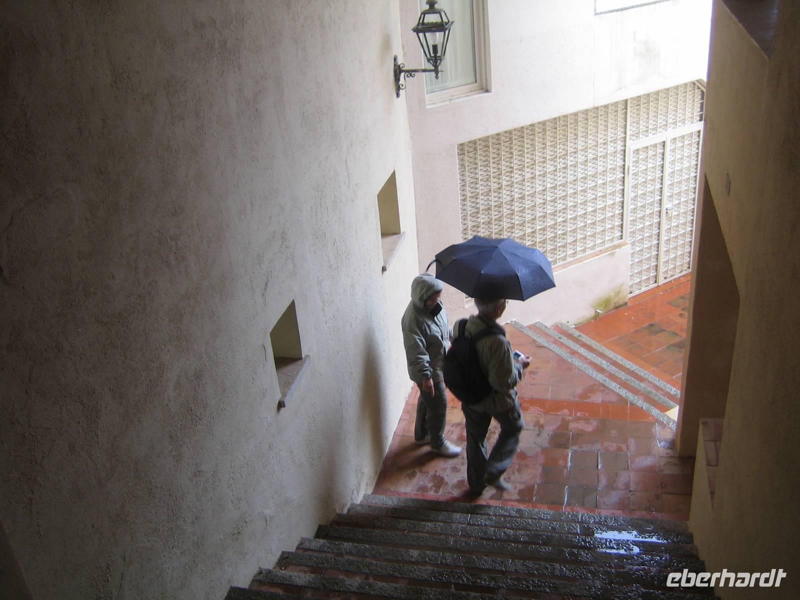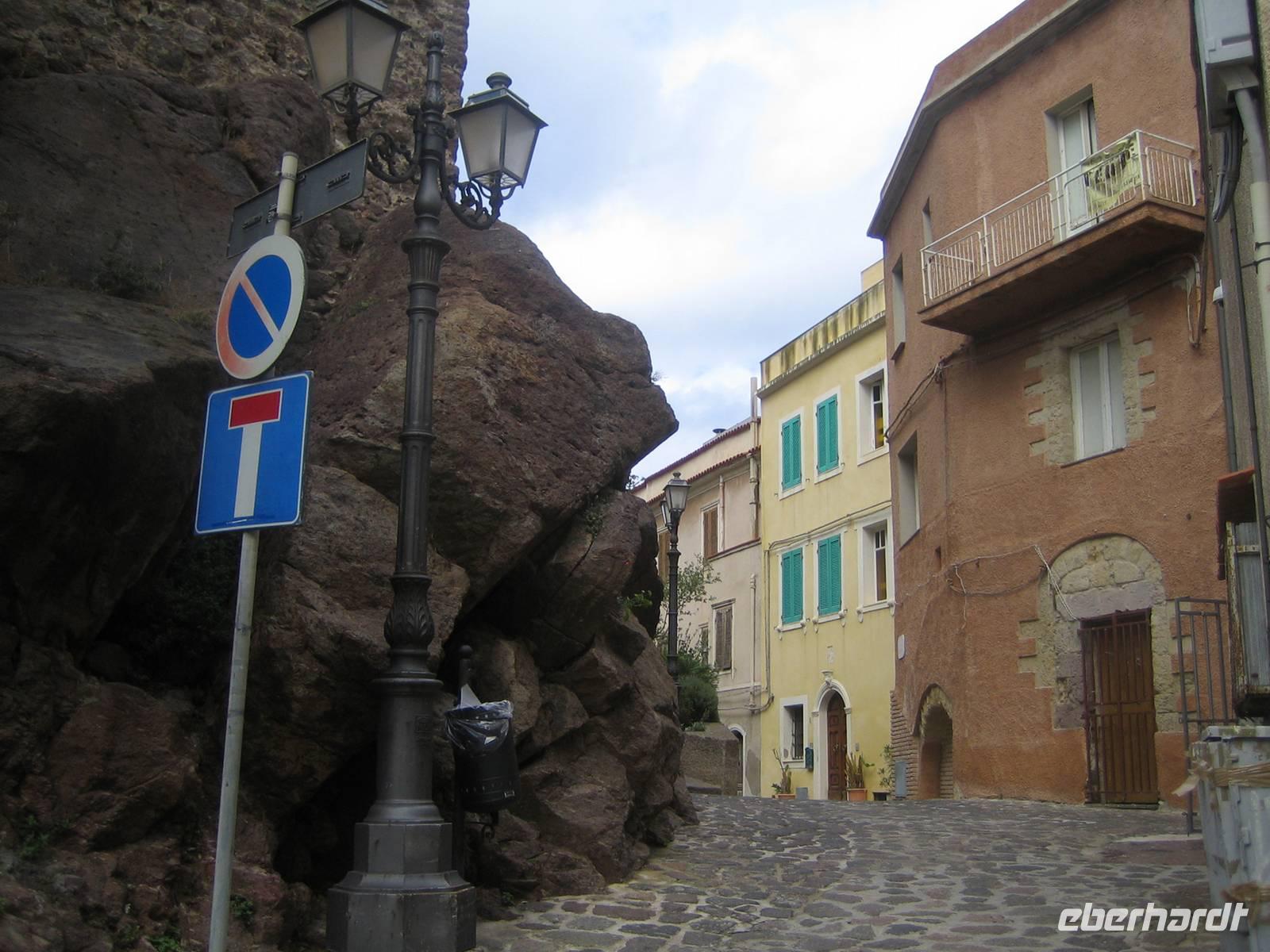 Es hatte die ganze Nacht gestürmt, der Morgen empfängt uns mit strömendem Regen und starkem Wind. Für die großen Städte des Nordens ist Flutalarm ausgerufen und viele Straßennetze sind gesperrt. Kleine Bäche verwandeln sich in reißende Ungeheuer und wir fragen uns, ob wir unseren Ausflug heute überhaupt durchführen können. Rebecca kennt den sardischen Wetterbericht wie ihre Jackentasche und so findet sie den einzigen Ort in ganz Sardinien, in dem es heute nicht regnet: Castelsardo. Wir zaudern nicht und fahren gleich nach dem Frühstück los. Mit uns reist heute die Wandergruppe, denn für sie ist der Sturm zu gefährlich zum Wandern. Nach einer Stunde Fahrt werden wir von einem Regenbogen begleitet, der sich über Artischocken- und Melonenfelder spannt. Die Haupteinnahmequelle im Norden Sardiniens ist jedoch nicht die Landwirtschaft, sondern die Hummerfischerei, der Mittelmeerhummer ist sehr begehrt. Kurz vor Castelsardo halten wir an einem bizarren Elefantenfelsen und da es schon hier nicht mehr regnet, können wir ihn im Lichte besehen und fotografieren. Wieder halten wir am Eingang zum Ort, gehen zu Fuß in die Stadt. Castelsardo ist ein Ort rund um eine mittelalterliche Burg, die in den Lavastein hinein gebaut wurde. Die Burg wurde bis 1939 ununterbrochen genutzt und dabei auch immer instand gehalten. Die Stadt hat heute siebentausend Einwohner. Bei einer Einwohnerzahl von 1,6 Millionen Menschen in ganz Sardinien ist das ziemlich viel. Von der Unterstadt wandern wir hinauf zur oberen Stadt und durchstreifen die historischen Straßen. Rebecca erklärt uns so viel zur Geschichte und zum Alltag von Castelsardo, dass wir immer neugieriger werden. Zum Mittag verweilen wir im „Cafe´de Paris" und fahren dann über eine wilde, felsige Bucht des Capo Caccia weiter nach Alghero. Auch diese Stadt möchten wir sehen und lassen uns von dem windigen Regensturm nicht davon abhalten. Doch ob uns nach unserer Rückkehr jemand glauben wird, dass wir auf einer Mittelmeerinsel waren? Die Fotos sehen ganz anders aus.