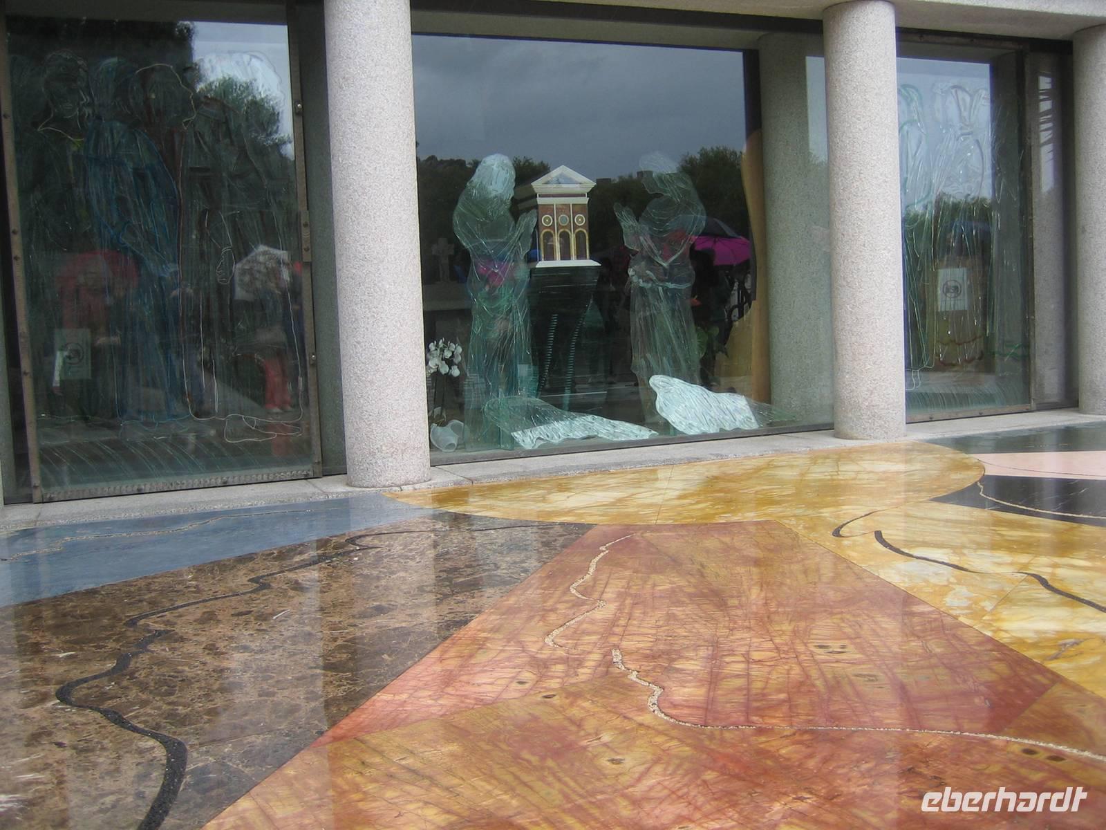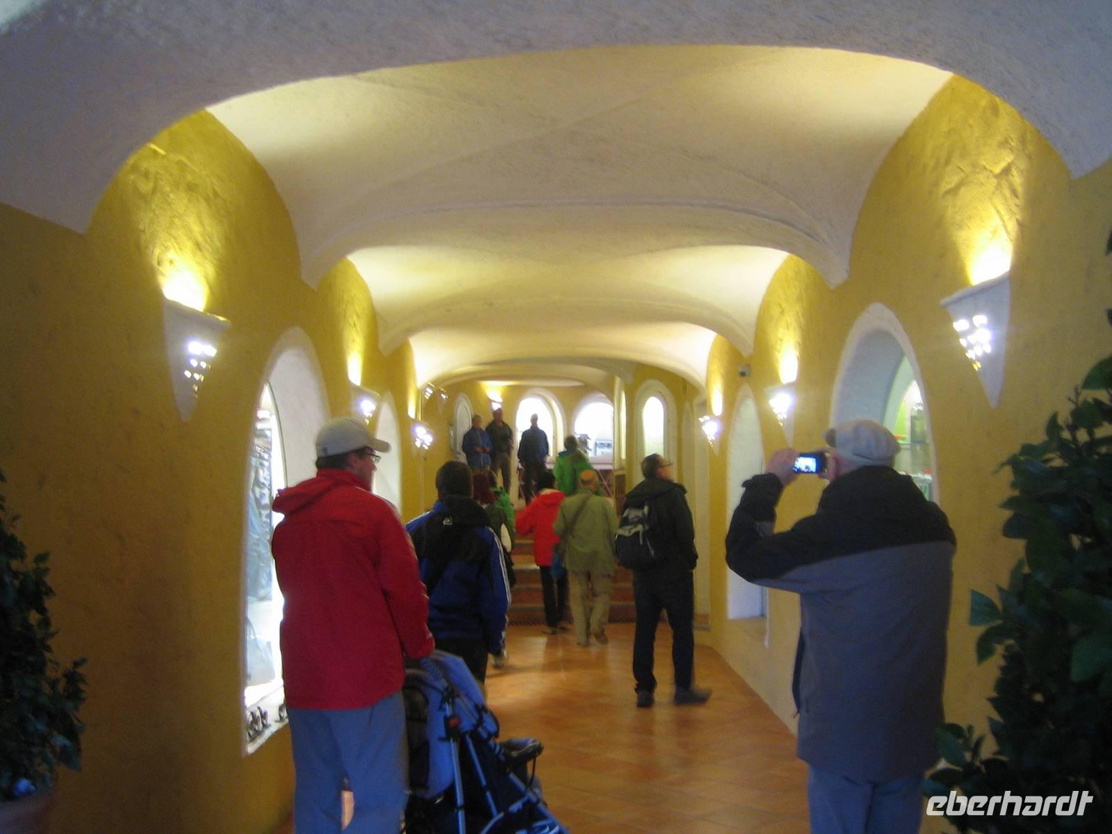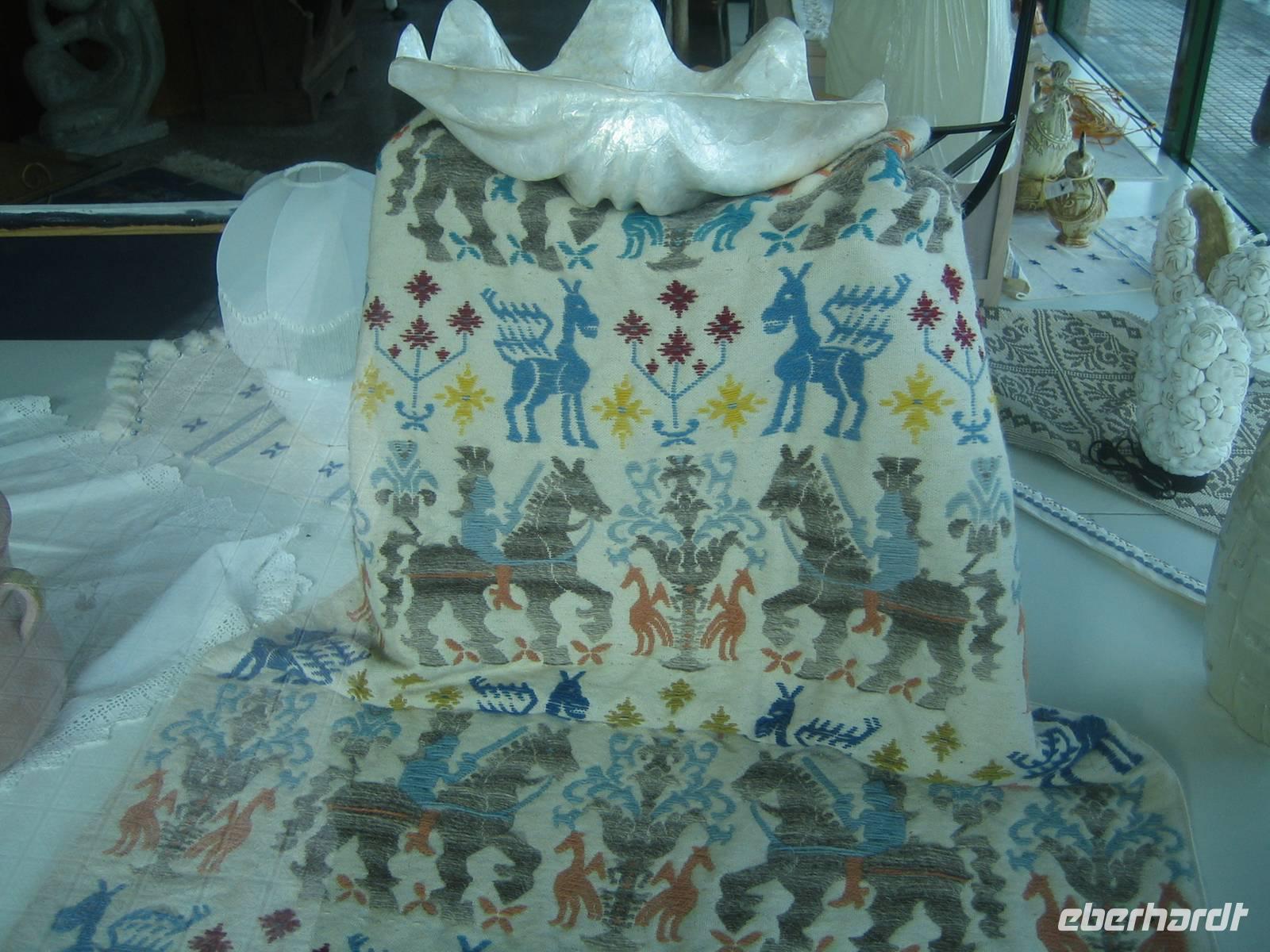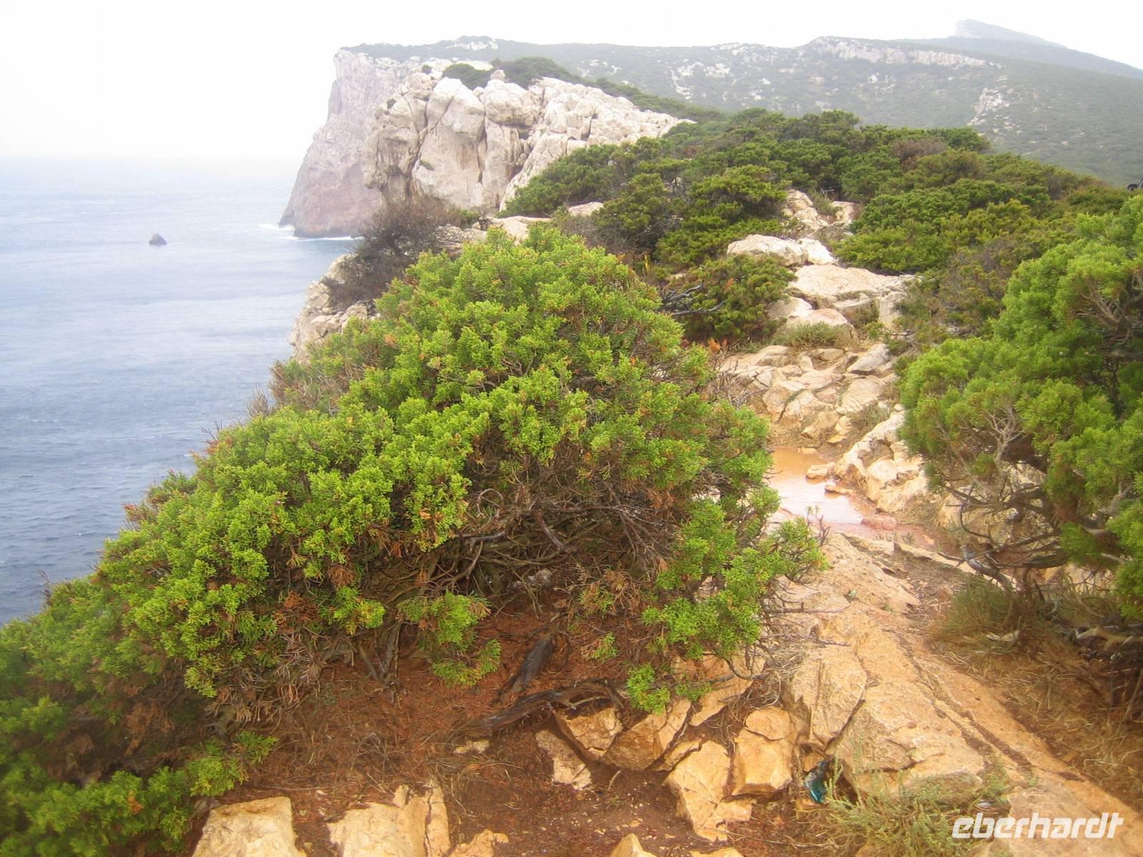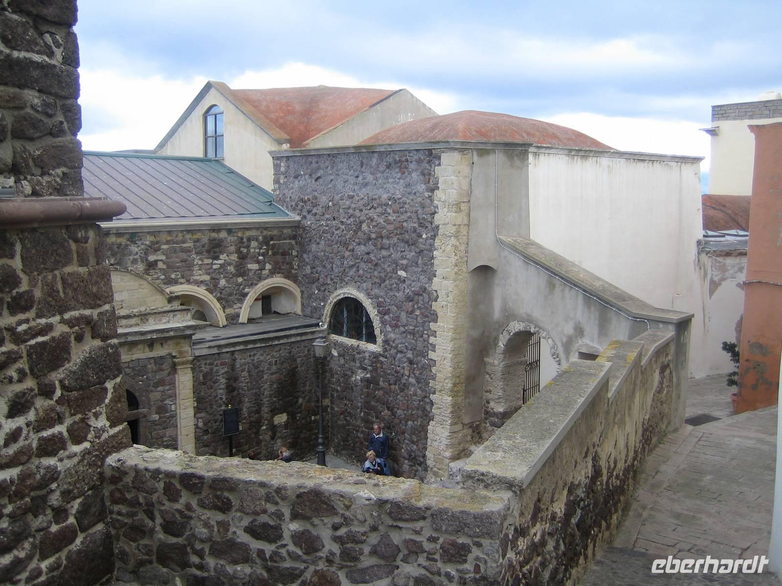 Es hatte die ganze Nacht gestürmt, der Morgen empfängt uns mit strömendem Regen und starkem Wind. Für die großen Städte des Nordens ist Flutalarm ausgerufen und viele Straßennetze sind gesperrt. Kleine Bäche verwandeln sich in reißende Ungeheuer und wir fragen uns, ob wir unseren Ausflug heute überhaupt durchführen können. Rebecca kennt den sardischen Wetterbericht wie ihre Jackentasche und so findet sie den einzigen Ort in ganz Sardinien, in dem es heute nicht regnet: Castelsardo. Wir zaudern nicht und fahren gleich nach dem Frühstück los. Mit uns reist heute die Wandergruppe, denn für sie ist der Sturm zu gefährlich zum Wandern. Nach einer Stunde Fahrt werden wir von einem Regenbogen begleitet, der sich über Artischocken- und Melonenfelder spannt. Die Haupteinnahmequelle im Norden Sardiniens ist jedoch nicht die Landwirtschaft, sondern die Hummerfischerei, der Mittelmeerhummer ist sehr begehrt. Kurz vor Castelsardo halten wir an einem bizarren Elefantenfelsen und da es schon hier nicht mehr regnet, können wir ihn im Lichte besehen und fotografieren. Wieder halten wir am Eingang zum Ort, gehen zu Fuß in die Stadt. Castelsardo ist ein Ort rund um eine mittelalterliche Burg, die in den Lavastein hinein gebaut wurde. Die Burg wurde bis 1939 ununterbrochen genutzt und dabei auch immer instand gehalten. Die Stadt hat heute siebentausend Einwohner. Bei einer Einwohnerzahl von 1,6 Millionen Menschen in ganz Sardinien ist das ziemlich viel. Von der Unterstadt wandern wir hinauf zur oberen Stadt und durchstreifen die historischen Straßen. Rebecca erklärt uns so viel zur Geschichte und zum Alltag von Castelsardo, dass wir immer neugieriger werden. Zum Mittag verweilen wir im „Cafe´de Paris" und fahren dann über eine wilde, felsige Bucht des Capo Caccia weiter nach Alghero. Auch diese Stadt möchten wir sehen und lassen uns von dem windigen Regensturm nicht davon abhalten. Doch ob uns nach unserer Rückkehr jemand glauben wird, dass wir auf einer Mittelmeerinsel waren? Die Fotos sehen ganz anders aus.