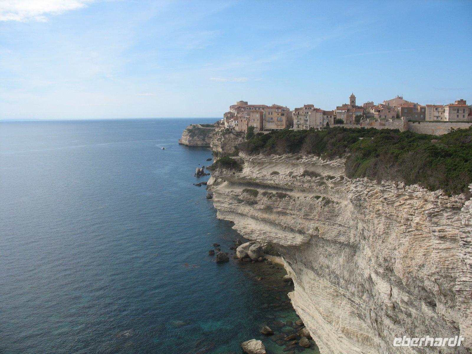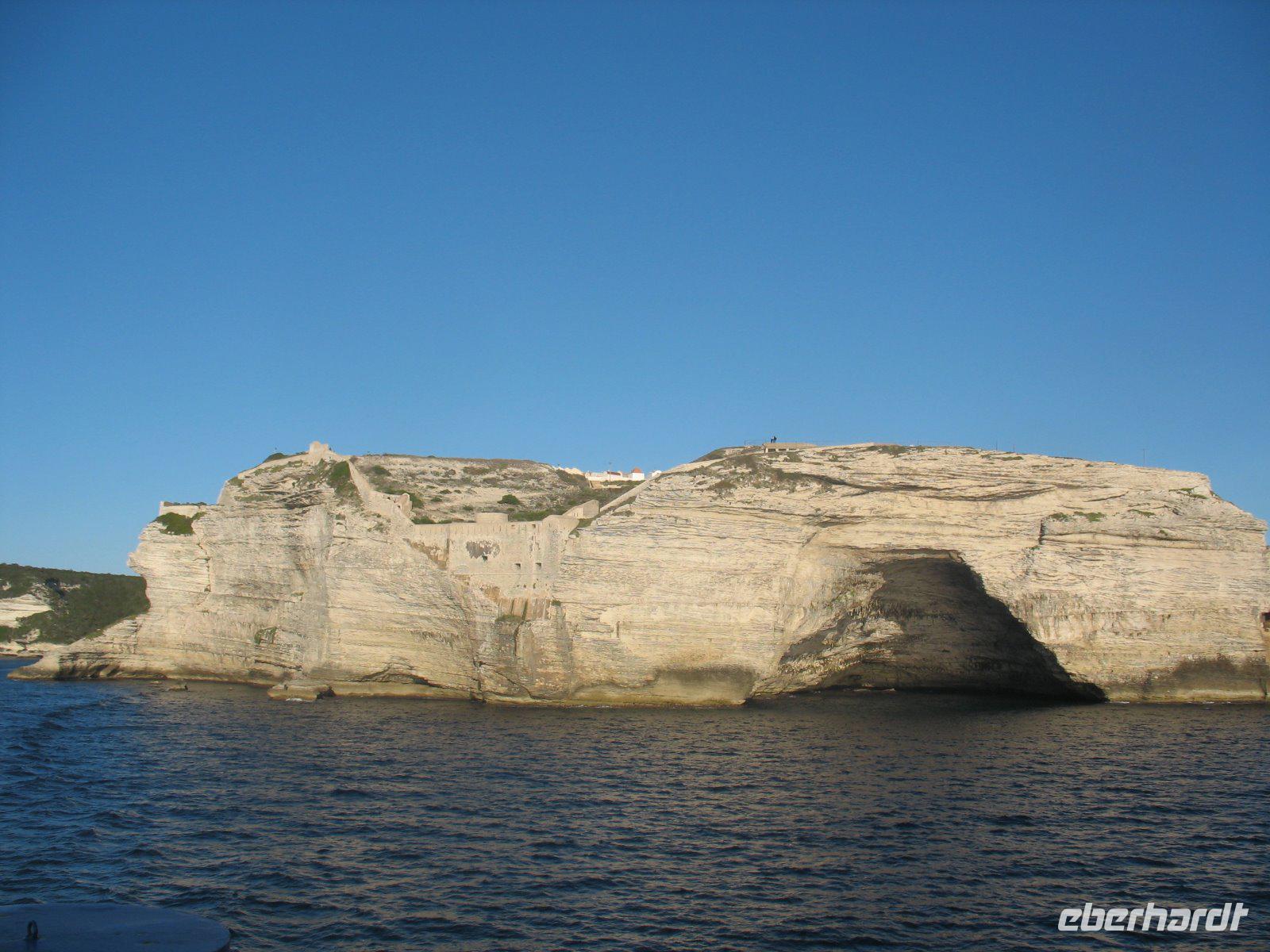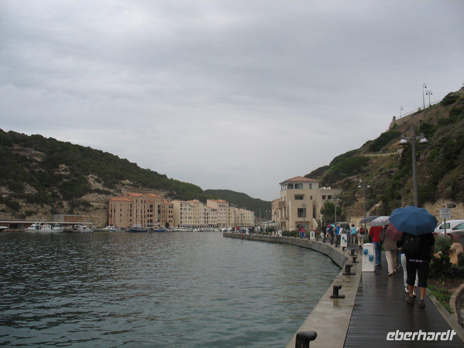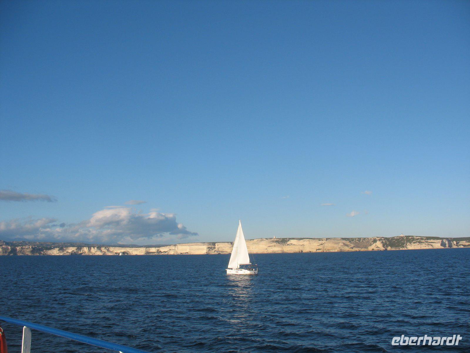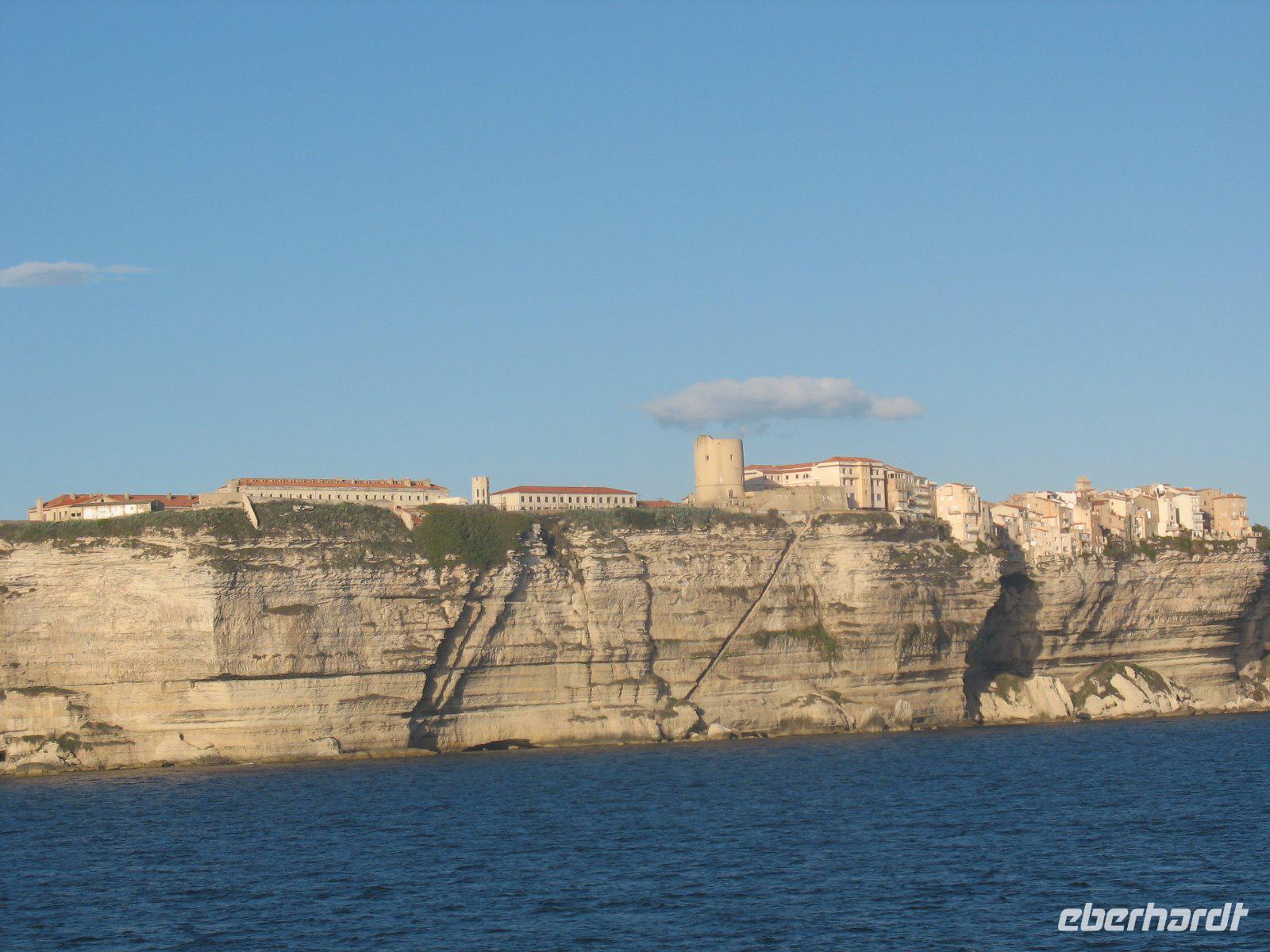 Um 9.45 Uhr trafen wir uns mit Rainer vor dem Hotel. Leider regnete es zunächst etwas. Wir gingen zum Hafen und bestiegen die Fähre nach Bonifacio. Das Meer meinte es gut mit uns. Es blieb ruhig und bescherte uns eine angenehme Überfahrt. Die Kalkfelsen der korsischen Küste konnte man schon von Sardinien aus sehen Nun kamen sie immer näher bis wir schließlich den Durchbruch in den Felsen sahen, wo der natürliche Hafen liegt. Man sah die Häuser von Bonifacio malerisch auf dem Felsen thronen.