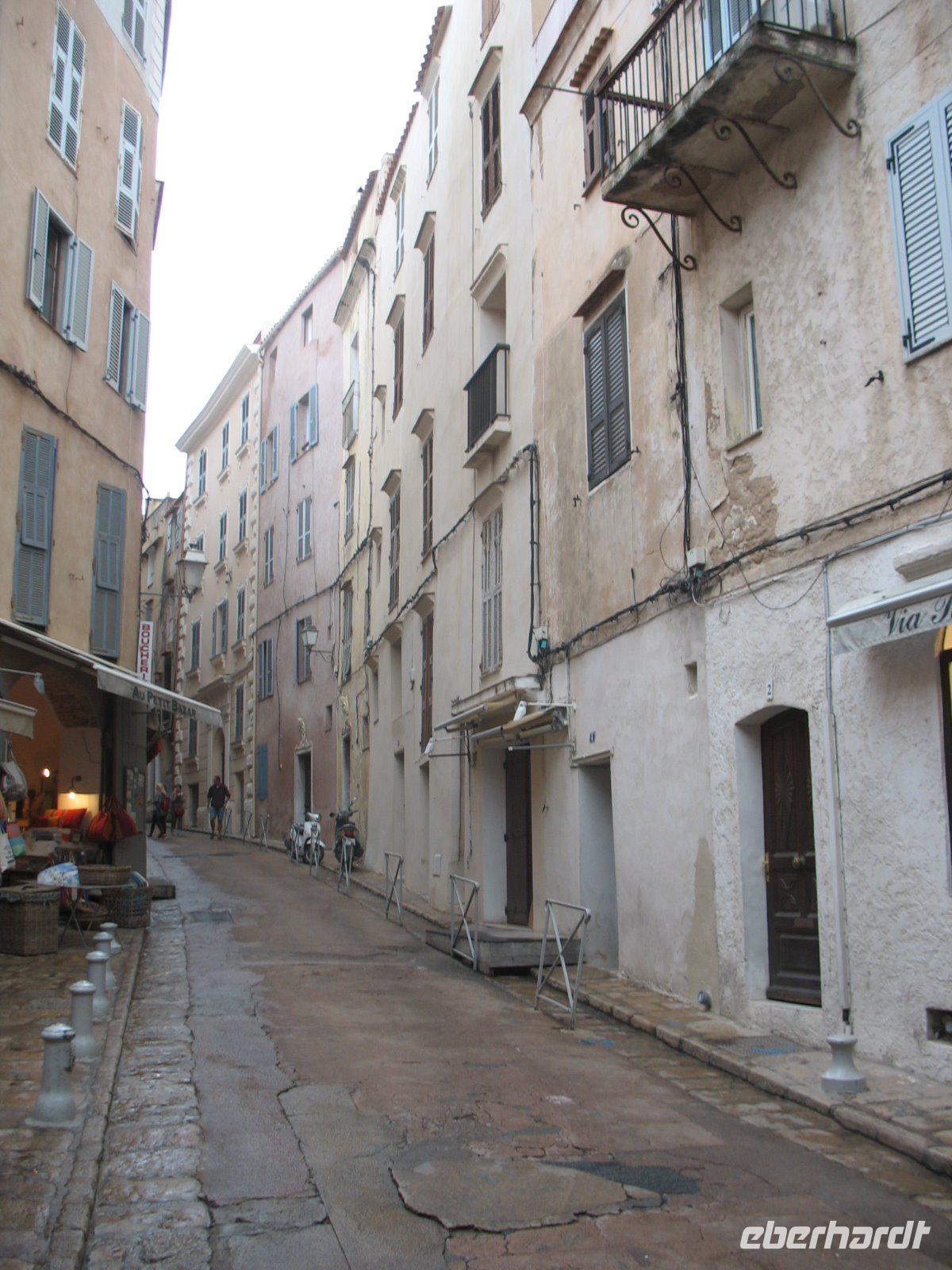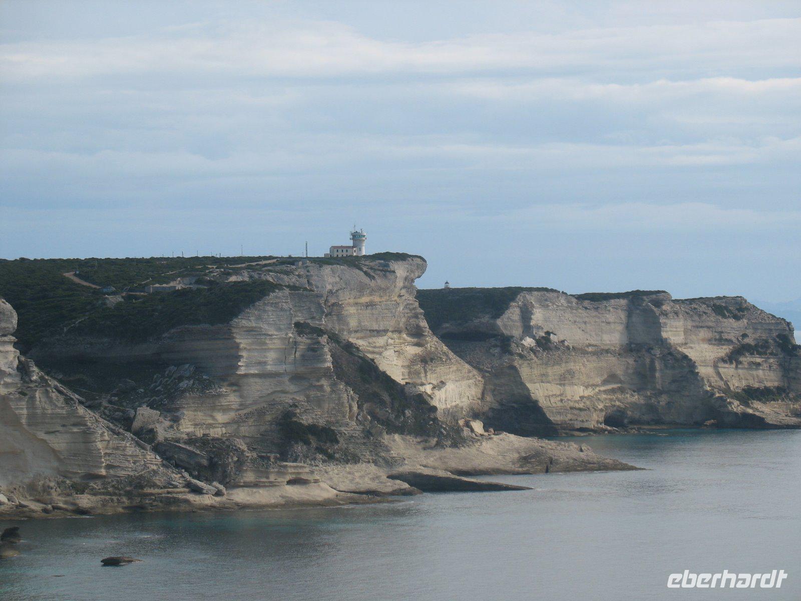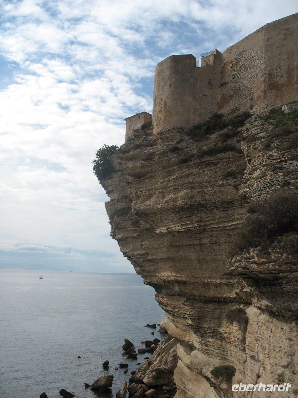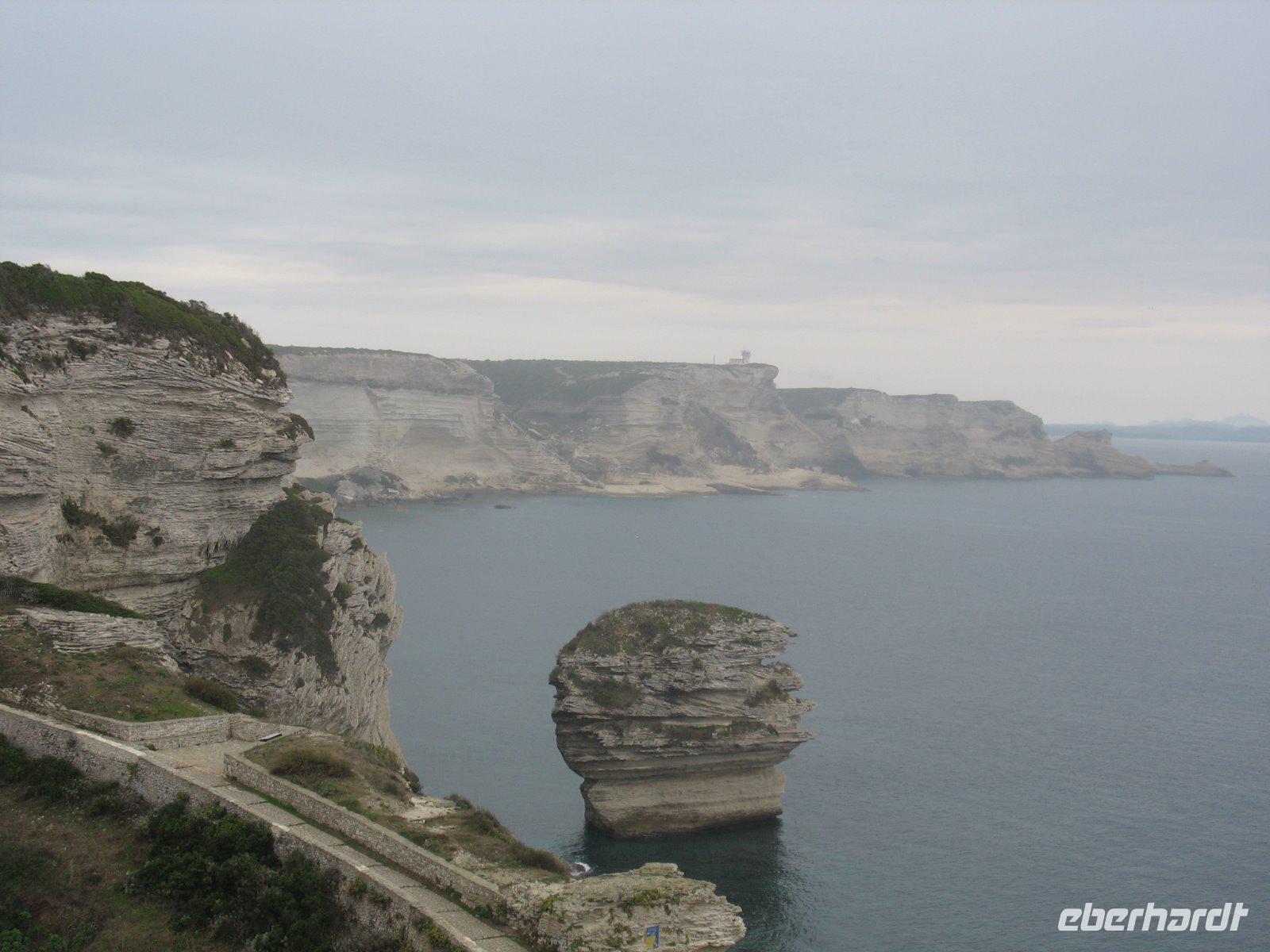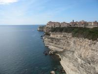 Um 9.45 Uhr trafen wir uns mit Rainer vor dem Hotel. Leider regnete es zunächst etwas. Wir gingen zum Hafen und bestiegen die Fähre nach Bonifacio. Das Meer meinte es gut mit uns. Es blieb ruhig und bescherte uns eine angenehme Überfahrt. Die Kalkfelsen der korsischen Küste konnte man schon von Sardinien aus sehen Nun kamen sie immer näher bis wir schließlich den Durchbruch in den Felsen sahen, wo der natürliche Hafen liegt. Man sah die Häuser von Bonifacio malerisch auf dem Felsen thronen.