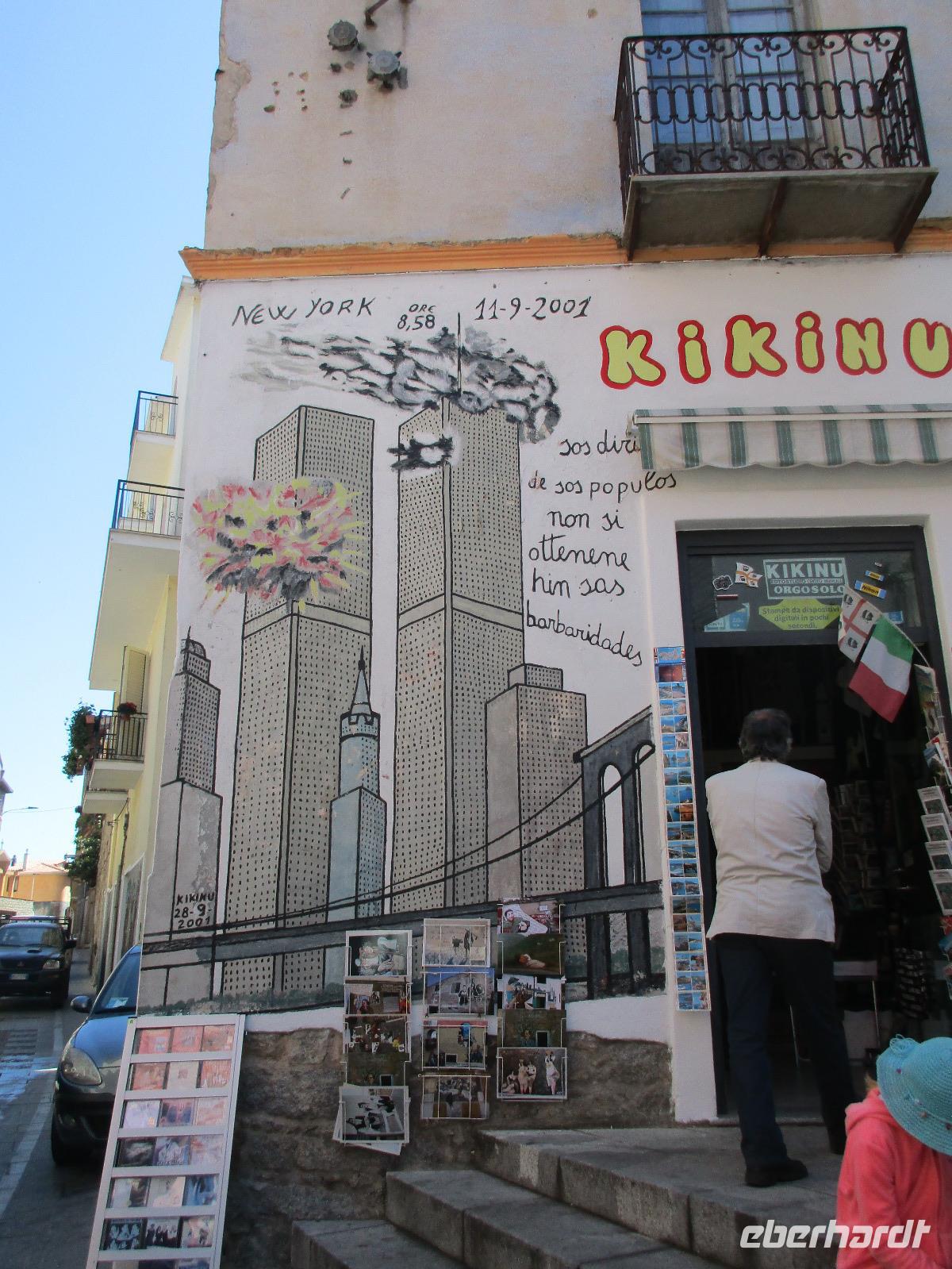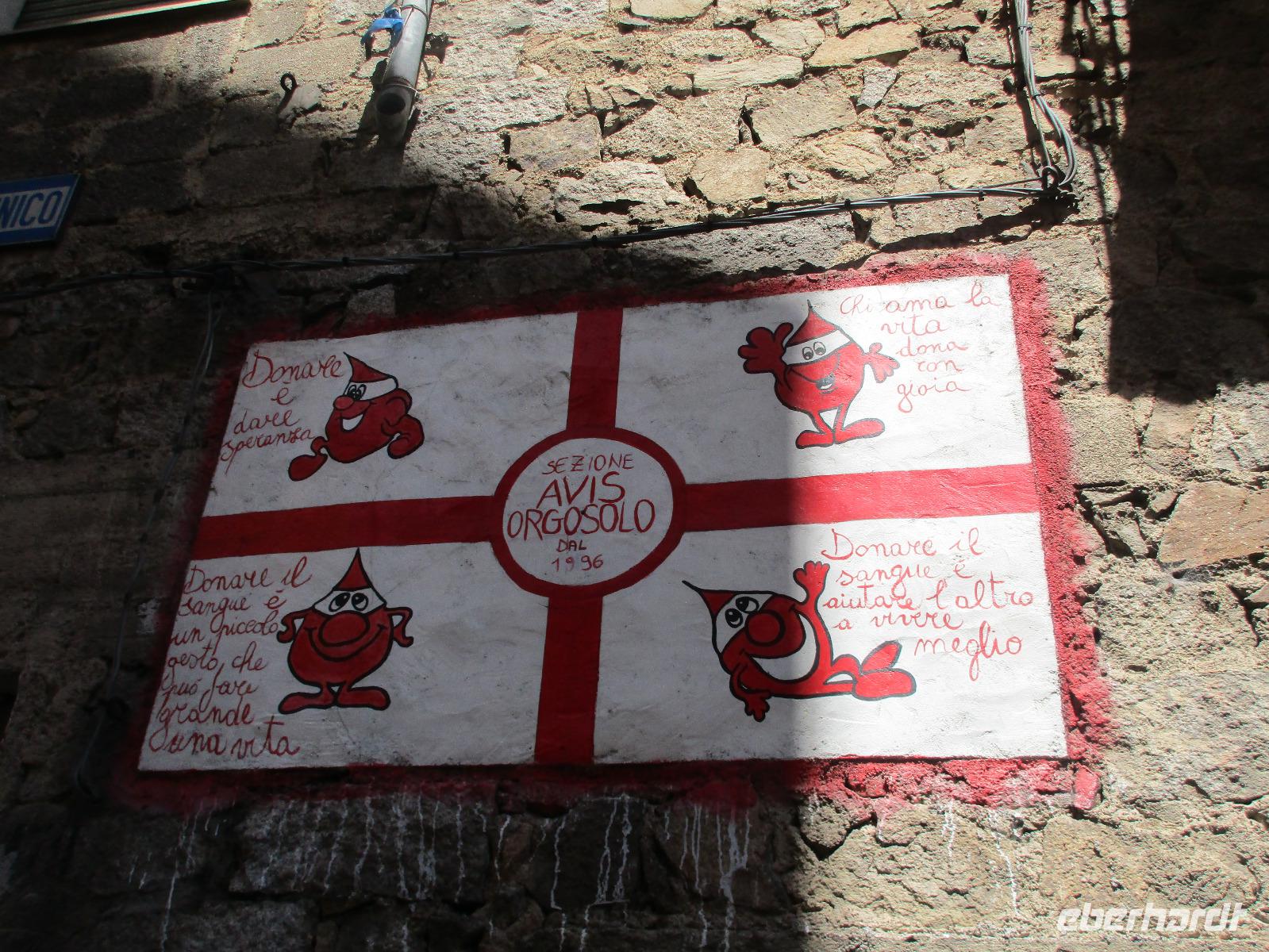 Unsere Fahrt geht weiter nach Orgosolo, dem Ort der Wandmalereien. Wir spazieren durch die Straße von Orgosolo und können viele politischen Wandmalereien überall an den Hauswänden erkennen. Am Nationalfeiertag von Italien vor circa 25 Jahren beschloss eine Schulkasse den freien Tag sinnvoll zu nutzen und sie verzierten ihren Ort mit politischen Bildern. Dies sprach sich herum und bald nutzten die Künstler aus der Umgebung, von Sardinien und später aus ganz Italien die Möglichkeit sich hier zu verewigen. So wurde der Ort, welcher einst zu den ärmsten von Sardinien gehörte, über die Grenzen von Italien hinweg bekannt und die Touristen brachten etwas Geld in die arme Region.