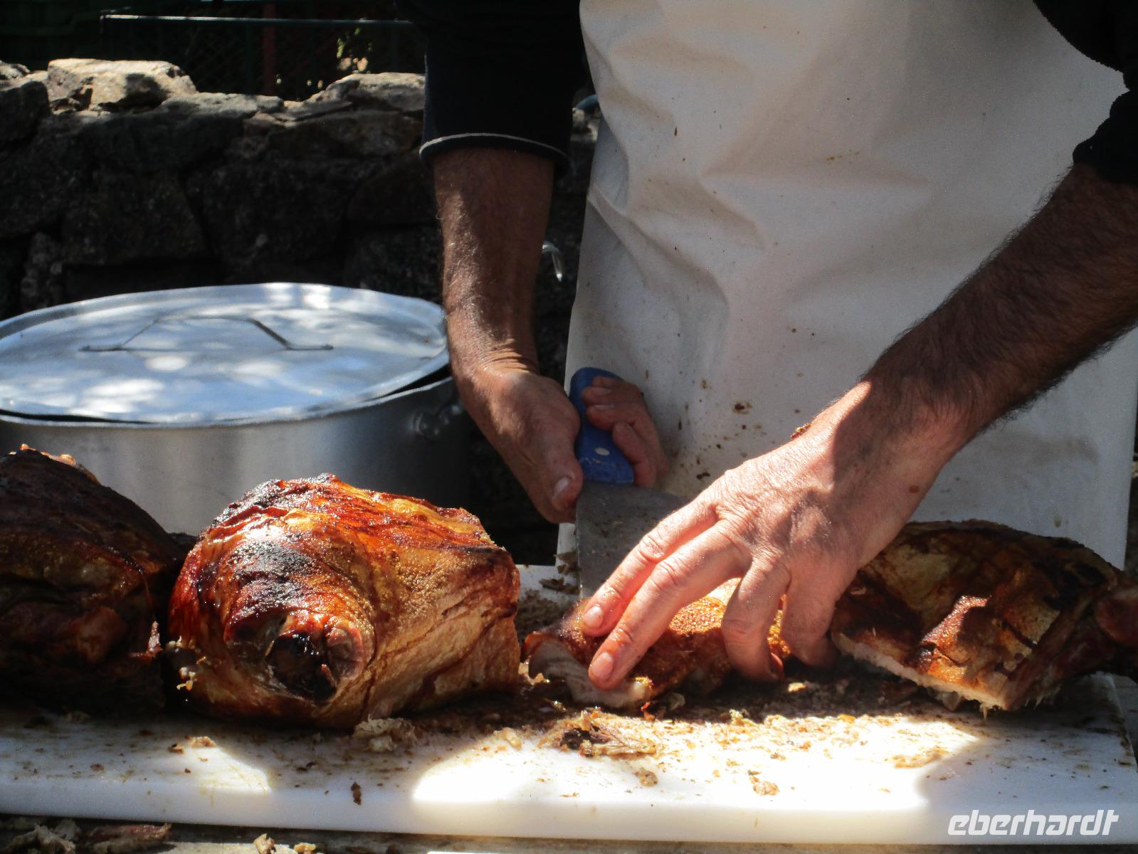 Gegen 13:00 Uhr treffen wir bei Hirten ein, welche ein leckeres Essen für uns vorbereitet haben. Auf langen Holzbänken können wir Platz nehmen und die Hirten kommen herum, um uns Wein und Wasser einzuschenken - soviel wir wollen. Wir bekommen ein kleines Brett aus Holz und schon kommen sie herum mit dem Essen. Auf unserer Menükarte stehen Brot mit Speck und Salami, Lamm mit Kartoffeln, Spanferkel mit sardischem Fladenbrot sowie Obst und einen Mirto-Schnaps. Von allem erhalten wir mehr als genug, aber es darf nur mit den Fingern gegessen werden. Kein Problem für uns, schließlich gibt es ja fließendes Wasser zum Händewaschen im Nachhinein. Zum Schluss führen uns die Hirten noch den berühmten Tenor-Gesang vor und auch ein volkstümlicher Tanz darf nicht fehlen. Leider müssen wir dann schon wieder aufbrechen und die fast drei Stunden zum Hotel zurück fahren.