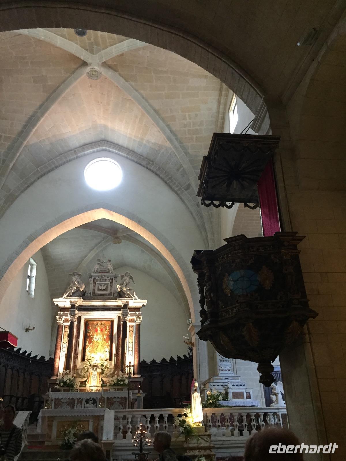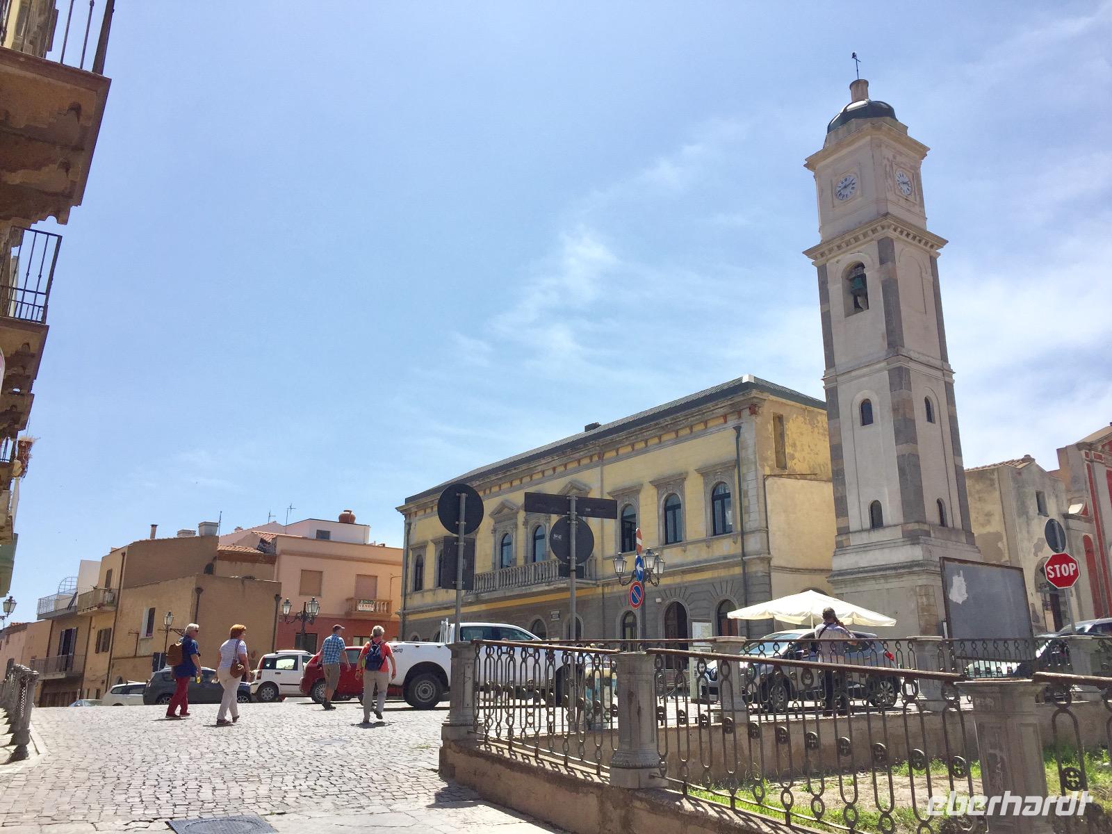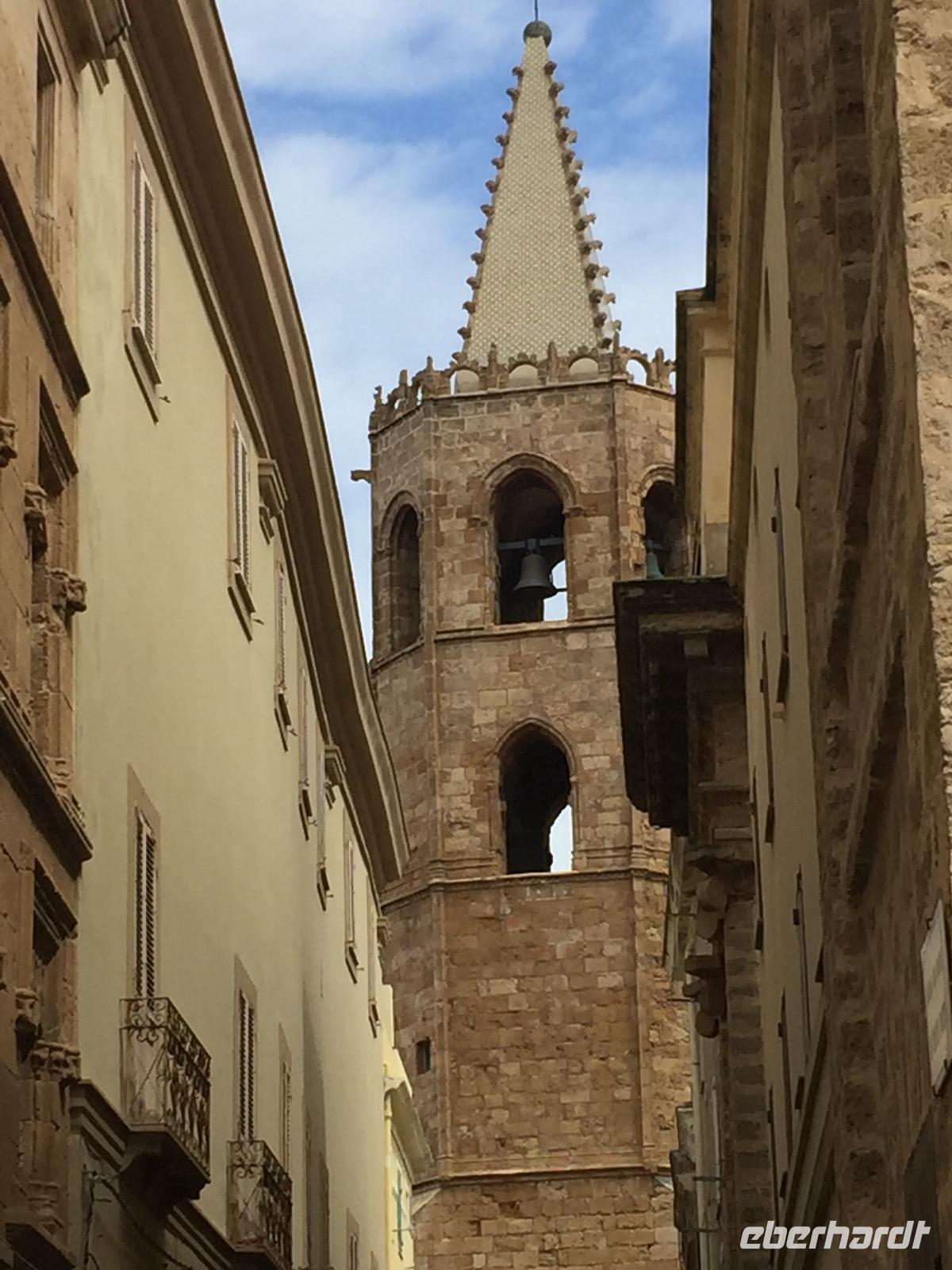 Danach erkundeten wir mit Angela ihre Heimatstadt Alghero. Die Altstadt, der durch ihre Geschichte sehr spanisch angehauchten Stadt, liegt gedrängt auf einer Landzunge umgeben von der Festungsmauer. Trotz der schweren Zerstörungen des Zweiten Weltkrieges ist das Zentrum der Altstadt zum größten Teil intakt. Während unseres Stadtrundganges sahen wir die Piazza Civica, die „gute Stube" der Bürger von Alghero. Durch die Altstadtgassen erreichten wir die San Francesco Kirche. Als „Betender" kann man einzeln und kostenfrei die Kirche besuchen. Wir gelangten schließlich zum Dom mit dem Campanile, dem ungewöhnlich achteckigen Glockenturm.