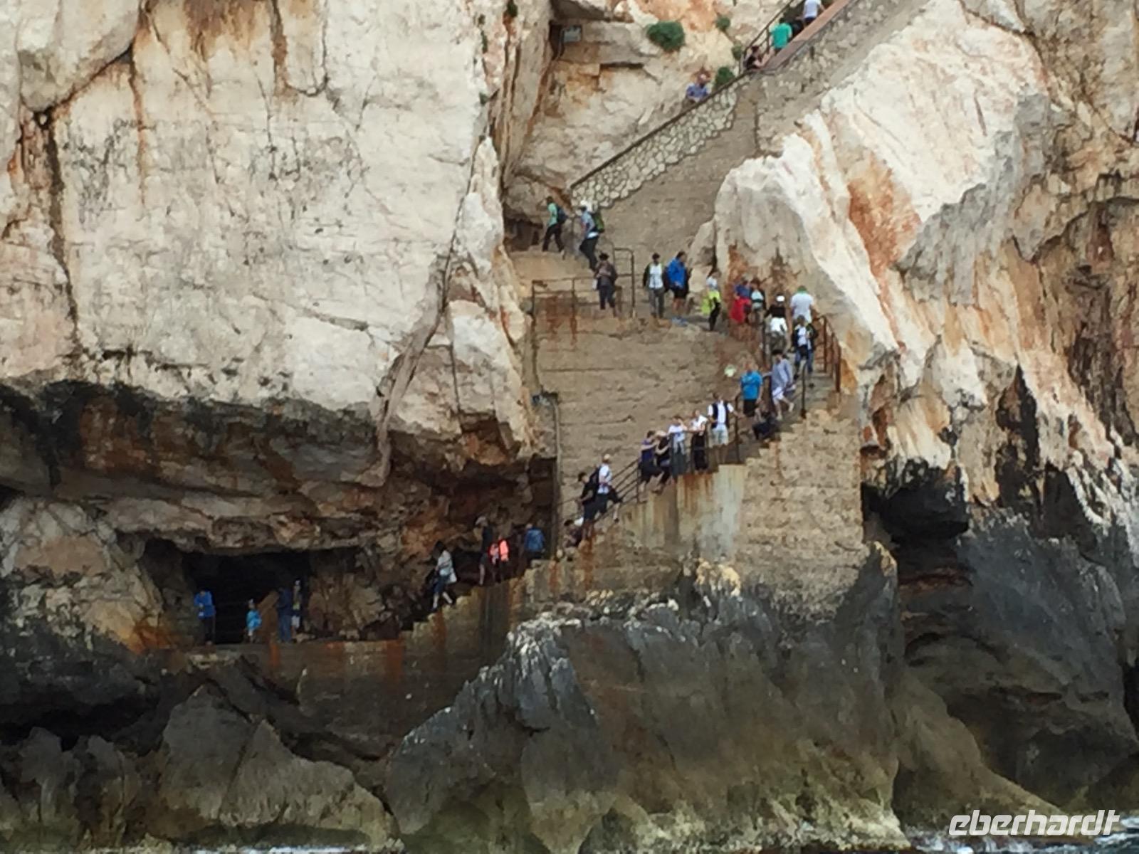 Trotz Regen wollten alle zur Neptungrotte, sie ist die einzig zugängliche der zahlreichen Tropfsteinhöhlen und lohnt einen Besuch. Das Schiff brachte uns in knapp einer Stunde hinüber und nachher wieder zurück. Bei Wind und Wellengang war die Fahrt eine nette Abwechslung.