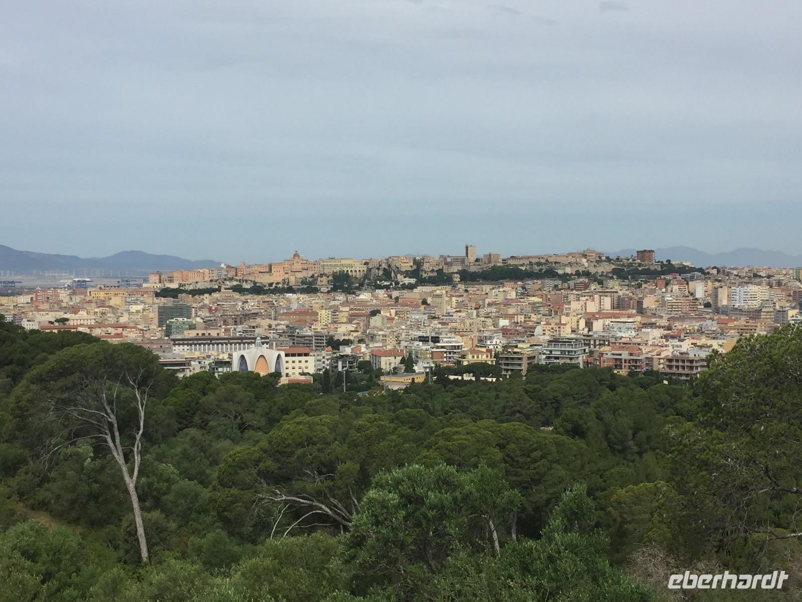 Angela führt uns zu einer typischen Trattoria, wo wir uns erstaunlich preiswert Spaghetti munden lassen. Unter den Arkaden der Via Roma gibt es zahlreiche Geschäfte, doch dafür reicht die Zeit leider nicht mehr. Der Bus wartet.Wir wollten noch den „Teufelsattel" erwandern. Dieser Hügel teilt die Bucht von Cagliari in zwei große Einbuchtungen und verspricht eine tolle Aussicht. Die Sonne sticht vom Himmel, der fantastische Ausblick von oben muss verdient werden! Eine Stunde leichter Anstieg durch grüne Büsche und mit einigen Irrwegen erreichten wir schließlich alle die Aussichtsplattform. Che bello!!