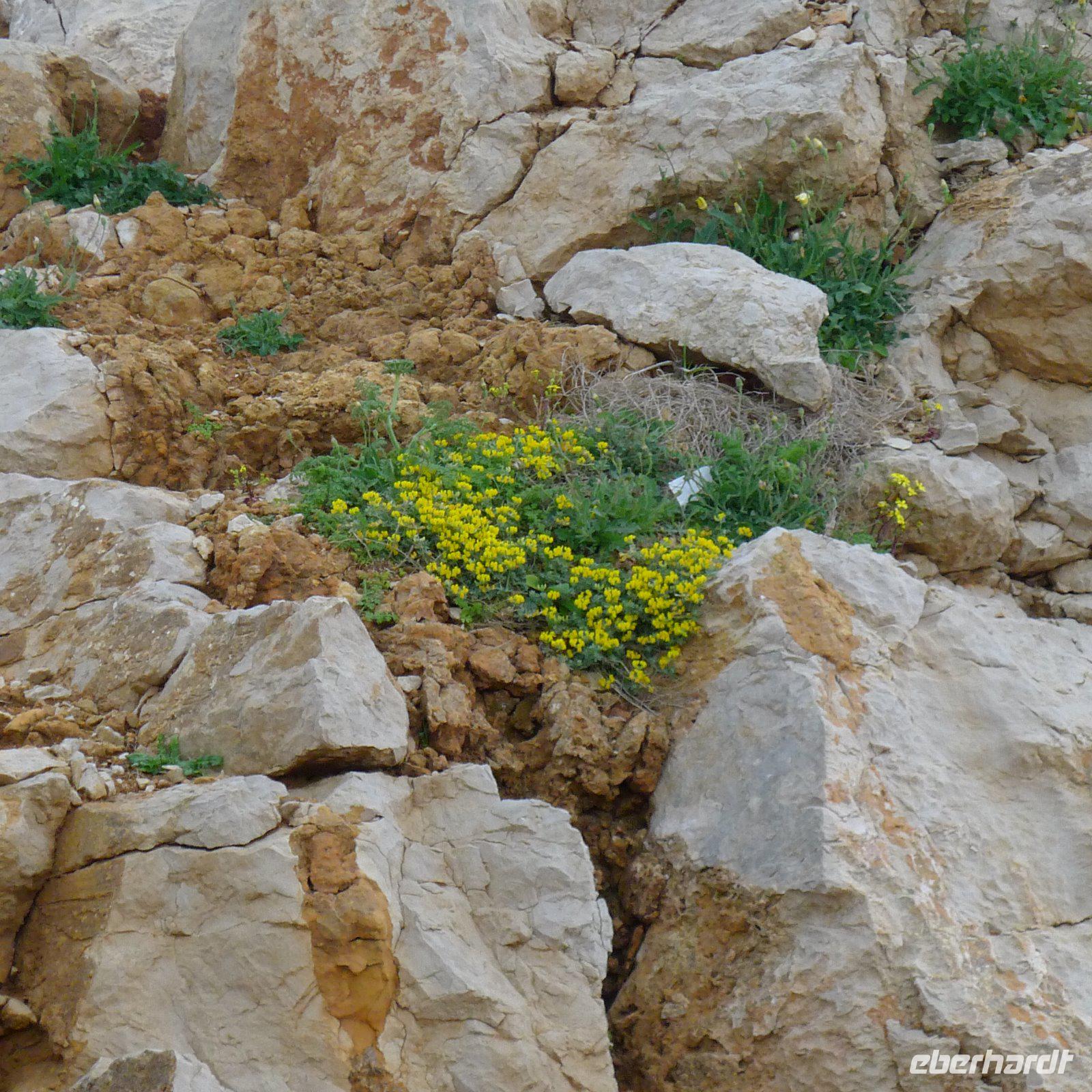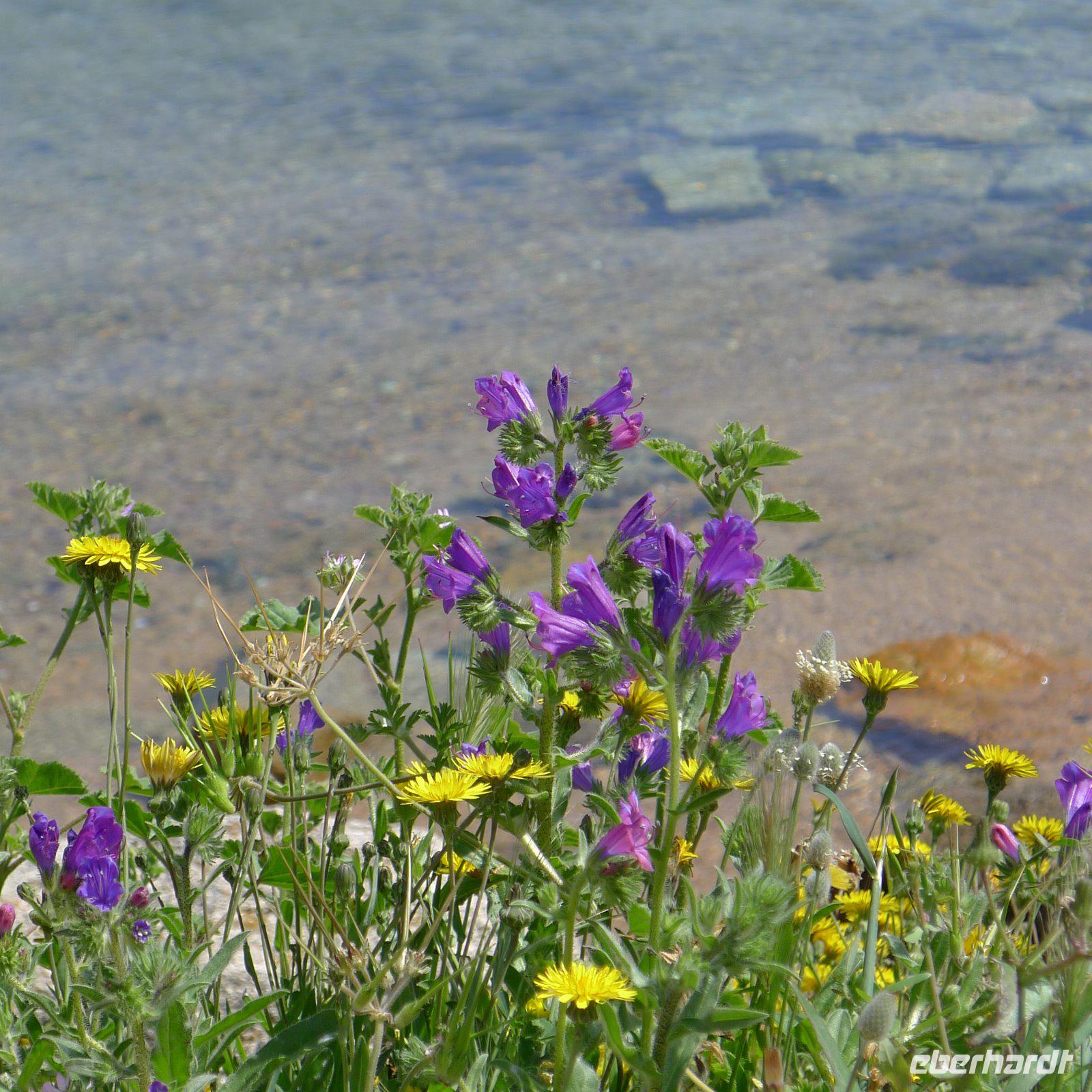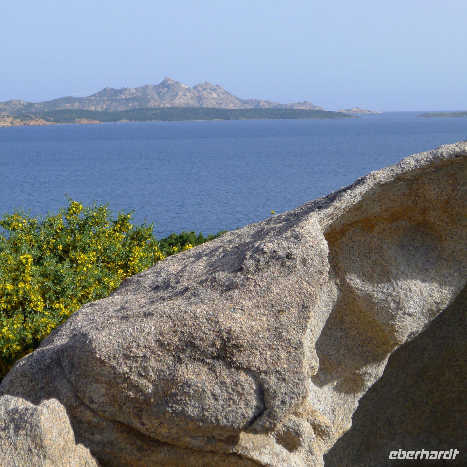 Auf unserer Inselrundfahrt jagte ein Fotomotiv das nächste. Es ist nicht übertrieben, wenn man davon spricht, dass Sardinien ‚karibische Strände' hat. Detlef führte uns zu seiner Lieblingsbucht, aber dieser Geheimtipp soll hier an dieser Stelle natürlich nicht verraten werden. Es reicht völlig aus, wenn wir, die Eingeweihten, die mit dabei waren, diese traumhafte Bucht deutlich vor Augen haben, nicht wahr? Das glasklare Wasser war so verlockend, dass einige von uns Füße und Beine kühlten. Für ein ‚Ganzkörperbad' hat der Mut nicht gereicht. Dazu hätte das Wasser doch etwas wärmer sein müssen. Durch eine üppig grüne Landschaft mit blühendem Ginster und den zartweißen Blüten des Affodills ging unsere Fahrt über den Damm hinüber nach Caprera.