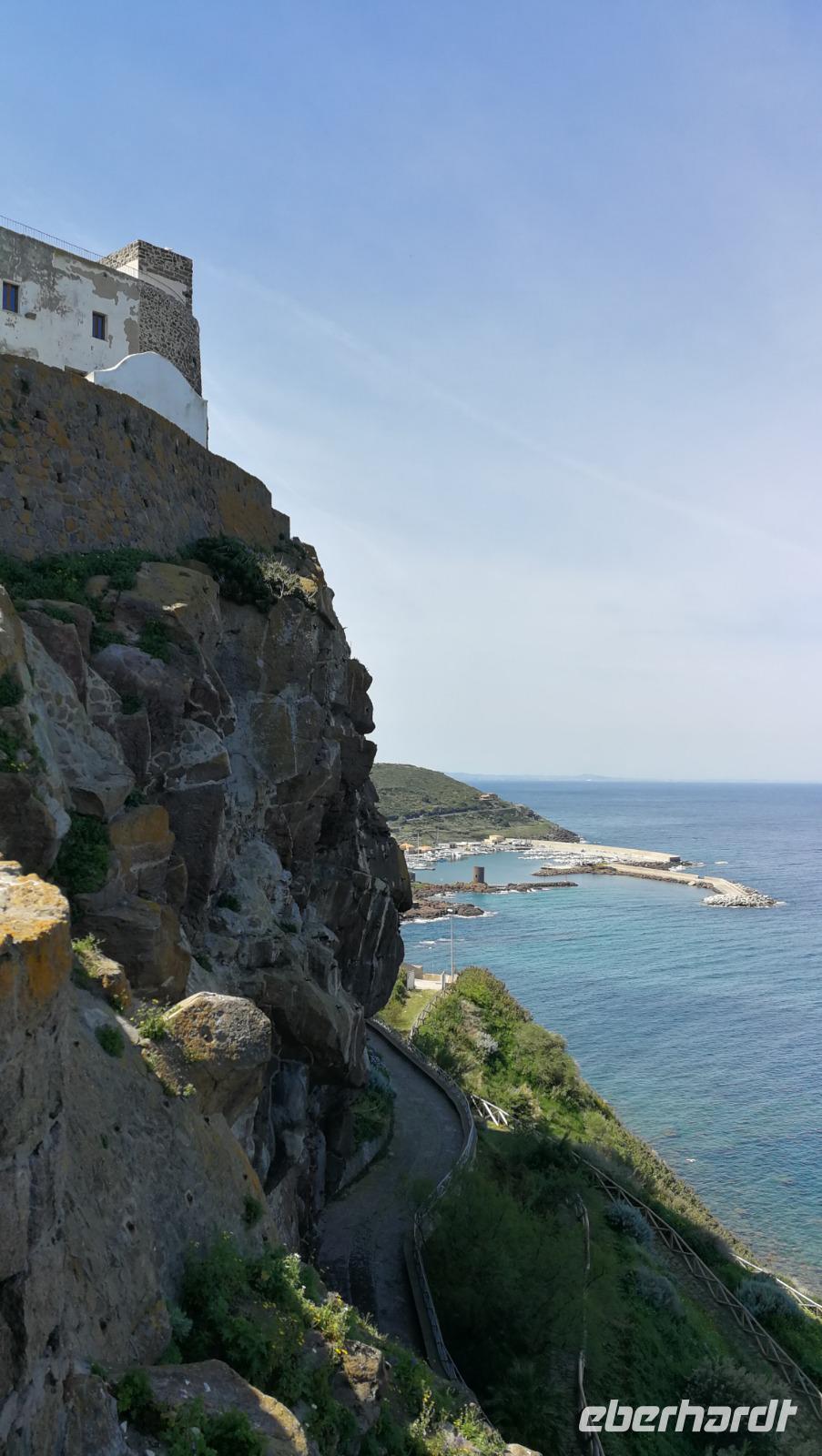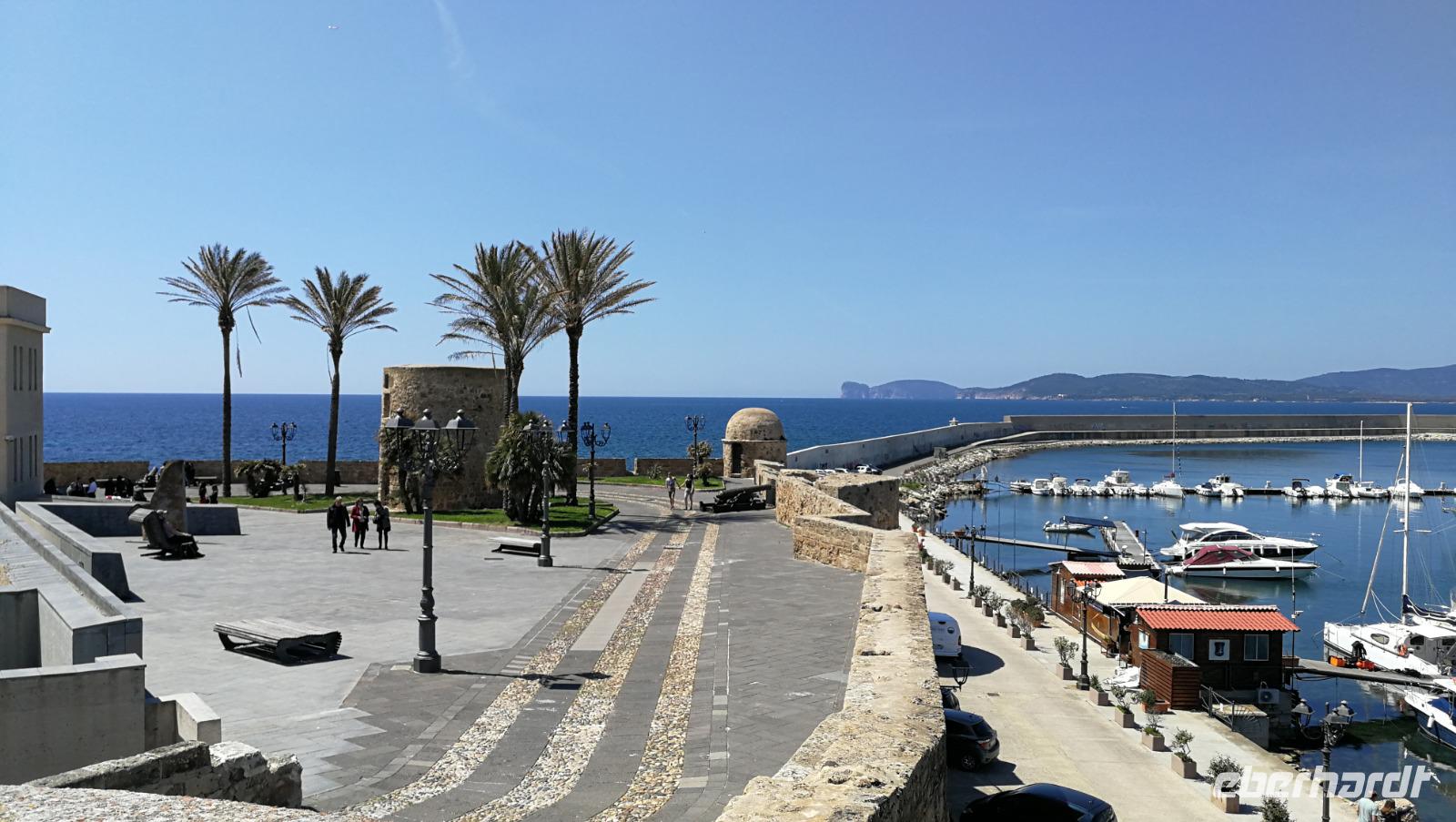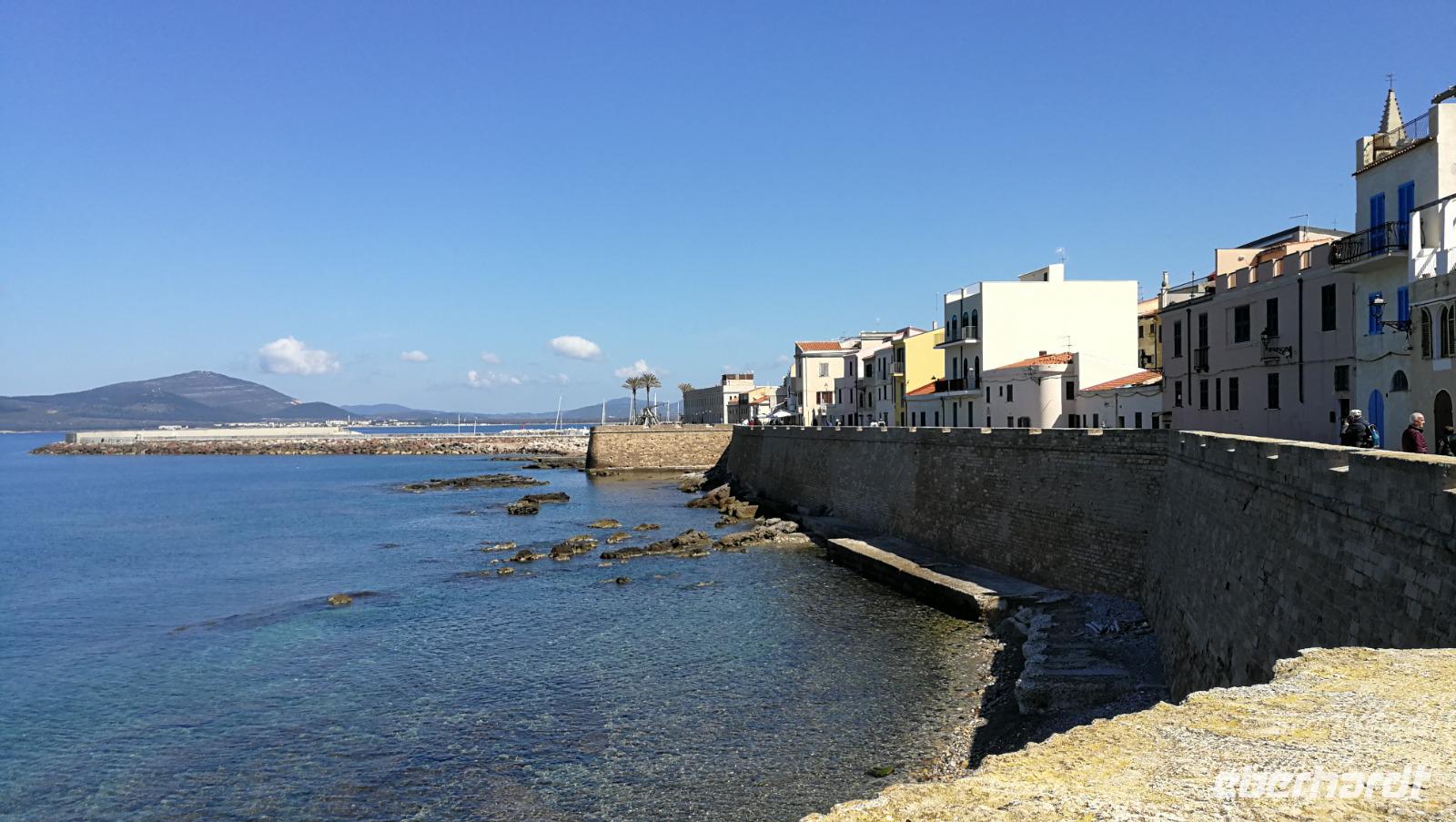 Heute brachen wir auf, die nahe gelegene Stadt Alghero zu erkunden. Die Stadt stellt bis heute eines der Zentren der katalanischen Minderheit auf Sardinien dar. Sie erlebte ihre Blütezeit unter der Herrschaft durch die Krone von Aragon und stellte einen wichtigen Anlaufpunkt für die Handelsbeziehungen zur iberischen Halbinsel dar. Die Katalanen nutzen Alghero als Stützpunkt, von wo aus sie ihre Kontrolle über die restliche Insel ausdehnen konnten. Entlang der Stadtmauern beeindrucken uns die Nachbildungen alter Belagerungswaffen die den Festungscharakter des Ortes herausstellen.