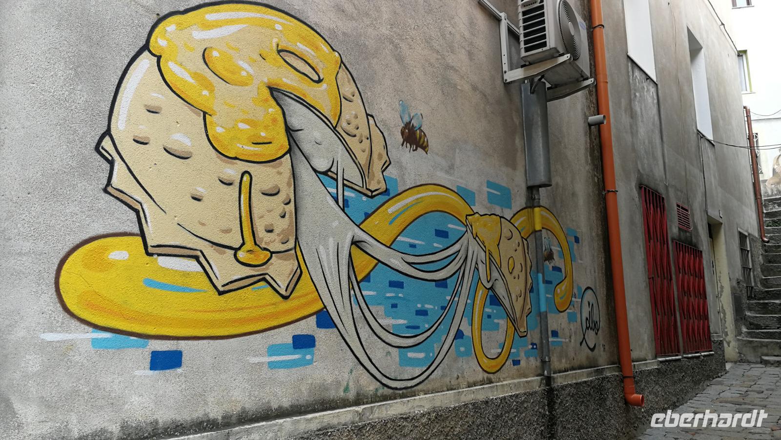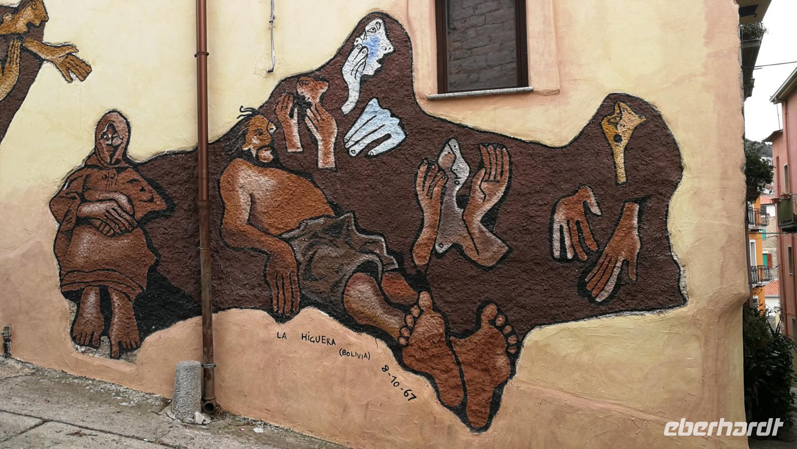 Die Aussicht entlang der Bergstraßen genießend fuhr unsere Reisegruppe weiter nach Orgosolo, einer Ortschaft, die mit an mexikanische Murales angelehnte Wandmalereien auf sich aufmerksam gemacht hat. Ein Künstler aus Orgosolo war bei seinem Besuch in Mexiko-Stadt so von den Kunstwerken begeistert, dass er diese in seiner Heimat ebenfalls von Schülern und Künstlern anfertigen ließ. Die Motive zeigen meist politische Kommentare und lehnen sich an verschiedene Kunstrichtungen an.