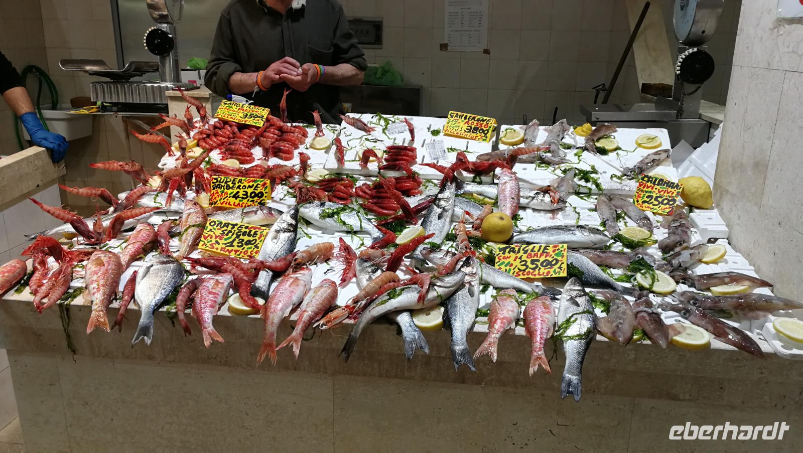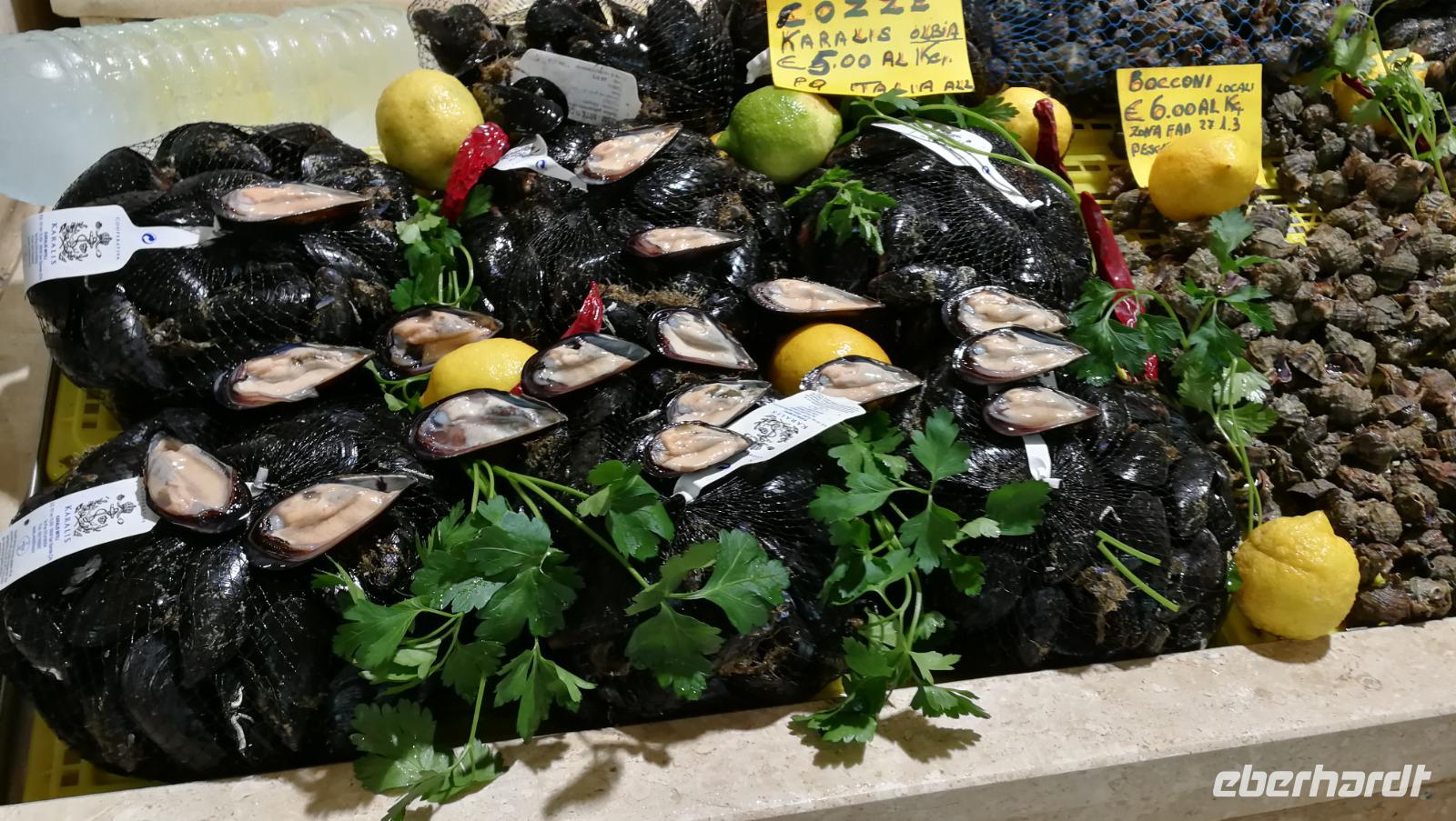 Eine Kostprobe der sardischen Spezialitäten erhielten wir danach beim Besuch des Wochenmarktes. Auf engstem Raum werden hier frisches Obst und Gemüse sowie frischer Fisch dargeboten. Kleine Kostproben und die penibel angerichteten Waren ließen uns das Wasser im Munde zusammenlaufen.