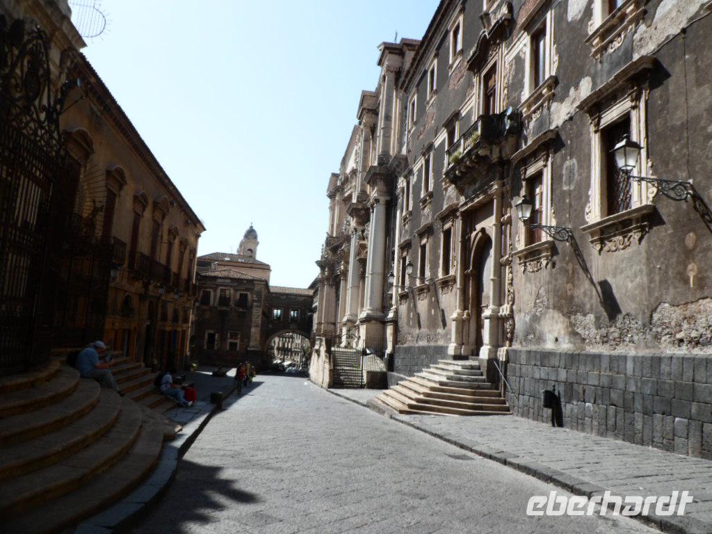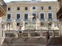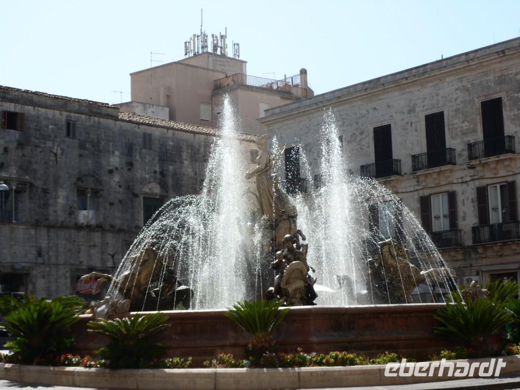 Frühstück gibt es ab 07.00 Uhr, auch hier erfreut sich das Auge und der Gaumen. Danach fahren wir nach Catania, eine der frühesten griechichen Kolonie aus dem Jahre 729v. Chr. Alberto erzählt über die Geschichte der Stadt, über Legenden der vergangenen Zeit und wir bummeln an den Märkten vorbei bis zur Barockstraße und besichtigen den Duomo di Sant Agata. Nach der Mittagspause fahren wir weiter nach Syrakus. Inzwischen ist es sehr heiß geworden und die Hutverkäufer machen gute Geschäfte. Die Stadtführerin Carolina erwartet uns, wir spazieren in die Altstadt auf der Halbinsel Ortigia und hören fasziniert den Erklärungen zu. Schade das bei 42°C die Aufnahmefähigkeit nachläßt, es ist ein ganz besondere Ort auf dem Hauptplatz mit der Kathedrale "Santa Maria von den Säulen" ehemals Tempel und Kirche vereint.