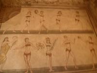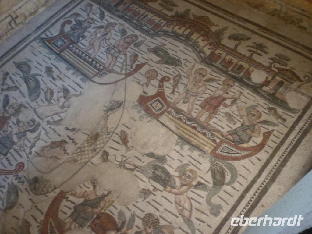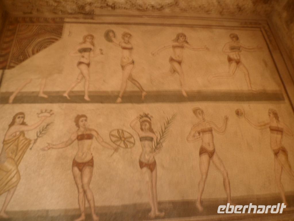 Gegen Mittag fahren wir weiter, es geht nach Piazza Armerina zur Villa Romana. Etwa 285 km liegen vor uns doch alle Gäste fühlen sich wohl und sind guter Dinge. Durch das Landesinnere der ehemaligen Kornkammer Siziliens, sehen wir eine ganz andere Insel, viele Felder waren schon abgeerntet und die Landschaften karg, nicht mehr so blühend wie an der Küste. Wir kommen gegen 15.15 Uhr an der Villa an. Dank der guten Führung von Alberto sind alle Gäste überaus begeistert. WELTKULTURERBE! Die Mosaikfußböden und Wandmalereien sind so toll zu sehen und wir können fast alle Räume besichtigen da die Renovierung weit fotgeschritten ist. Auch die neuen Holzdecken runden den gesamten Eindruck ab. Am späten Nachmittag fahren wir in unser Hotel Baia di Ulisse in Agrigent. Alle sind von diesem Hotel begeistert.