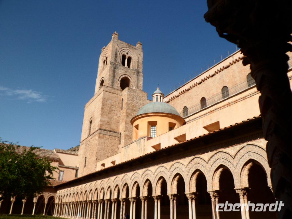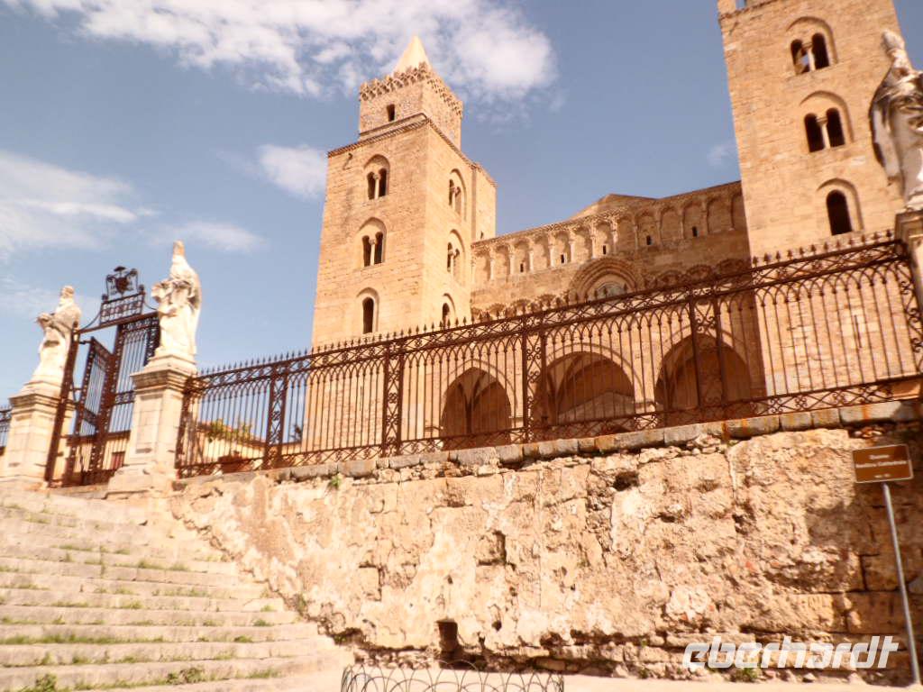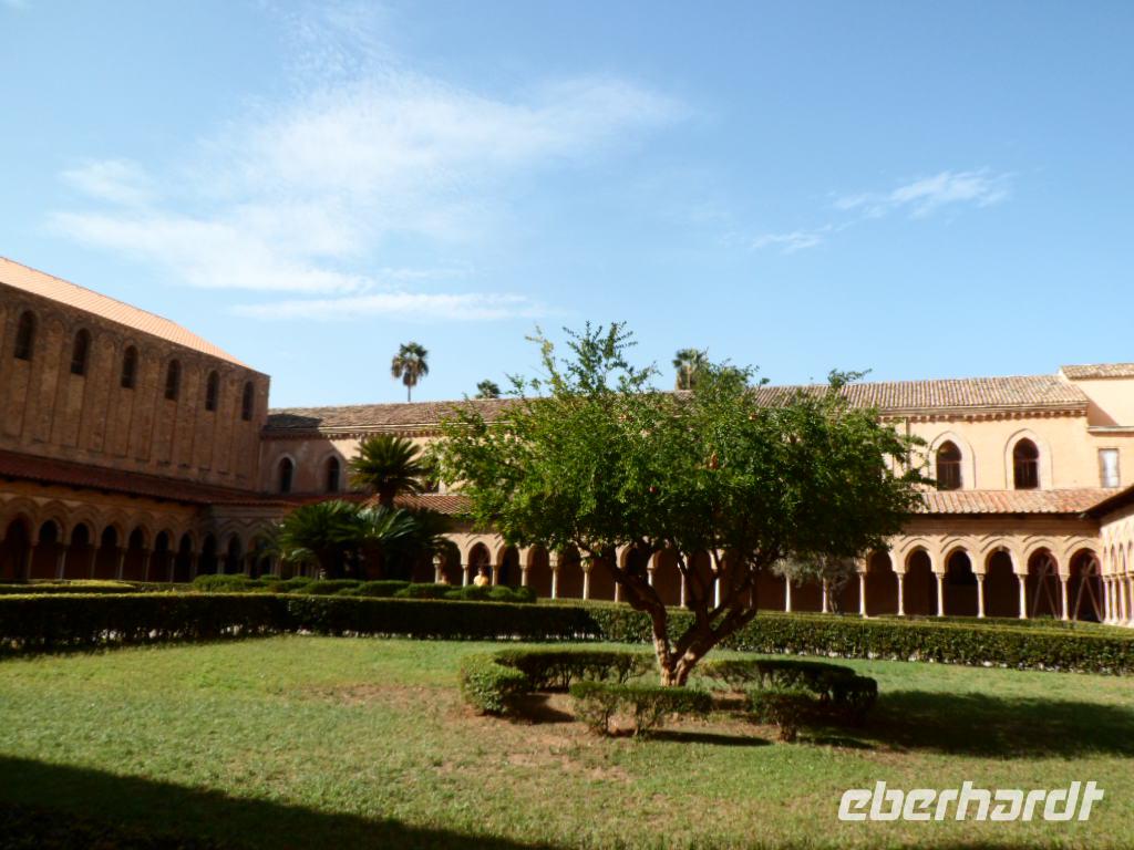 Heute geht es in die Hauptstadt Palermo aber vorher auf den Heiligen Berg "Monreale"auf 300m Höhe. Schon zeitig starten wir, es sind bereits 32°C aber trotzdem sind alle auf die bekannte Kathedrale , die der Normannenkönig Wilhelm II 1174 erbauen ließ. In rund zwei Jahrzehnten enstand dieses herausragende Bauwerk der normannischen Epoche. Die prächtigen Portale und Fassaden geben einen Vorgeschmack auf das Innere mit einzigartigen Mosaikzyklen des alten und neuen Testaments. Alberto konnte uns sämtliche Biderreihen erklären. Auch der Kreuzgang des angrenzenden Benediktinerklosters zählt zu den schönsten der Welt. Wir konnten alles bestaunen und wurden andächtig.