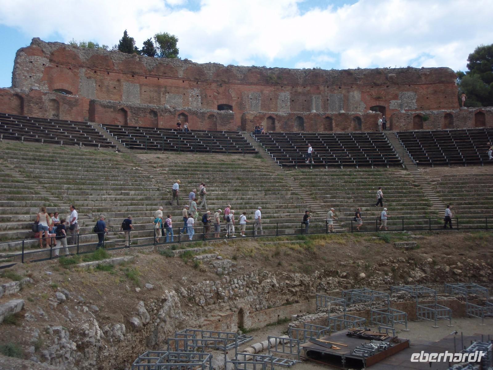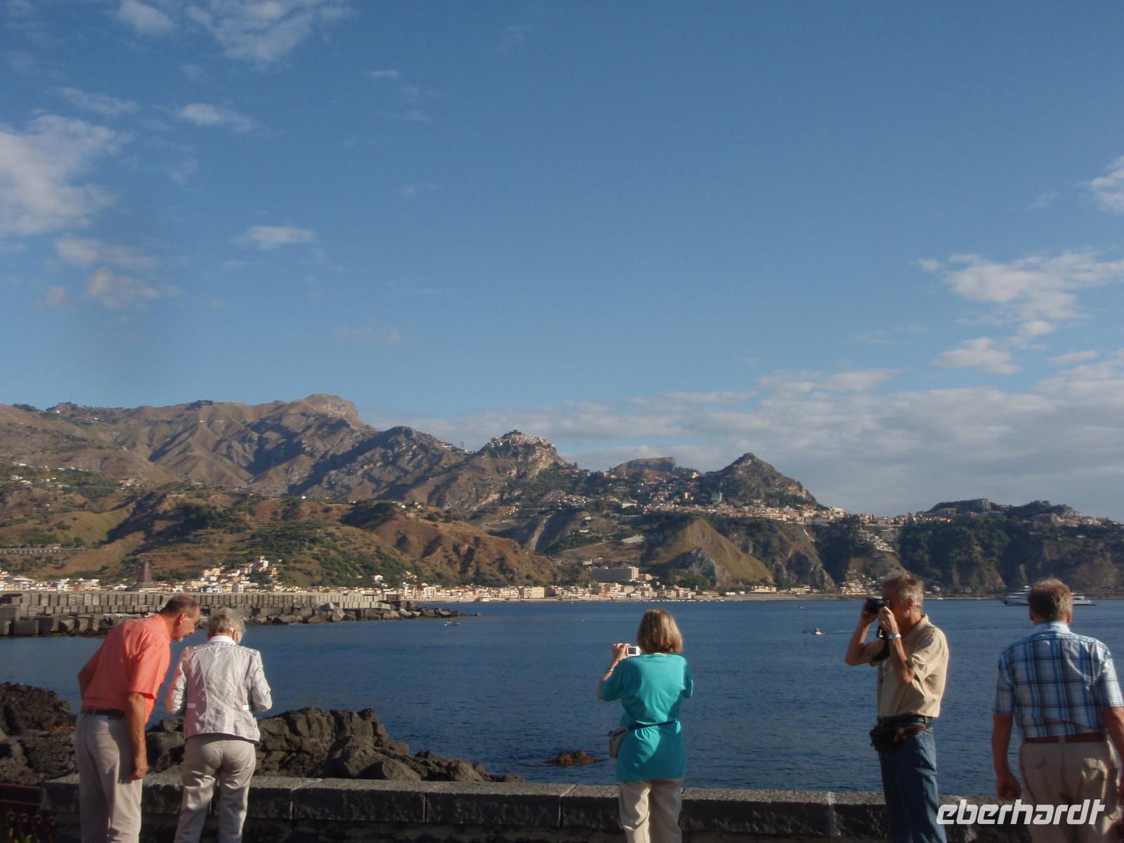 Nach einer erfrischenden Pause im Hotel fahren wir nach Taormina. Taormina ist eine kleine Stadt mit circa 11.000 Einwohnern hoch auf den Terrassen des Monte Tauro, welche sich schon im 19. Jahrhundert zum touristichen Ort entwickelt hat. Heute ist Taormina eine der wichtigsten Touristenzentren Siziliens. Die Achitektur der Stadt stammt aus dem Mittelalter, bis auf das antike Theater, welches im 2. Jahrhundert v. Chr. gebaut wurde.