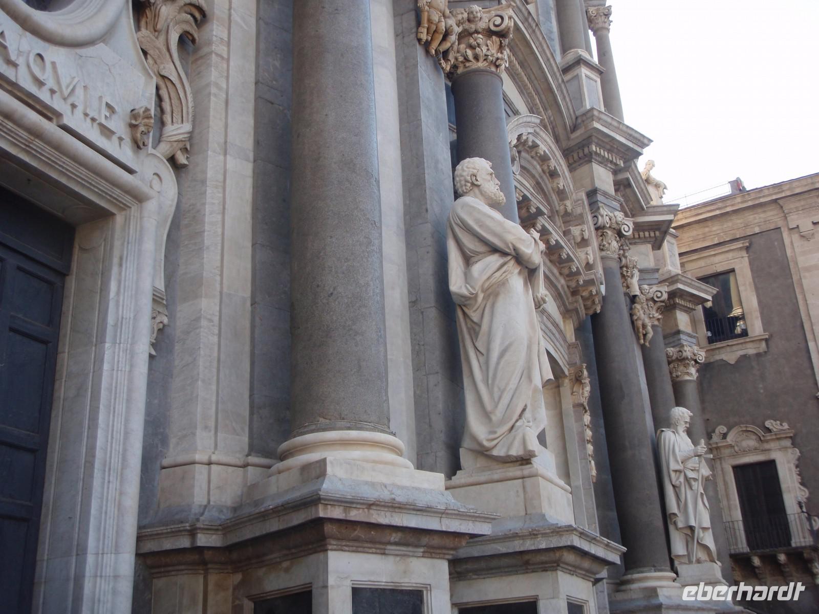 Heute fahren wir nach Catania. Die Stadt, die schon im 8. Jahrhundert v. Chr. eine griechische Siedlung war, ist im 17. Jahrhundert zweimal, wegen Vulkanausbrüchen und Erdbeben, zerstört worden. Nachdem ist sie dann im barocken Baustil nachgebaut worden. Wir laufen vom Busparkplatz bis zum ehemaligen Benedikterkloster San Nicola, wo sich heute der Fachbereich Literatur der Universität Catanias befindet. Das Kloster San Nicola beherbergt auch die Universitätsbibliothek. Danach führt uns Gertrud zur Piazza Duomo und zur Kathedrale Sant'Agata. Die Kathedrale war so gebaut, dass sie auch die Funktion einer Festung ausüben kann. Mehrere Zerstörungen des Gebäudes erklären, warum die Kathedrale jetzt verschiede Baustile, aber am meisten Barock, zeigt.