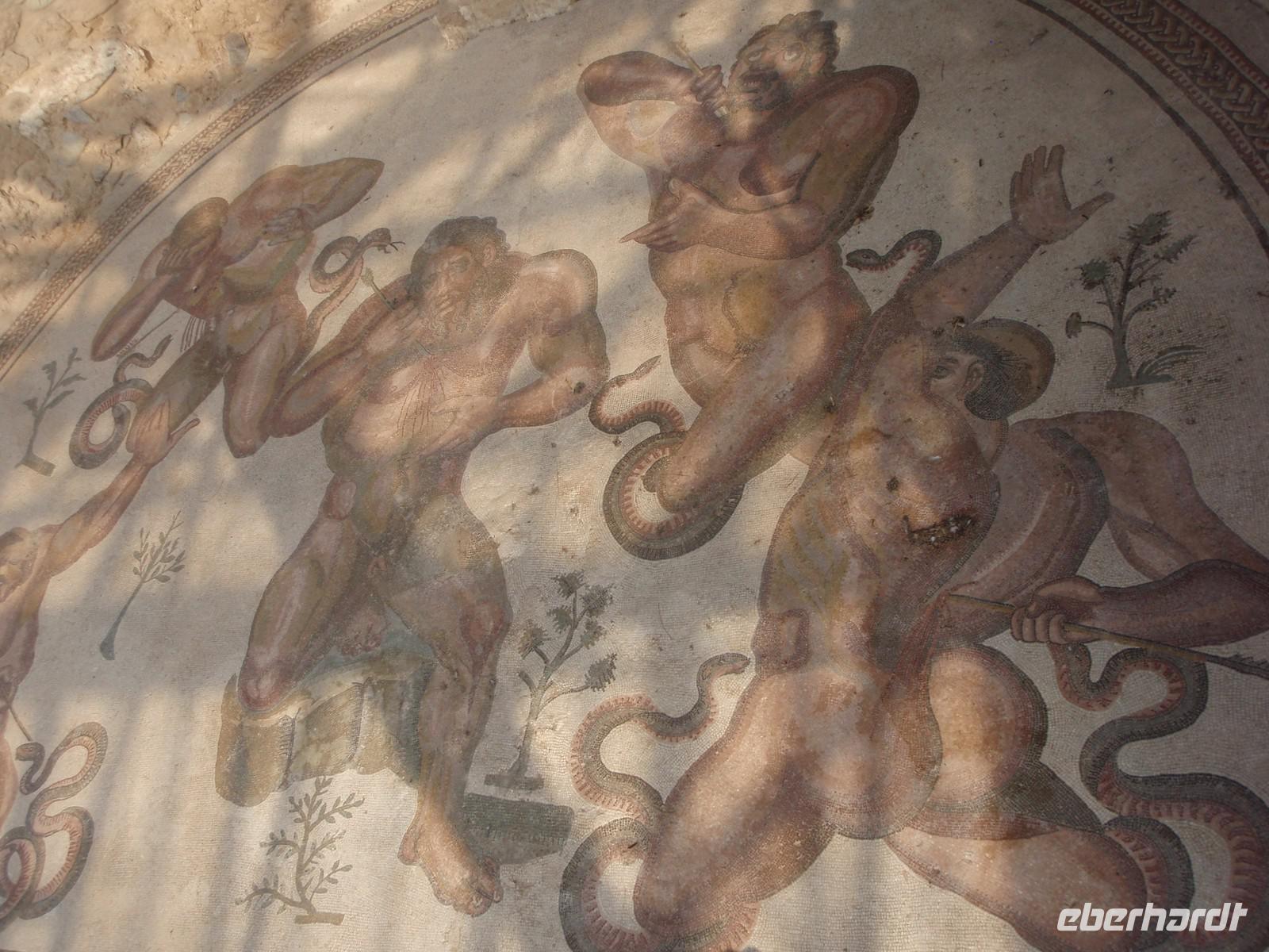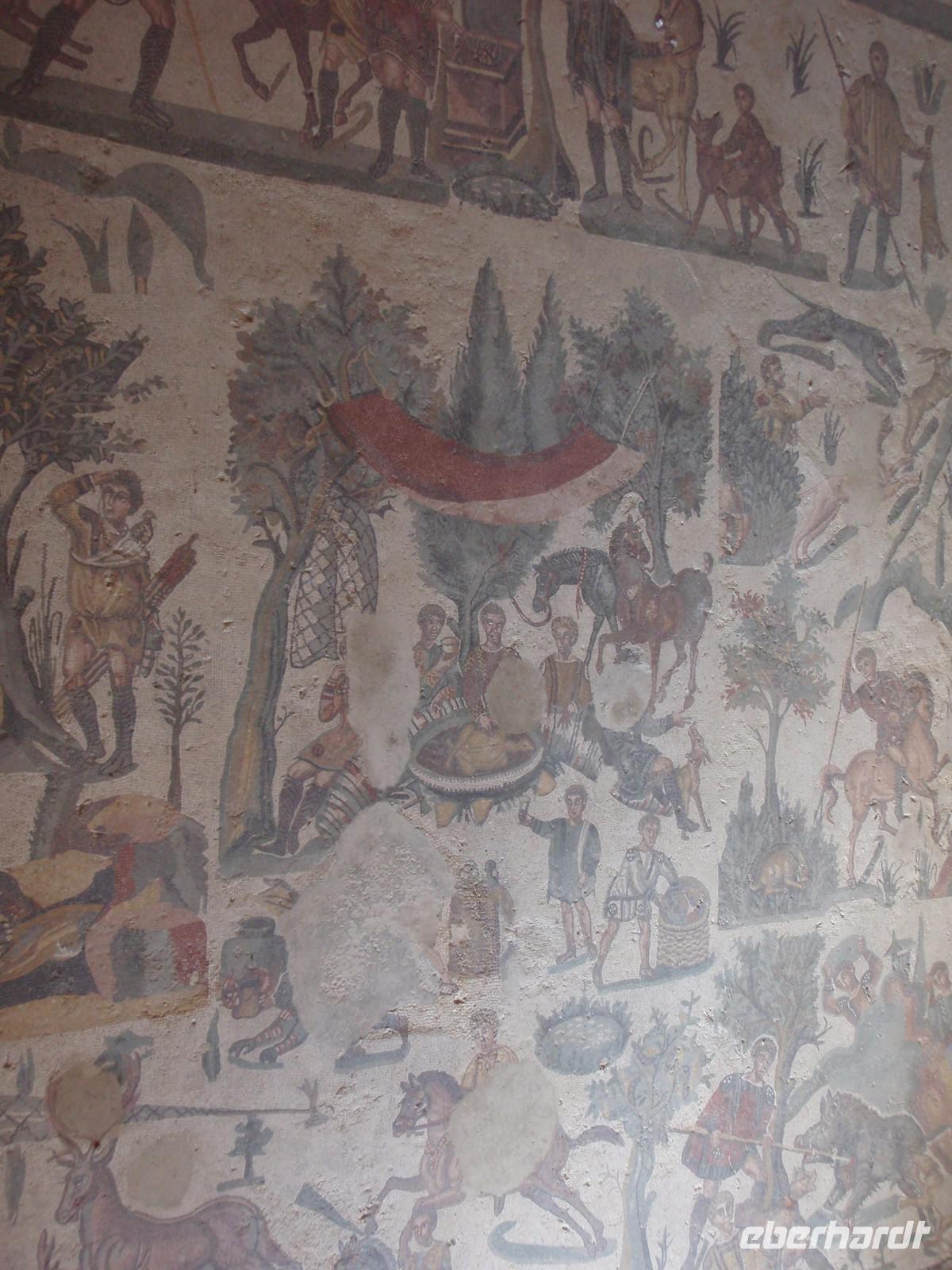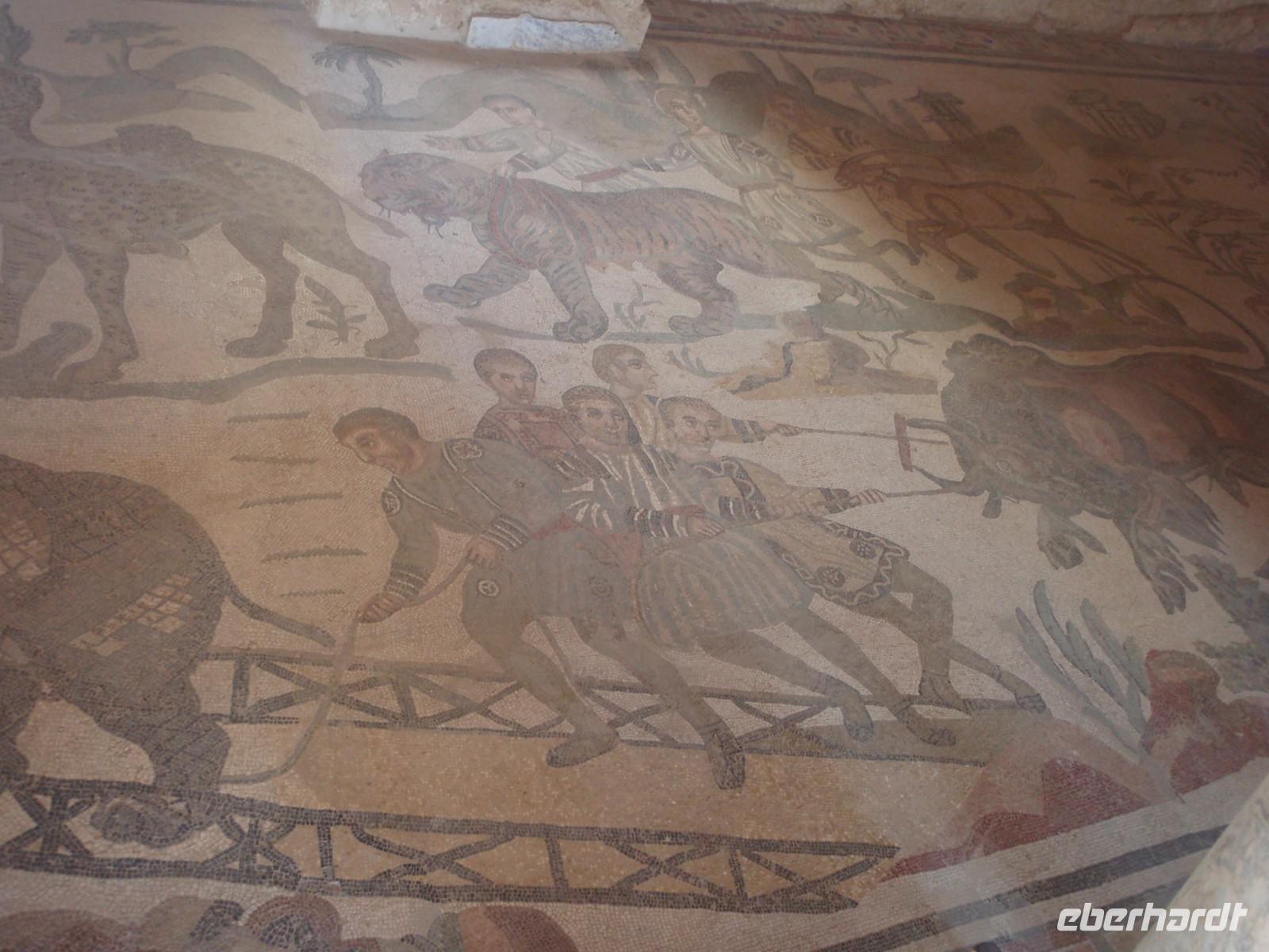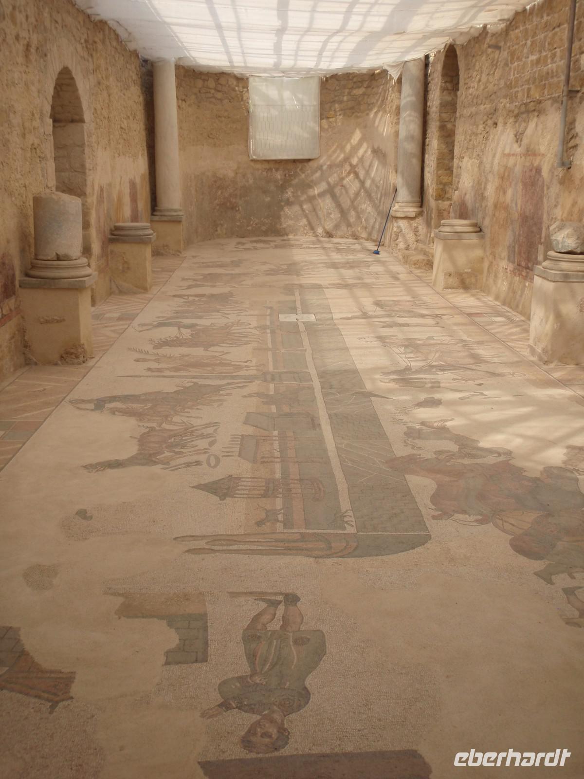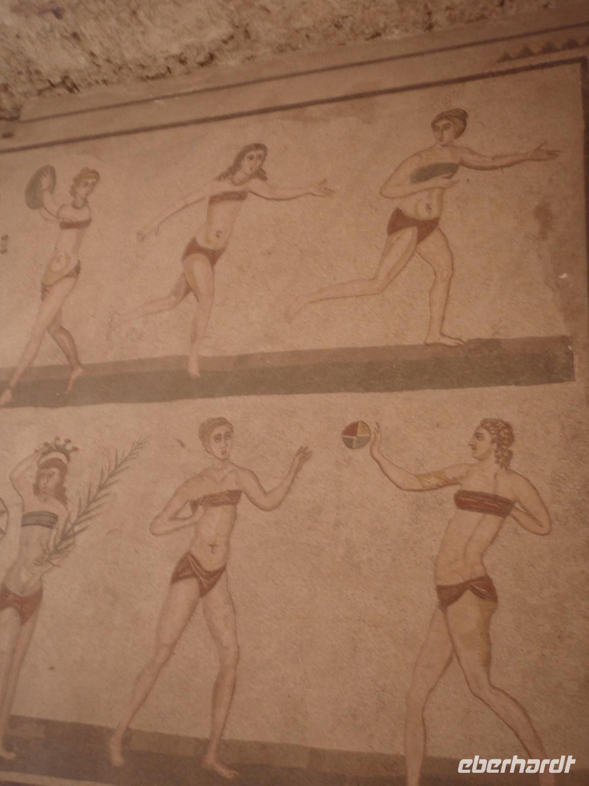 Die Villa Romana del Casale ist sehr berühmt für ihr Bodenmosaik und ist eine sehr wichtige archäologische Anlage in Sizilien. Die Villa ist ein perfektes Beispiel einer römischen Luxusvilla und zeugt von der ökonomischen und sozialen Struktur von damals. Der Komplex ist fast 1,5 Hektar groß und bis heute sind 45 Räume aufgedeckt, die ihren Fußboden fast alle mit Mosaik bedeckt haben. Diese Villa ist unglaublich: unglaublich zu denken, dass solch prächtige Häuser gebaut wurden. Die Besucher waren wahrscheinlich sehr verängstigt, als sie in diese Villa eingetreten sind. Die Munster der Mosaike sind vielfältig: von Arbeiten Herkules´ bis zu Szenen exotischer Jäger und Bikinimädchen; und immer noch sehr gut erhalten.