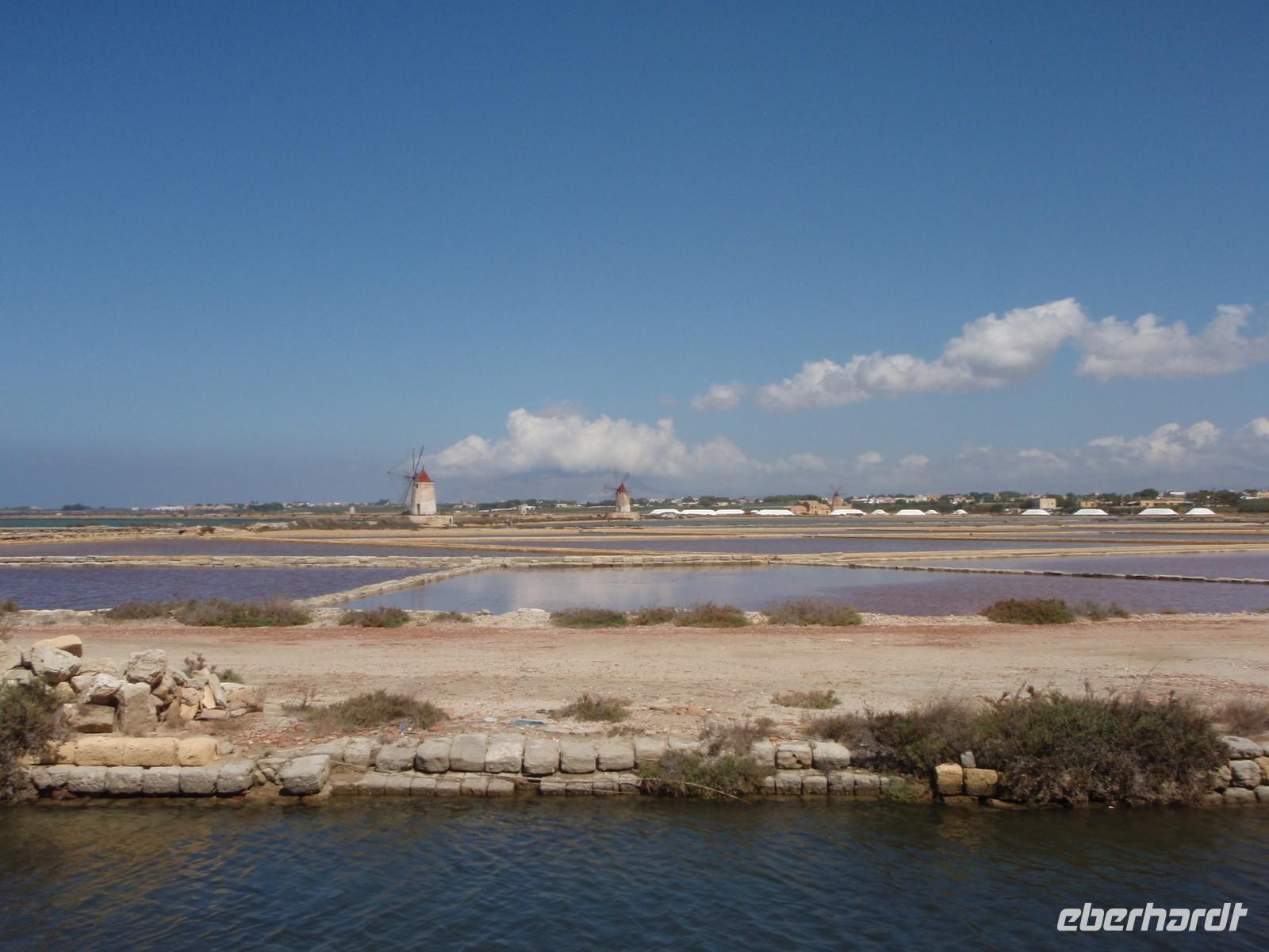 Wir halten an einem Salzmuseum, wo wir sehr ausreichende „Kleinigkeiten" zu essen bekommen. Wir kosten die Geschmäcker der südeuropäische Küche : Ölivenöl, Knoblauch, Tomaten, Mozarella, Hering und schwarze Oliven. Als Nachspeise bringen uns die Kellner Weintrauben und Quarktaschen, welche vielen von uns sehr geschmeckt haben. Der Ort ist mehr ein Restaurant am Rand eines Salzgartens als ein Salzmuseum. Wir entscheiden uns gegen die Eintrittskarten für das Museum (es gibt nicht viel mehr zu sehen als was uns Gertrud schon gezeigt hatte) zu besichtigen lieber die Außenanlage und schießen ein paar Fotos und gehen spazieren. Anschließend führt uns der Bus Richtung Erice.
