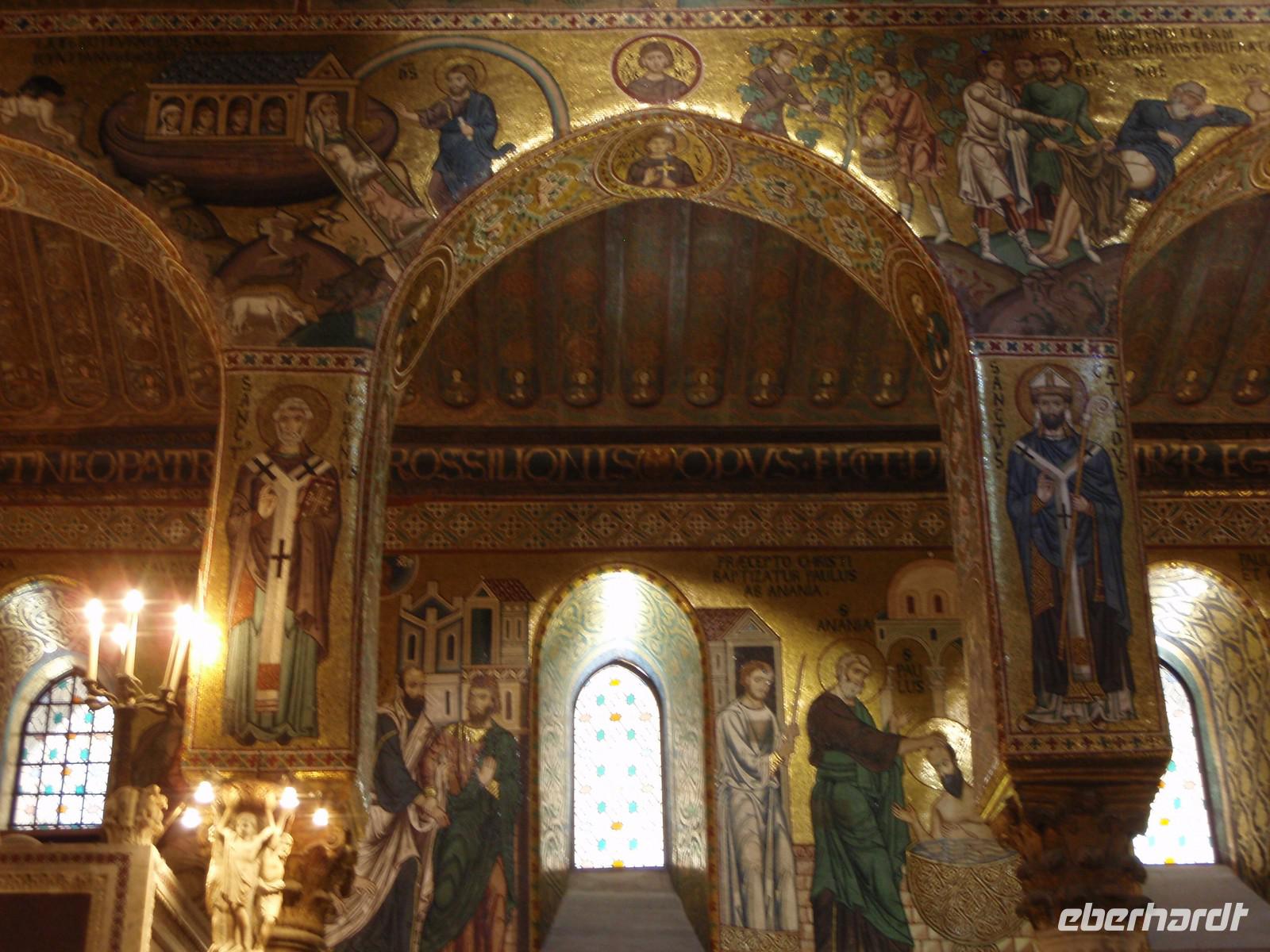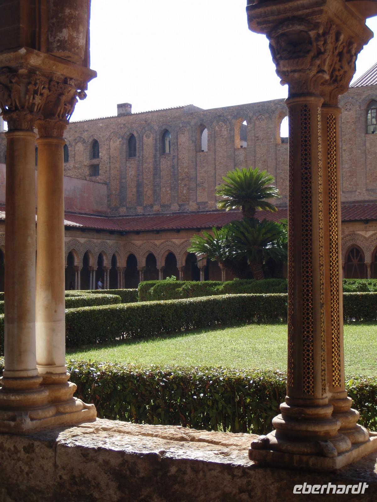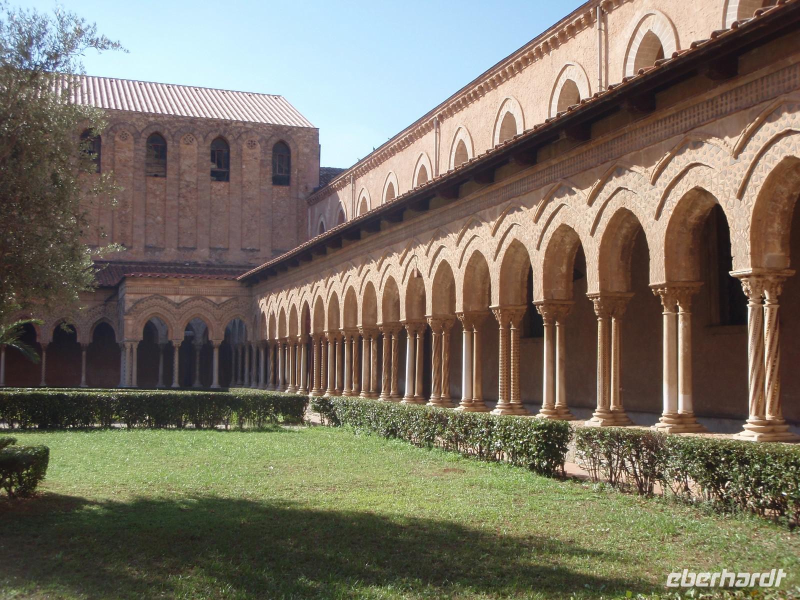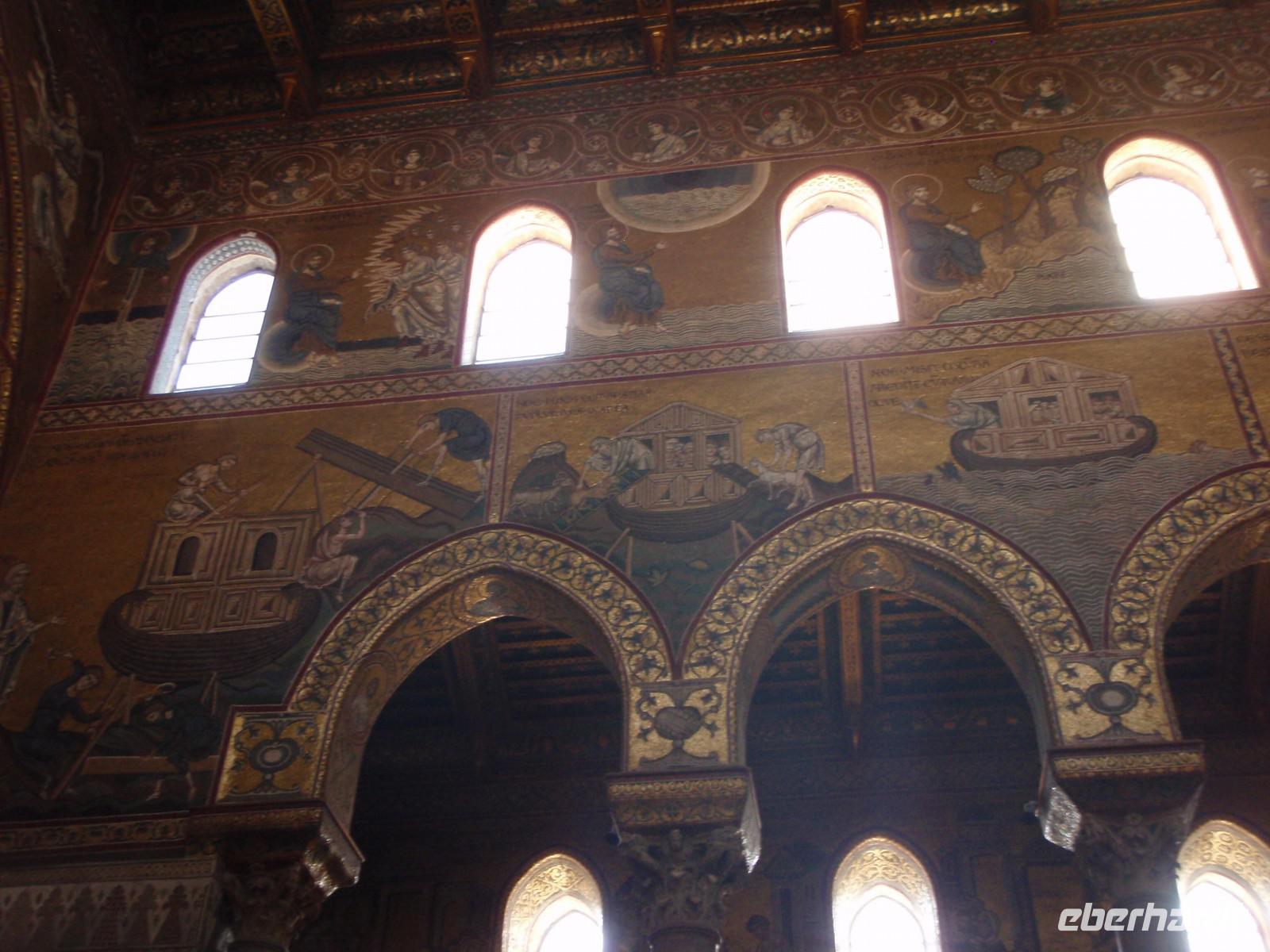 Die Kathedrale von Monreal ist wirklich ein Kunstwerk. Der Baustil fasst die drei Kulturen, die in der Geschichte Sizilens wichtige Einflüsse gelassen haben : normannische, bizantinische und arabische. Der untere Teil der Wände in der Kathedrale sowie der Fußboden sind mit Marmor verkleidet, nach der islamischen Tradition. Der obere Teil der Kathedrale besteht komplett aus Mosaik, die Flächen bedeckt von Mosaiken ist ungefähr mit 6.340 m² bemessen. Die Mosaike zeigen Szenen von Genesis, Buch des Alten Testaments, aber auch die Schöpfungsgeschichte, die Vertreibung aus dem Paradies sowie Teile vom Leben Noahs, Abraham, Isaak und Jakob. Die Kathedrale hat mir sehr gut gefallen. Ich fand das Kunstwerk sehr beeindruckend und ihre Architektur sehr imposant. Danach haben wir auch das Kloster besucht, welches sehr ruhig und auch schön ist.
