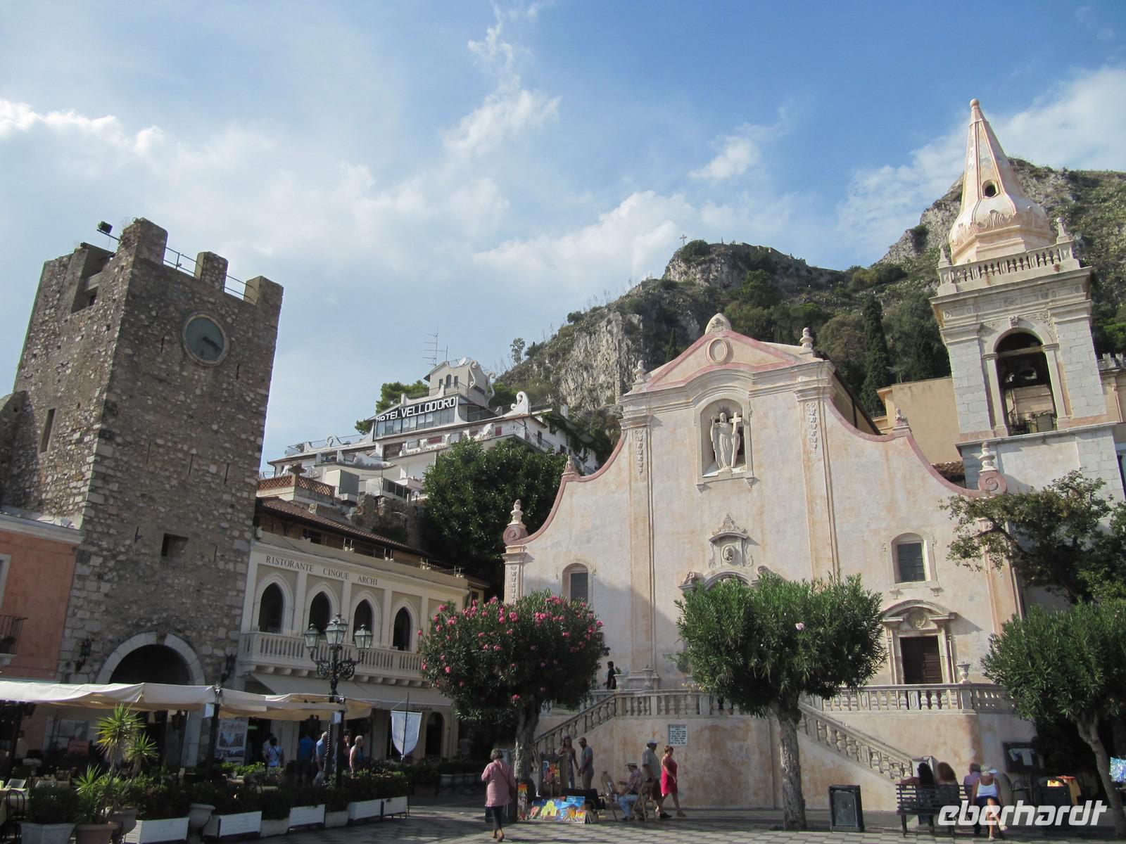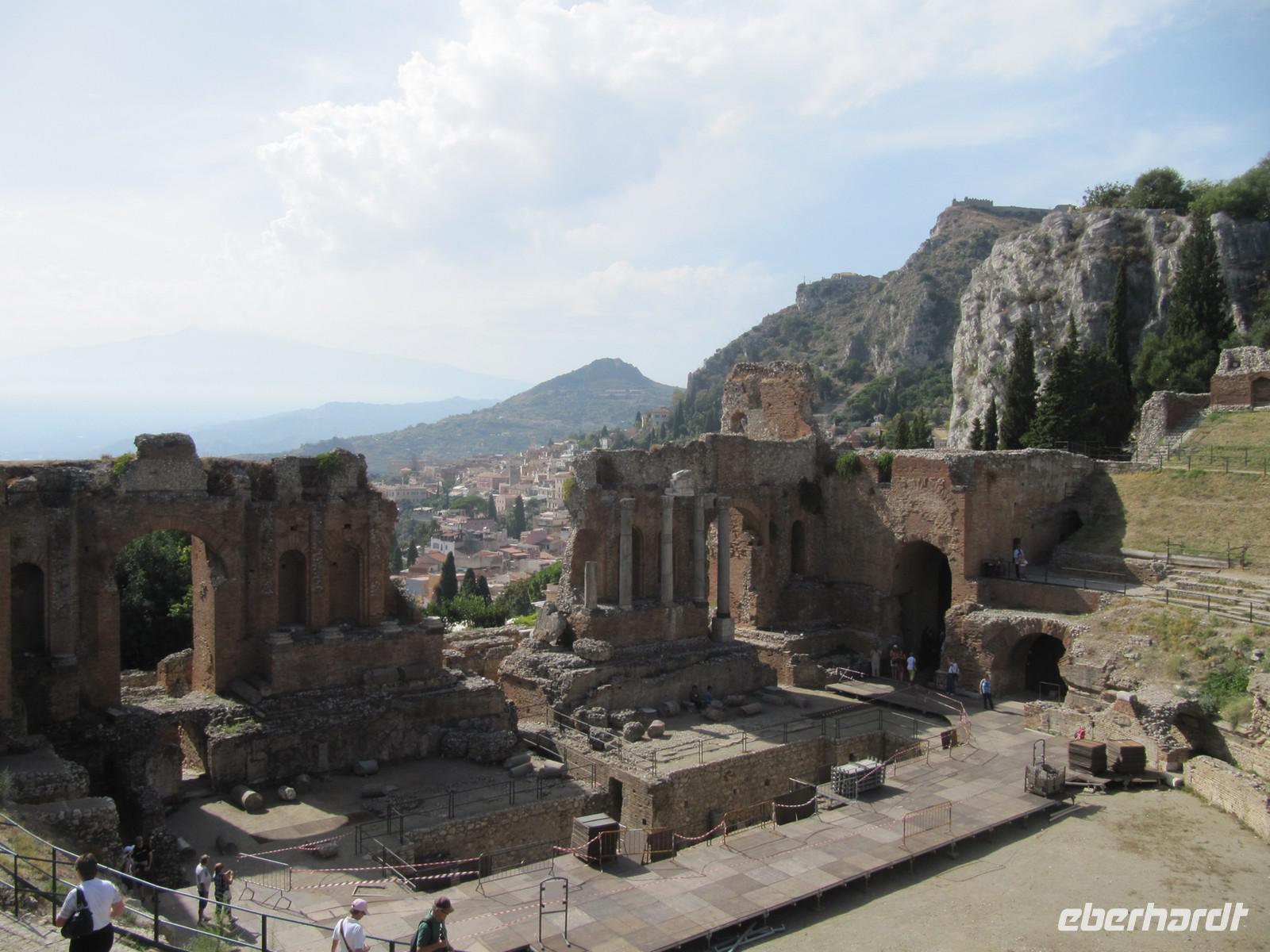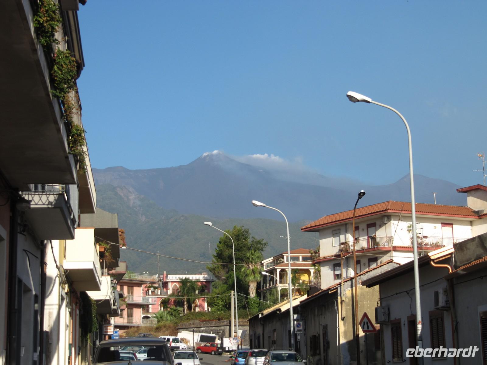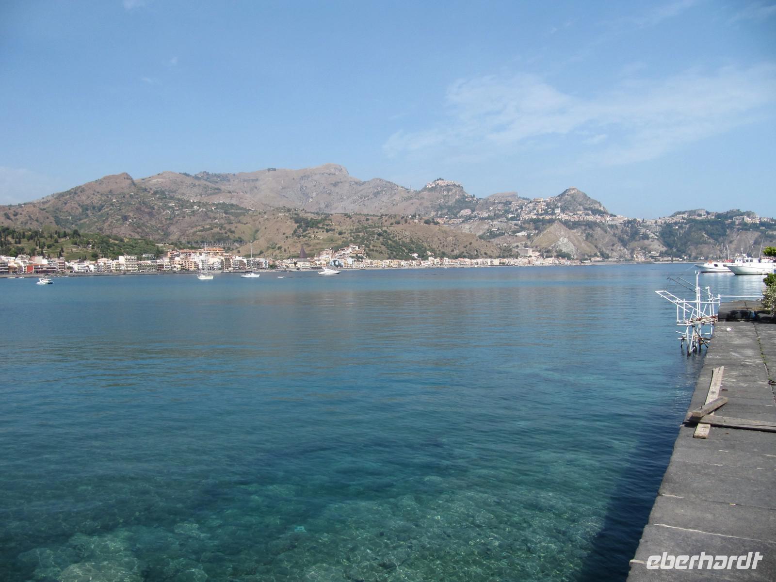 Mitten in der Nacht werden wir von Transferfahrzeugen zu Hause abgeholt und zum Flughafen nach Berlin-Tegel gebracht. Mit einer kleinen Gruppe von 18 Personen fliegen wir mit der Air Berlin nach Catania und können vom Flieger den Ätna begrüßen. Unser sizilianischer Führer Alberto erwartet uns gegen 11 Uhr am Flughafen und unser sizilianischer Bus mit Mauro am Steuer bringt uns zuerst zu einer Mittagspause nach Giardini Naxos an den Hafen, da wir unser Hotel Naxos Beach Resort noch nicht beziehen können. So machen wir gleich heute unsere Stadtbesichtigung in Taormina, und haben so die Möglichkeit, morgen zusätzlich zum Programm nach Syrakus zu fahren. Am späten Nachmittag unternehmen noch einige Gäste ein Bad im Pool oder Meer.