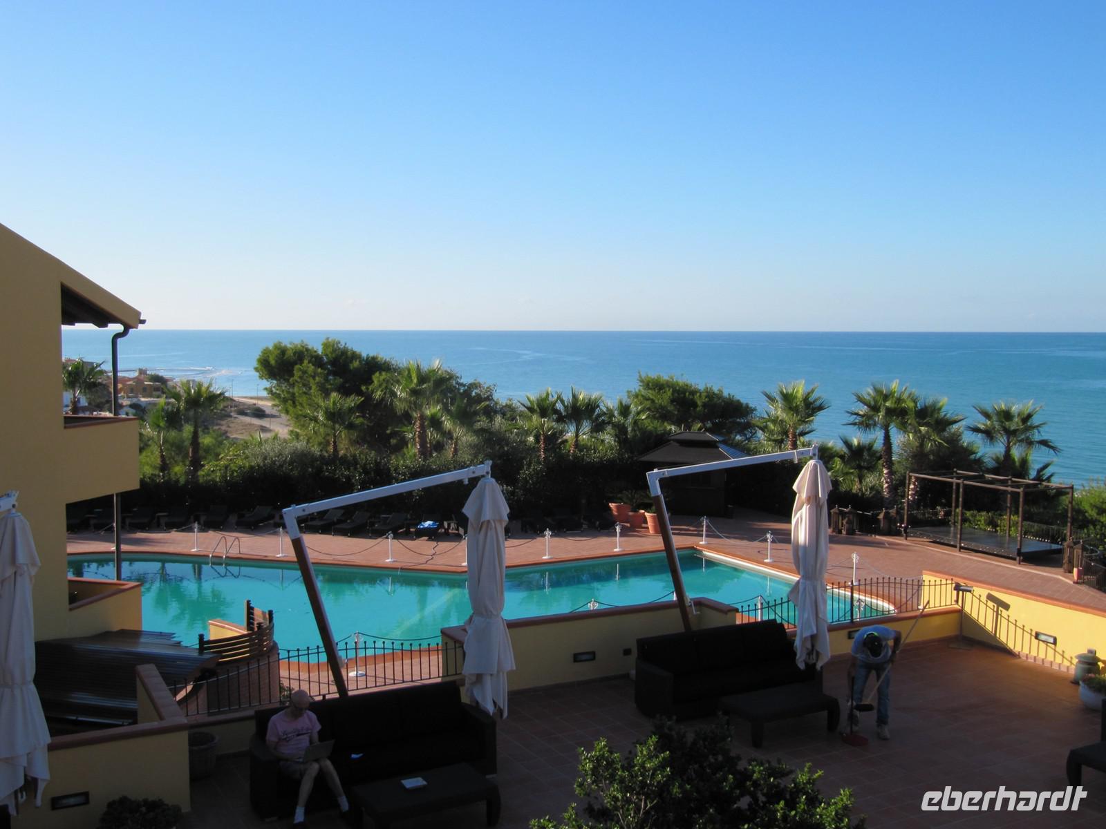 Heute bringt uns Alberto zuerst nach Monreale, wo wir den berühmten Normannendom besichtigen. Er ist über und über mit herrlichen Mosaiken verkleidet. Im beeindruckenden Kreuzgang des Benediktinerklosters bewundern wir die Doppelsäulen mit den kunstvollen Kapitellen. Unser Bus bringt uns nach Palermo. Wir bestaunen im Normannenpalast die Cappella Palatina. Alberto zeigt uns auch den Normannendom, doch die bekannte Grablege mit den Sarkophag vom Stauferkaiser Friedrich II. findet kein Interesse. Nach einer kleinen Stadtrundfahrt und Mittagspause im Zentrum der Stadt kommen wir heute etwas früher im Hotel an und können noch baden oder in der herrlichen Anlage spazieren.