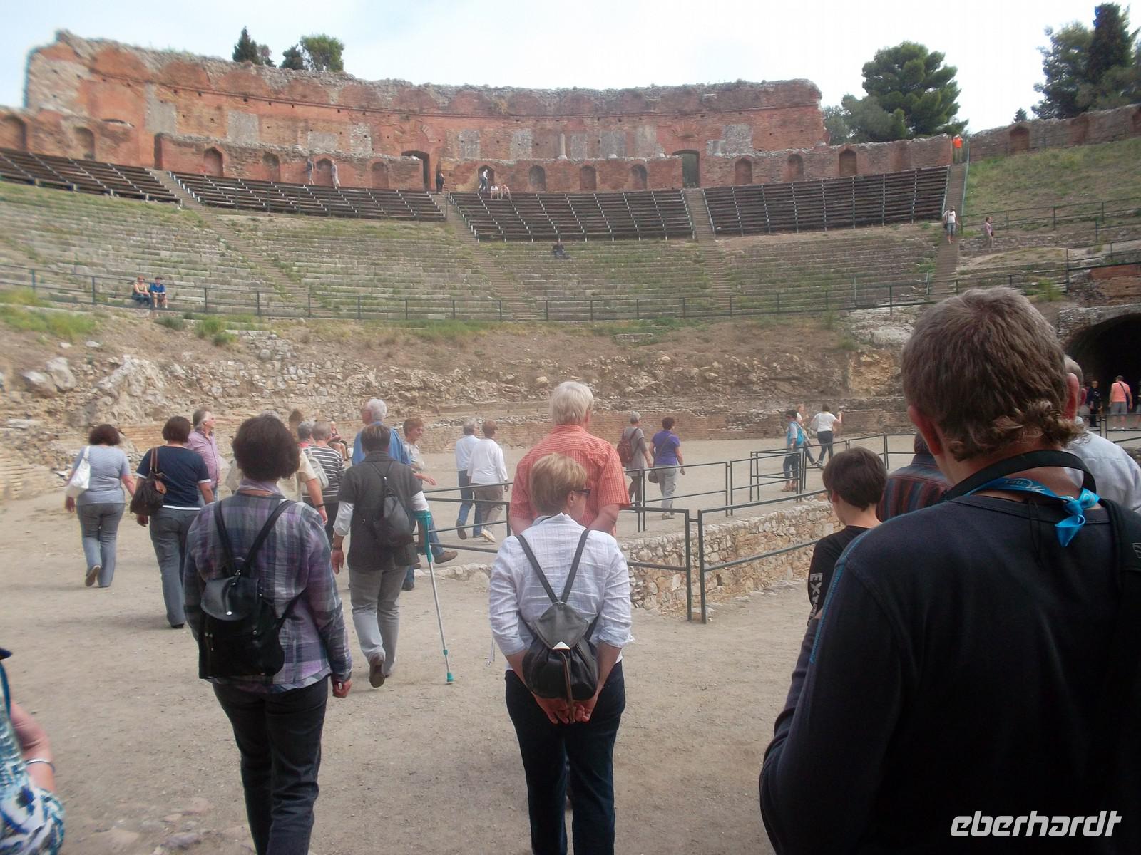 Der Parkplatz dieser Ferienstadt ist in den Felsen gesprengt und unser Bus lieferte uns hier pünktlich gegen 13.00Uhr am Treffpunkt mit der örtlichen Reiseleitung ab: mit unserer örtlichen Reiseleiterin Gertraud fuhren wir mit dem Shuttlebus vom Parkhaus nach Taormina. Zunächst stand hier das antike Theater auf dem Programm, nach dem von Syrakus das zweitgrößte auf Sizilien und als „Teatro Greco" bezeichnet. Ungeachtet der griechischen Herkunft und Tradition ist der heutige Erhaltungszustand der des römischen Baues, über einem kleineren von den Griechen erbauten Theater errichtet. Erst beim Umbau in eine Arena im 2. Jahrhundert n. Chr. wurde der Zuschauerraum erweitert. Das Theater diente ursprünglich zur Aufführung von Schauspielen, später dann fanden nur noch Gladiatoren- und Tierkämpfe statt.