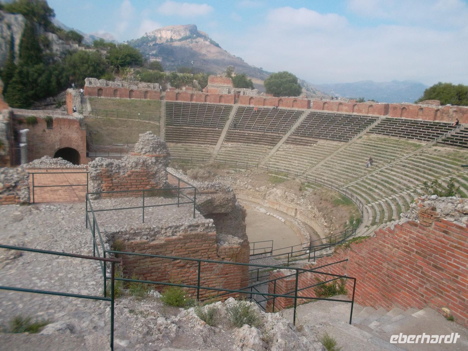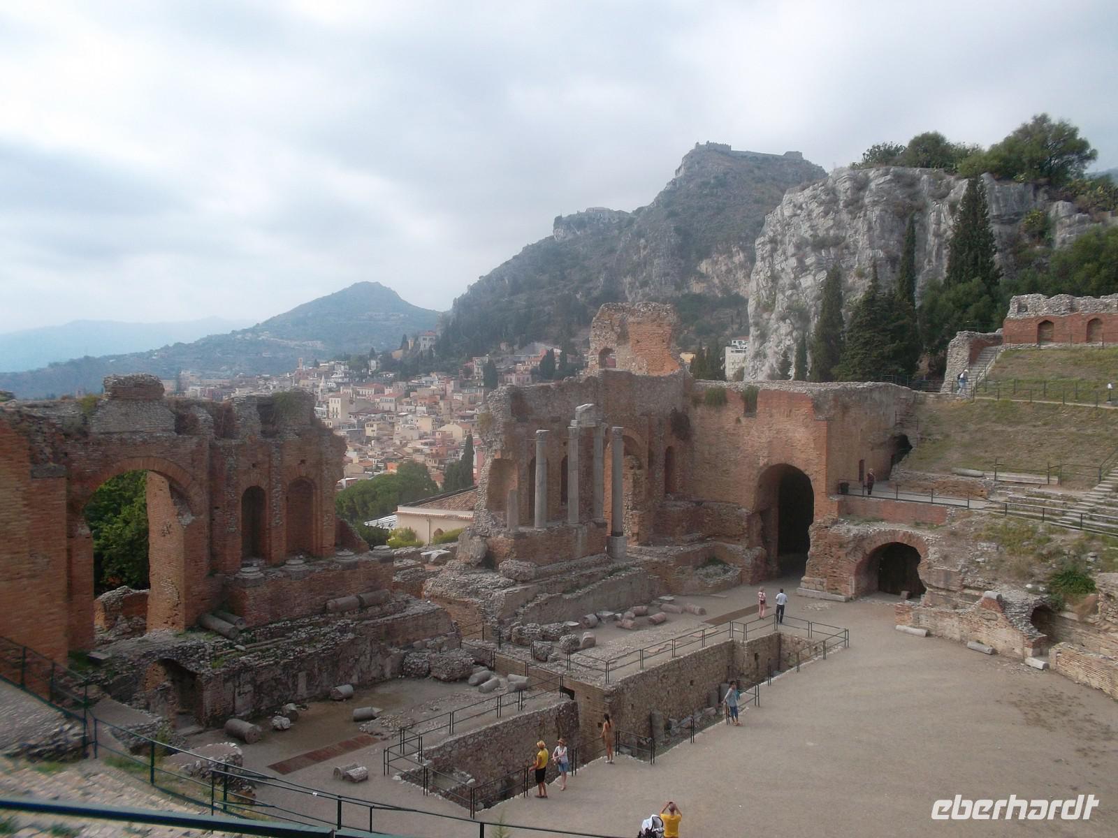120 m lang, 50 m breit und 20 m hoch ist das eigentlich ältere griechische Theater in den Hang eingebettet - während römische Theater ansonsten freistehende Bauten waren. Die terrassenartig angelegte Tribüne, teilweise in den Fels geschlagen, bot einst Platz für etwa 5000 Zuschauer. Das Bühnengebäude, erst in römischer Zeit aus Ziegeln errichtet, zeigt zur Zuschauerseite eine zweigeschossige Schaufassade mit Nischen. Einst standen hier Statuen und Säulen - erst im 19. Jahrhundert wurde alles wieder teilweise restauriert. Die breite Öffnung gab und gibt den Blick frei auf den Ätna und die Bucht von Giardini-Naxos. Wir erlebten ein nahezu unvergleichliches Bühnenbild - getrübt allerdings durch die Tatsache, dass die Naturkulisse Ätna mehr zu ahnen als zu sehen war.