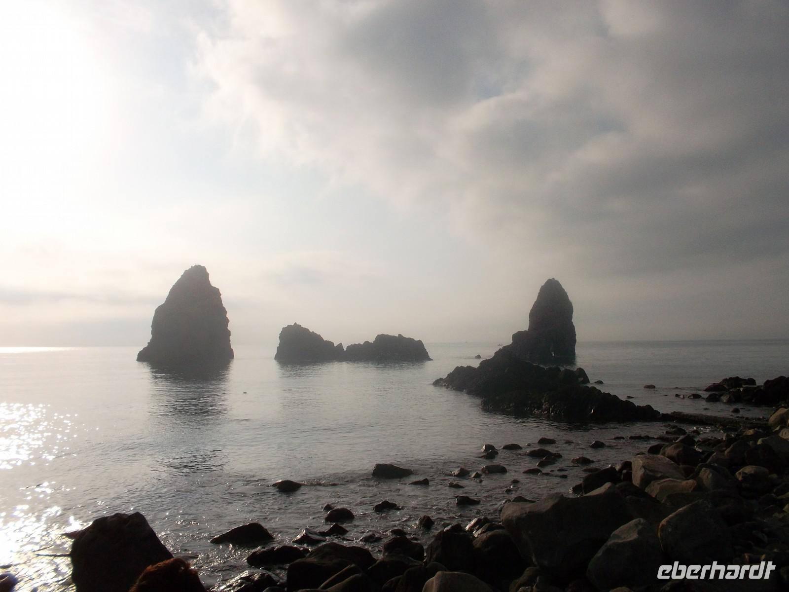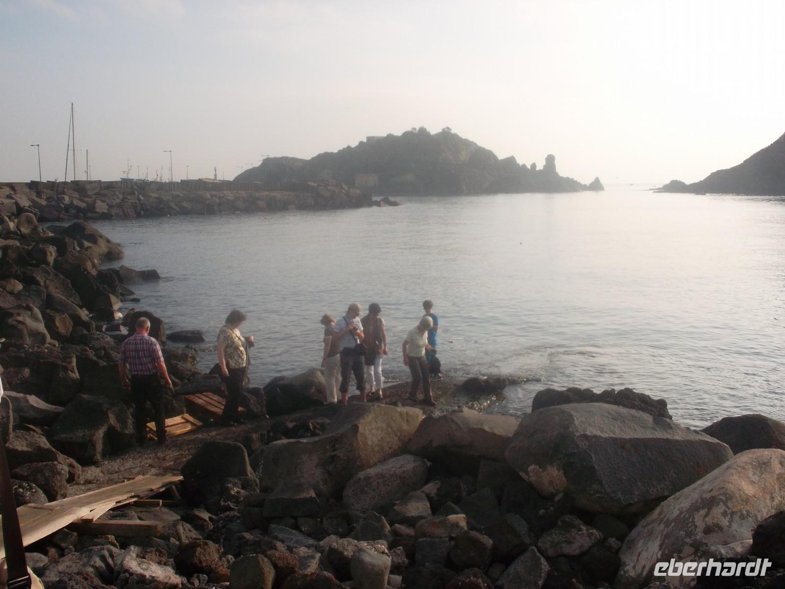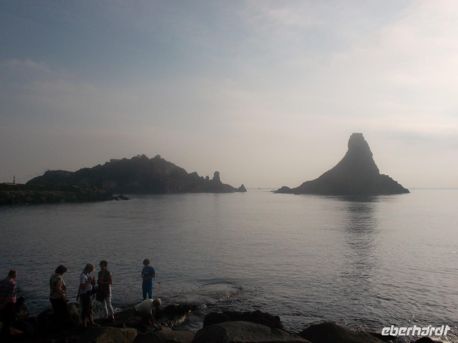 Als zusätzliches Extra nahmen wir dann statt der schnelleren Autobahn direkt die Küstenstraße - denn hier bieten in Aci Trezzo, dem Schauplatz der alten Odyssee-Legende, die „Zyklopenfelsen" bis heute ein interessantes Fotomotiv! Busfahrer Angelo hielt am einzig möglichen Parkplatz und wir bekamen die herrlichen Felsen vor die Kamera! Der Legende zufolge soll der einäugige Zyklop Polyphem diese Felsen voller Wut dem fliehenden Odysseus nachgeschleudert haben.