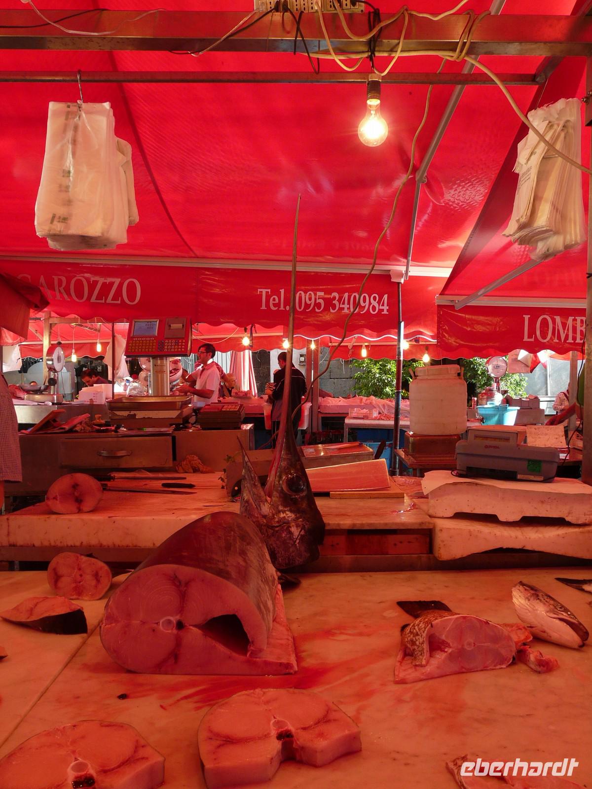 Nach dem Fotostopp erreichten wir bald unser erstes Ziel: Catania. Siziliens zweitgrößte Stadt ist nicht nur Industriestandort, sondern in ihrem barocken Erscheinungsbild auch ein Kleinod des Städtebaues. Dabei hat der nahe Ätna die Stadt immer wieder zerstört und letztlich auch für Catanias heutiges Aussehen gesorgt: nachdem 1669 ein Lavastrom die Stadt fast vernichtet und 1693 ein schweres Erdbeben selbst die Kathedrale zerstört hatte, errichtete man Catania vorwiegend im Stil des römischen Barock unter der Federführung des Baumeisters Giovanni Battista Vaccarini wieder. Beeindruckend spiegelt der zentrale Domplatz diese Epoche wieder, der die Stadt auch seit 2002 ihren Status als UNESCO-Weltkulturerbe verdankt. Wir sahen hier nicht nur den berühmten Elefantenbrunnen, das Wahrzeichen Catanias, sondern gingen auch durch die Altstadt mit ihren Kirchen- und Palastfassaden bis zum Castello Ursino, einer Stauferburg des 13.Jh., die beim großen Ätna-Ausbruch 1669 als einziges Gebäude auf einer Insel in der Lava stehen geblieben war. Dann jedoch spielte für die meisten ein Bummel über „la pescheria", den berühmten Fischmarkt von Catania, eine Rolle. Vielleicht ist DAS hier Europas exotischster Markt - neben Fisch in allen Größen und Variationen, vom fingernagelgroßen Weißfisch bis zum drei Meter langen Schwertfisch, finden sich Fleisch, Käse, Wurst, Gemüse und natürlich Obst in den Gassen, Plätzen und Straßen nahe dem Domplatz.