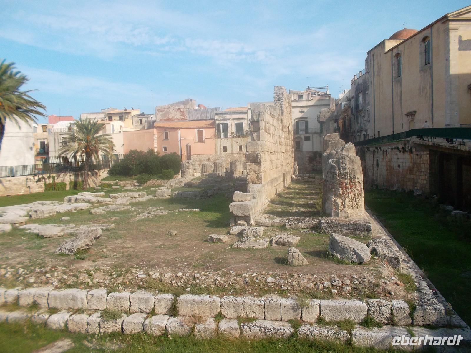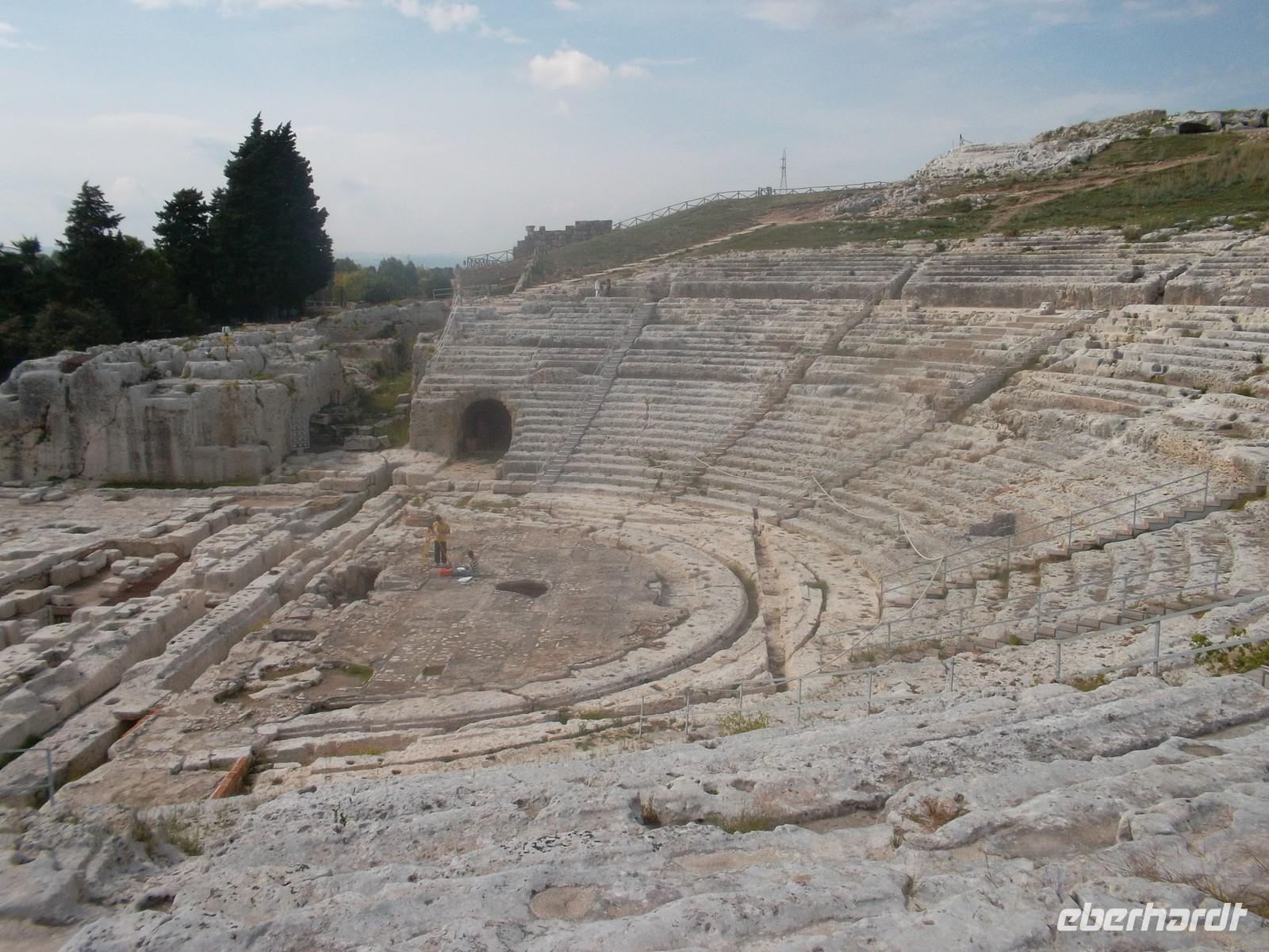 Gegen Mittag ging es weiter nach Syrakus - als von allen gebuchter Zusatzausflug ins Programm genommen. Der Bus brachte uns zunächst an den Rand der archäologischen Zone. Seit langem ist Syrakus ein Highlight auf der UNESCO-Weltkulturerbe-Liste - mit der Begründung, „dass die Orte und Bauwerke, die das Ensemble Syrakus/Pantalica bilden, eine einzigartige Ansammlung bemerkenswerter Zeugnisse der Mittelmeerkulturen über die Jahrhunderte an derselben Stelle darstellt." (Zitat wikipedia).