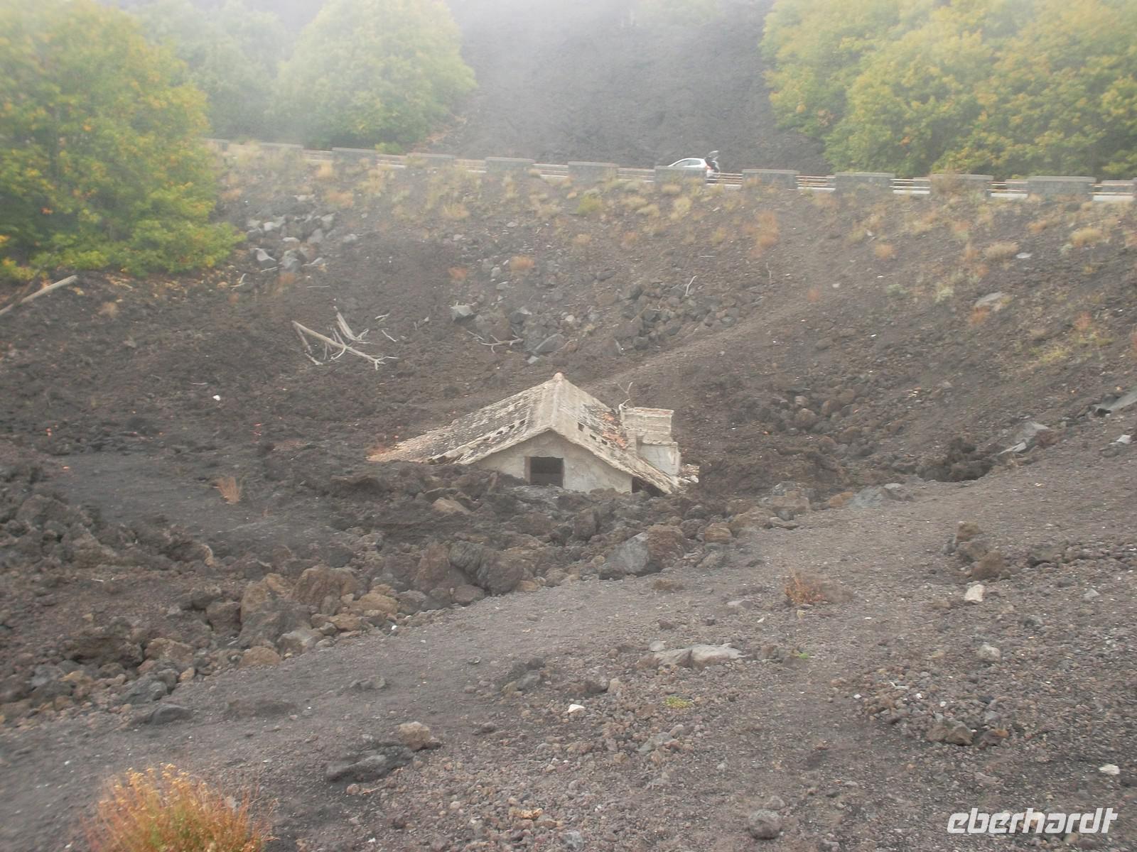 Wir hatten genügend Zeit für den Vulkan und dann noch für den Kauf des einen oder anderen unerlässlichen Souvenirs, wobei die „Süßigkeiten" vom Vulkanhang - Mandel-, Nuss- und Pistaziencreme - fast immer einen vorderen Platz einnehmen. Gegen Mittag, nach der Rückkehr zum Bus, gab es noch einen Fotostopp an einem der vielen Häuser, die der Vulkan vereinnahmt hatte - zwar gibt es viele davon, aber dieses ist besonders fotogen.