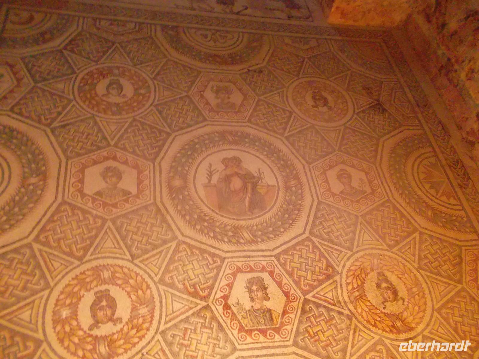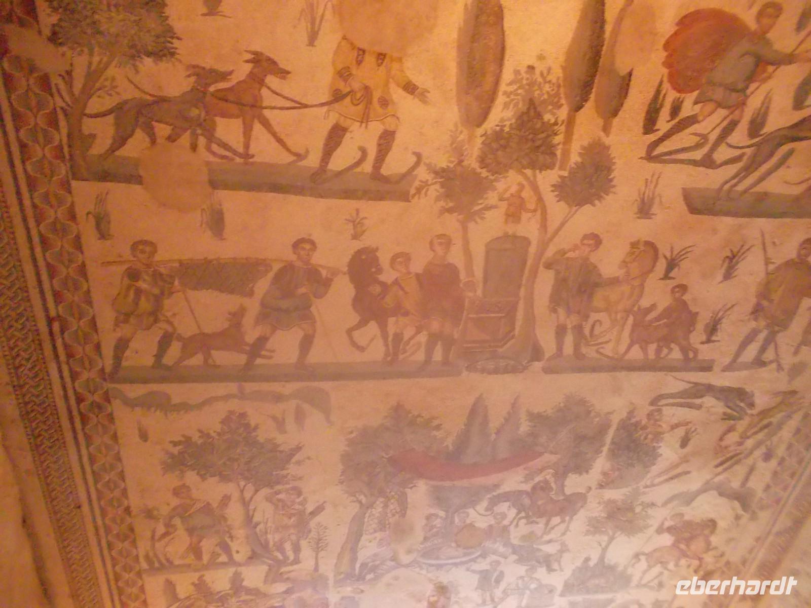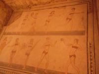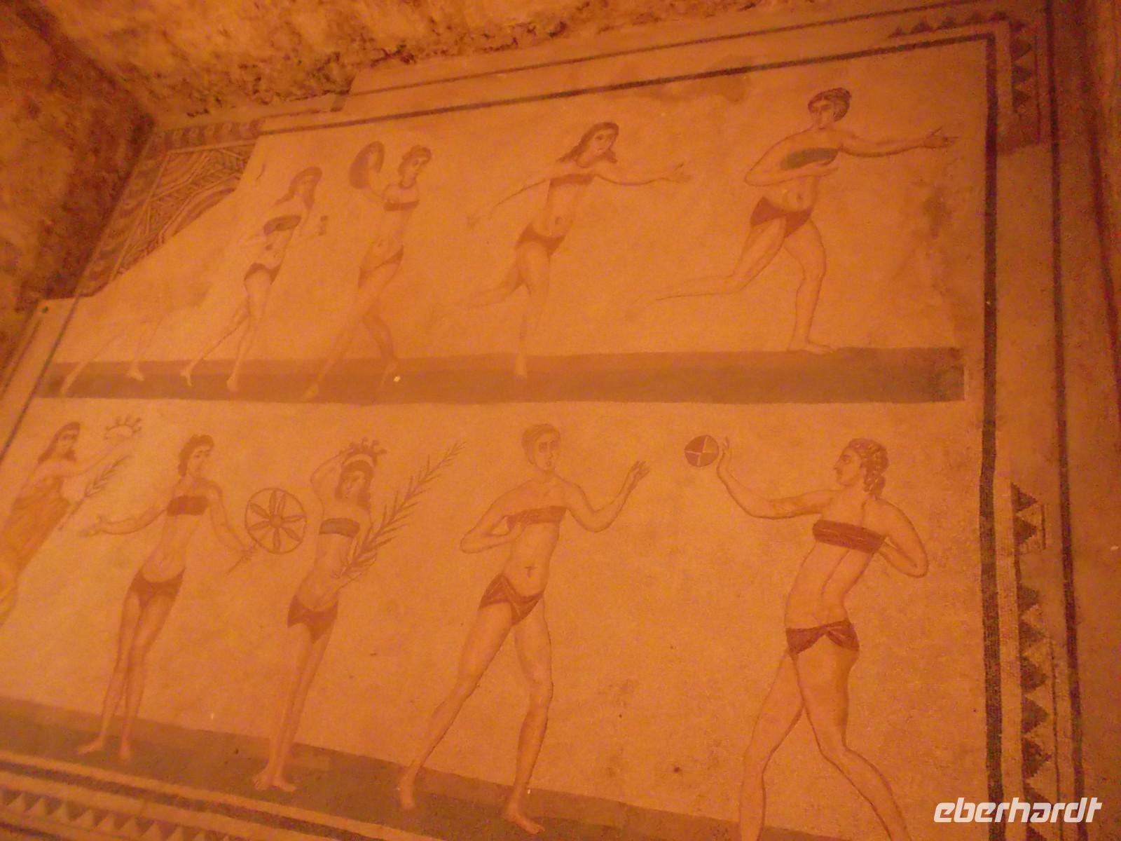 Der Bus brachte uns nun nach Piazza Armerina, jener Stadt, die für ihre etwas außerhalb gelegene römische Villa mit phantastischen Bodenmosaiken berühmt ist. Gerade frisch restauriert, zeugen die etwa 2000 Jahre alten Mosaik-Kunstwerke auf mehr als 3.500 m² Fläche von Kunstfertigkeit, Einfallsreichtum und Solidität ihrer Errichter. Seit langem ist die Villa mit ihren unschätzbaren Kunstwerken, zu denen Jagdszenen, mythologische Stoffe und natürlich die berühmten „Bikini-Mädchen" gehören, Bestandteil des UNESCO-Weltkulturerbes. Führerin Giusy brachte uns in ihrer charmanten Art all diese Kunstwerke und die Intentionen der Künstler vergangener Epochen nahe, bevor wir zur Übernachtung in unser Hotel nahe Agrigent fuhren,