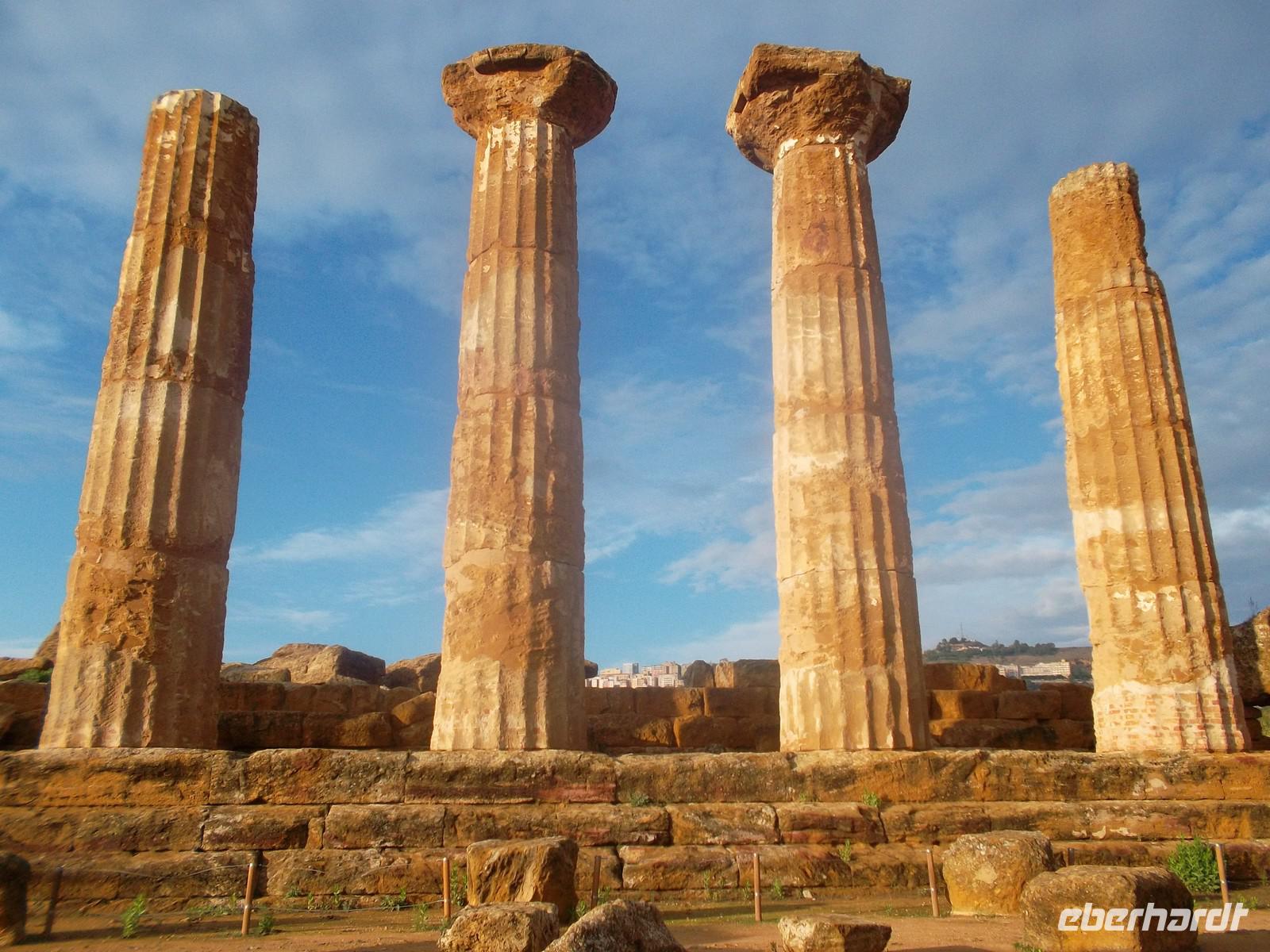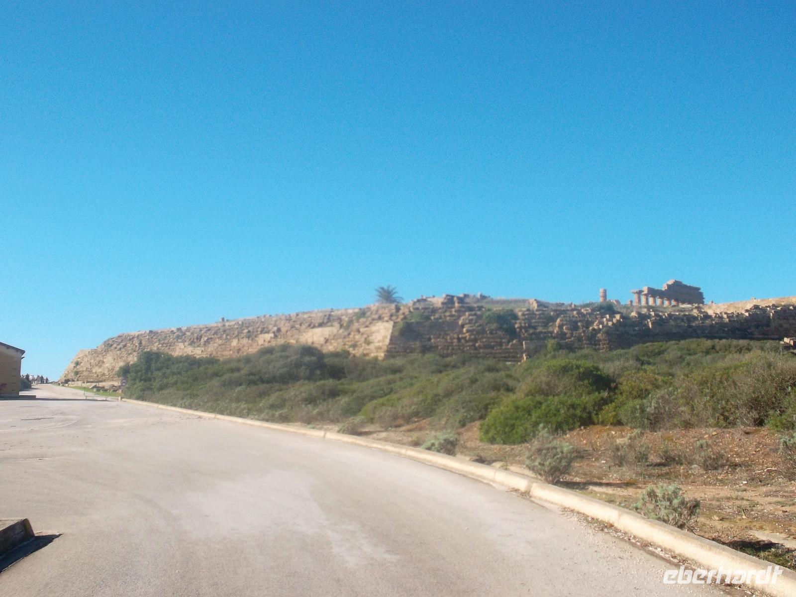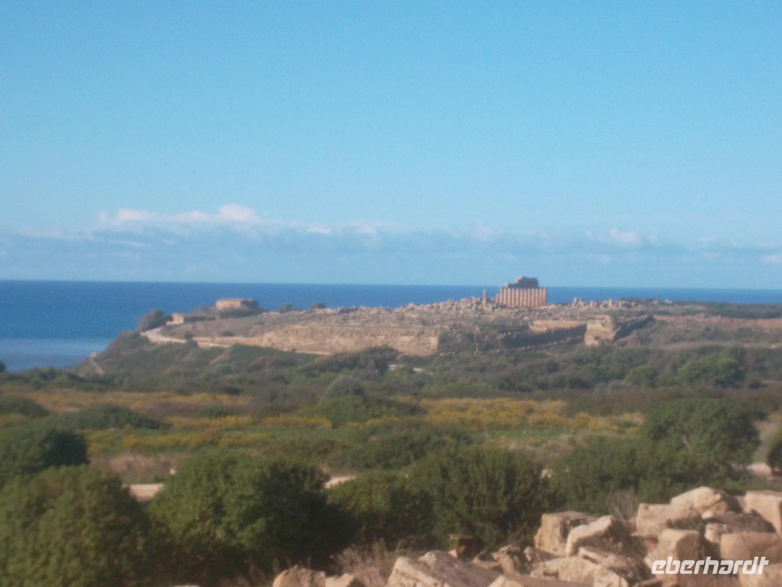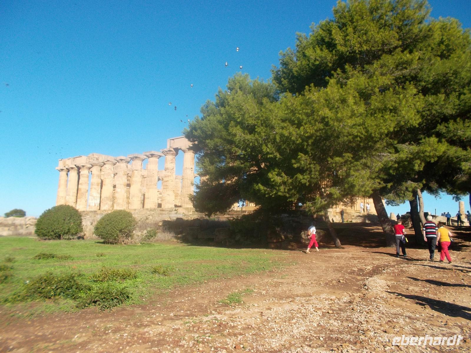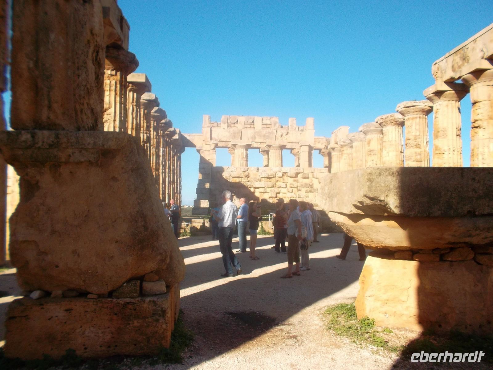 Insbesondere die einstige Akropolis mit vier Tempeln, gut erhaltenen Terrassierungen und Befestigungen aus dem 4. Jahrhundert v. Chr. und Überresten punischer Wohnhäuser, die auf Fundamenten griechischer Bebauung errichtet wurden, machen den Ort interessant - ganz abgesehen von den Tempeln und Fragmenten des sogenannten „Osthügels". Hier begannen wir, denn hier stehen die Reste des einstigen Hera-Tempels, in die wir hineingehen und gründlich den Aufbau griechischer Tempel studieren konnten. Kaum zu glauben, dass einst Goethe - von der griechischen Kulturvielfalt Selinuntes nichts ahnend, hier vorbeireiste, OHNE etwas zu besichtigen und dass aufgrund späterer hiesiger Funde die ganze Tempelarchäologie reformiert werden würde - denn hier fand man den Beweis, dass die alten Tempel nicht in hehrem Weiß, sondern bunt bemalt auf die Betrachter in der Antike wirkten.
