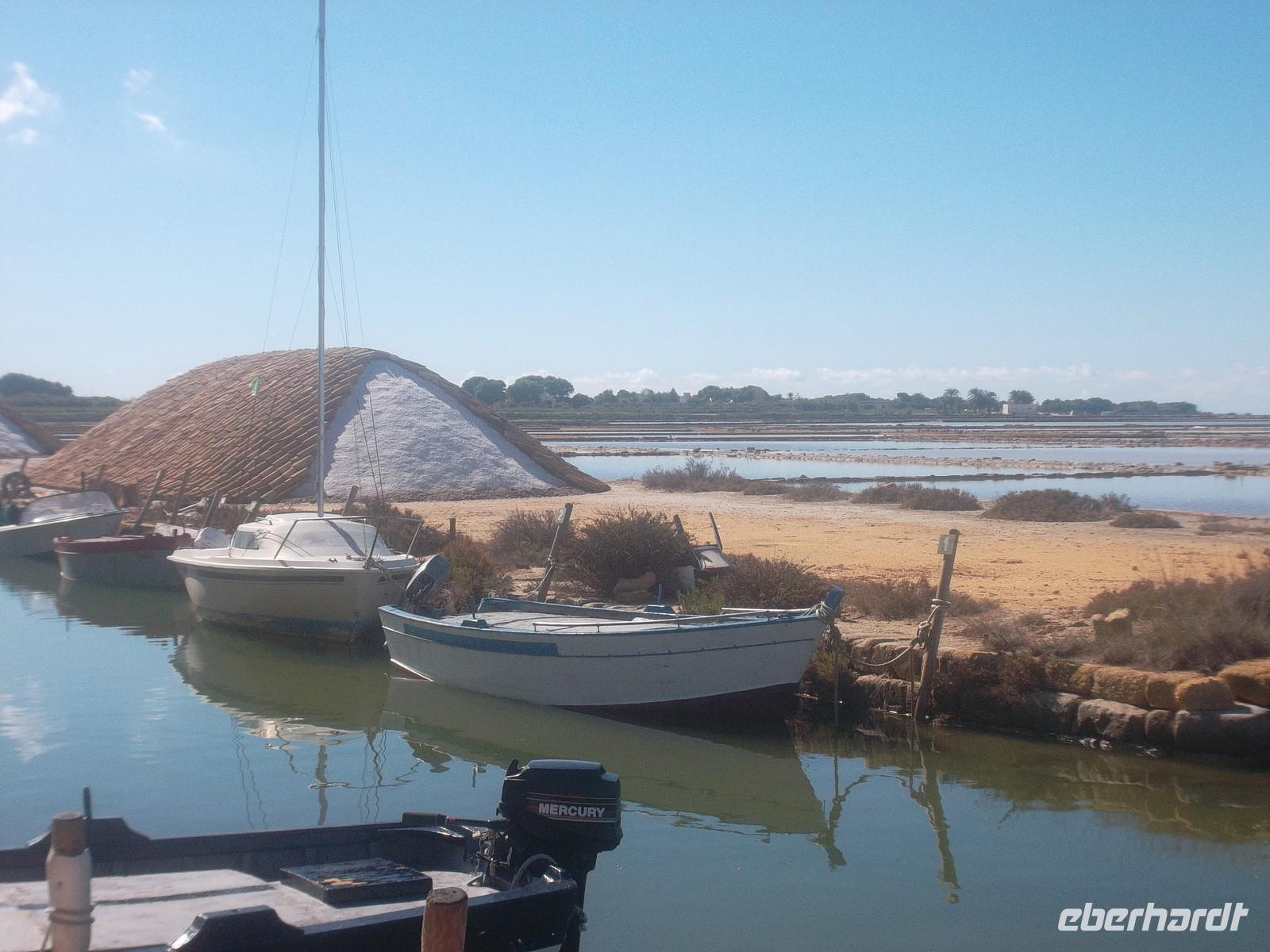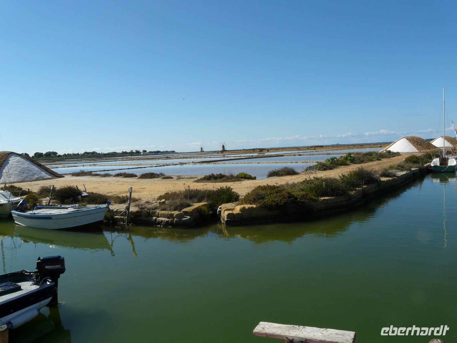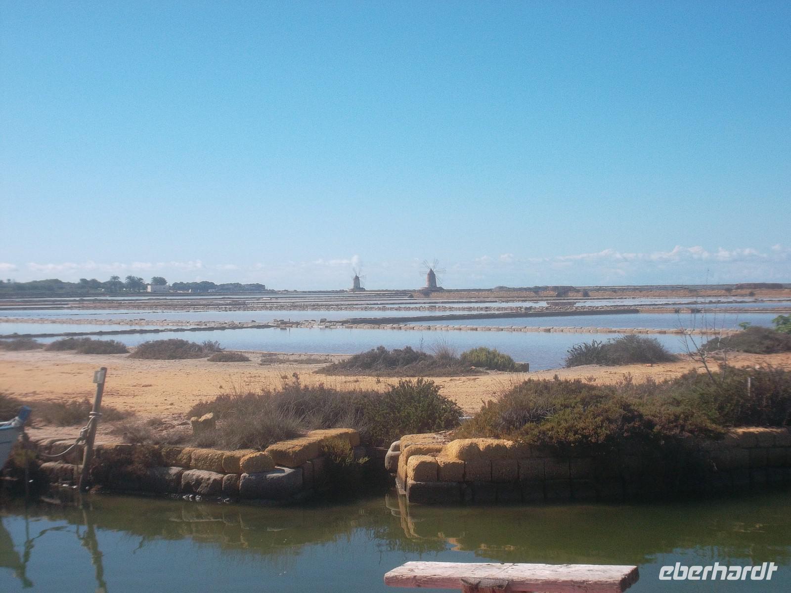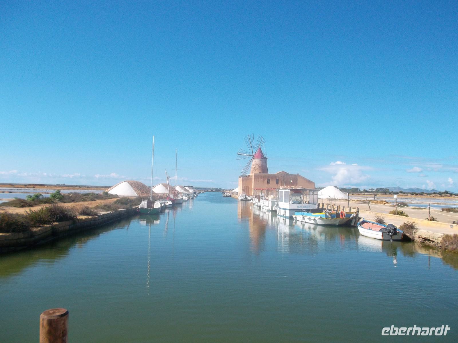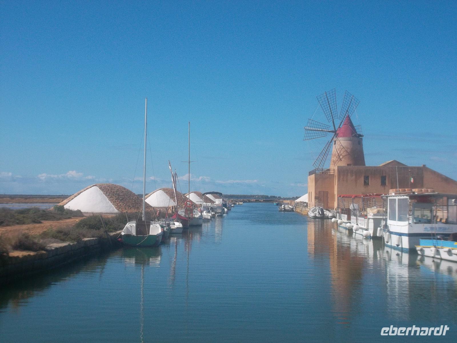 Buschauffeur Angelo war nach Verlassen dieses historischen Ortes gerne einverstanden, einen kleinen Umweg zu fahren und ab Marsala der Küstenstraße zu folgen. Für die durch ihren Süßwein berühmte Stadt hatten wir leider keine Zeit, aber eine atemberaubende Fahrt am Wasser entlang, mit Blick auf die sonnenüberfluteten Yachthäfen und vor allem die weit ausgebreiteten Salinen, die ihre Befüllung mit Meerwasser durch historische Windmühlen erreichten, konnten wir, unterbrochen von einzigartigen Fotostopps - anbieten.