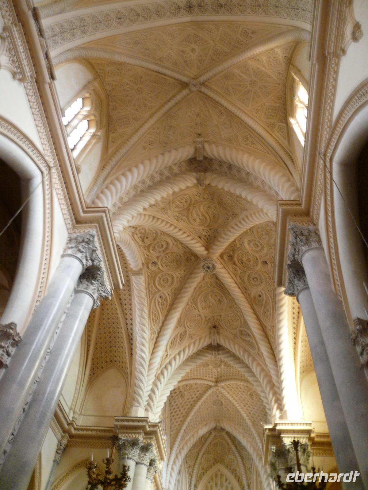 Von alters her ist die auf einem steilen Berg gelegene Stadt diversen Fruchtbarkeitskulten verpflichtet - Elymer, Karthager, Griechen und Römer erbauten hier Tempel zu Ehren ihrer Fruchtbarkeitsgöttinnen und kaum ein antiker Seefahrer versäumte es, den Liebesdienerinnen vom „Berg des Eryx" seine Aufwartung zu machen. Aufgrund der strategisch bedeutsamen Lage des Ortes behielt Erice auch später seine Bedeutung, auch wenn es als „Wallfahrtsort" in Vergessenheit geriet... Mehrere christliche Klöster und Kirchen, unter denen der zwar einfach wirkende, aber mit besonderer Kunstfertigkeit im arabisch-normannischen Stil verzierte Dom einen entscheidenden Platz einnimmt, bestimmen heute das Bild der am steilen Hang angelegten Stadt. Wir haben natürlich, im Sinne der Eberhardt- „Richtig Reisen!"-Philosophie, den Dom gemeinsam besucht, dann aber auch noch genug Zeit gehabt, um die Süßigkeiten zu verkosten, die die Stadt bereithält. Die Nonnen im nahen Kloster haben es in den vergangenen Jahrhunderten zu besonderer Kunstfertigkeit in der Herstellung von Marzipan-, Pistazien- und Mandelkuchen gebracht - und bis heute sind einige der Konditoreien des Ortes - z.B. die Pasticceria der Maria Grammatica - weithin berühmt für ihre Produkte.