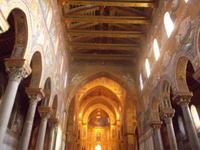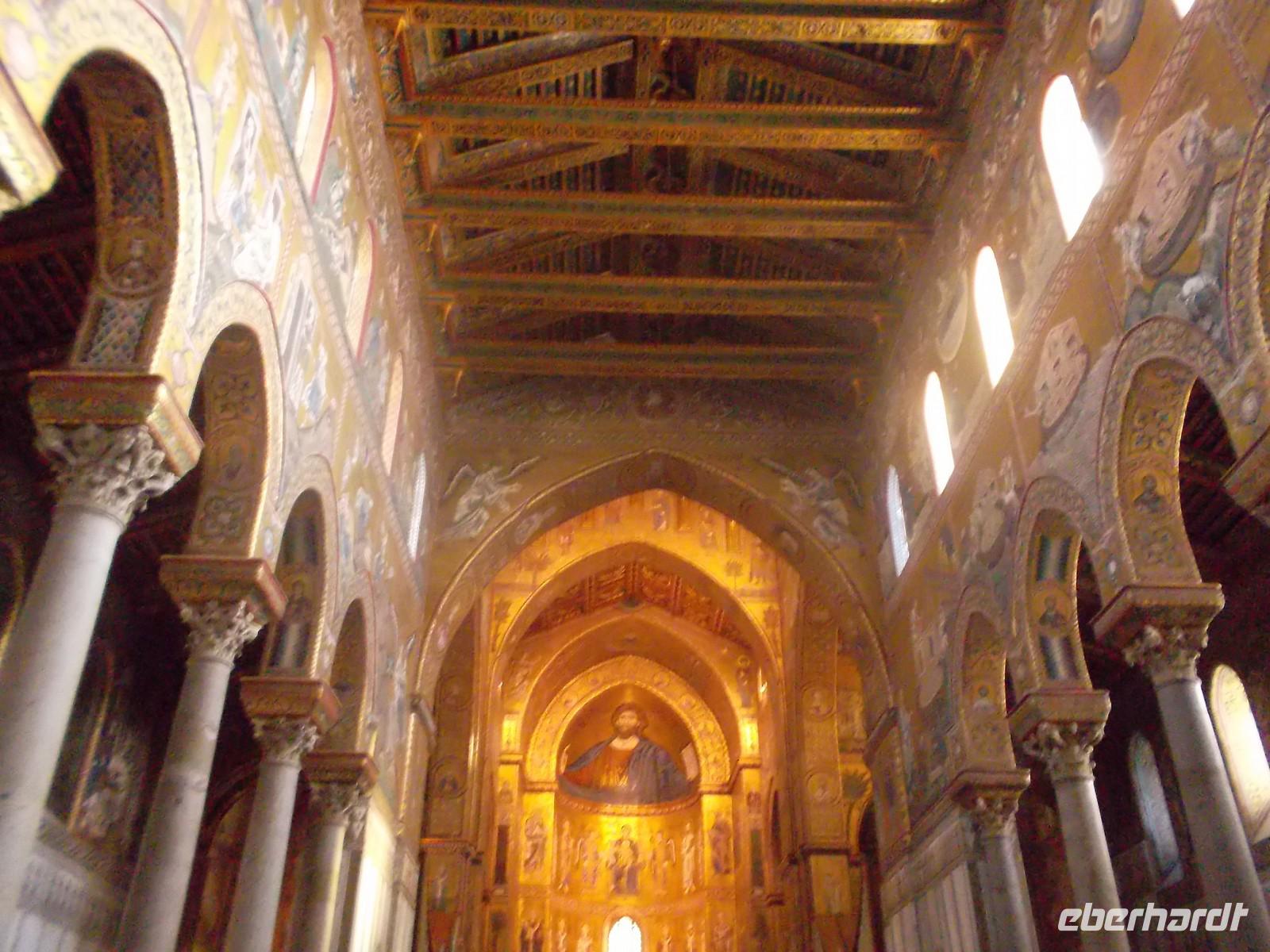 Herausgekommen ist ein einzigartiger Bau, in dem sich christlich-normannische Machtansprüche und Zeitgeschmack aufs Feinste mit arabisch-muslimischer Kunstfertigkeit, byzantinischer Tradition und traumhafter Ornamentik mischen! In der Hauptapsis ist Christus als Pantokrator (Weltenherrscher) dargestellt, sein goldenes Mosaik beherrscht den gesamten Innenraum. In den Medaillons des Bogens sind Christus, die Erzengel und die Propheten abgebildet. Darunter befinden sich Maria mit dem Jesuskind, neben ihr die Erzengel, die Apostel und vierzehn andere Heilige.
