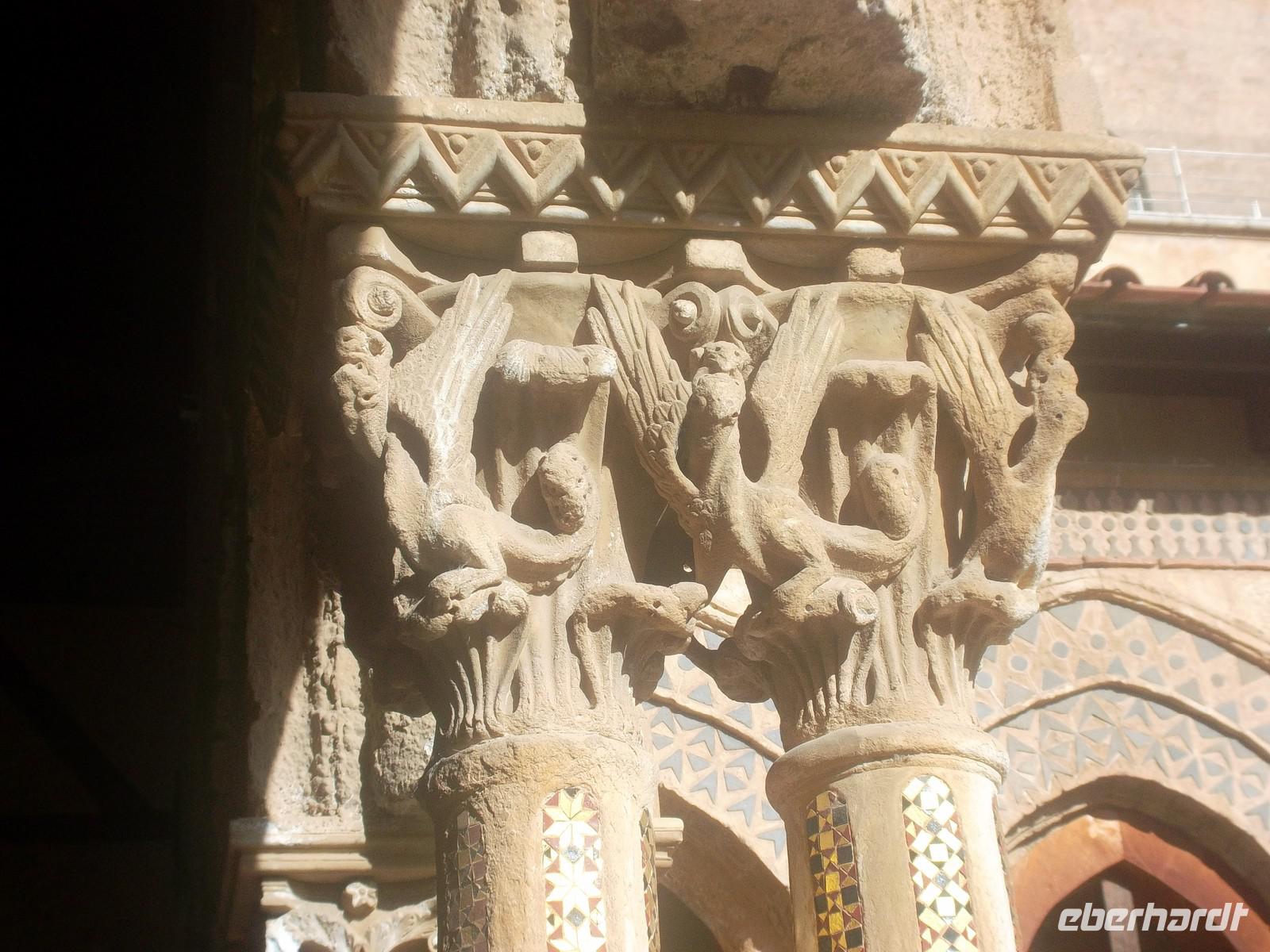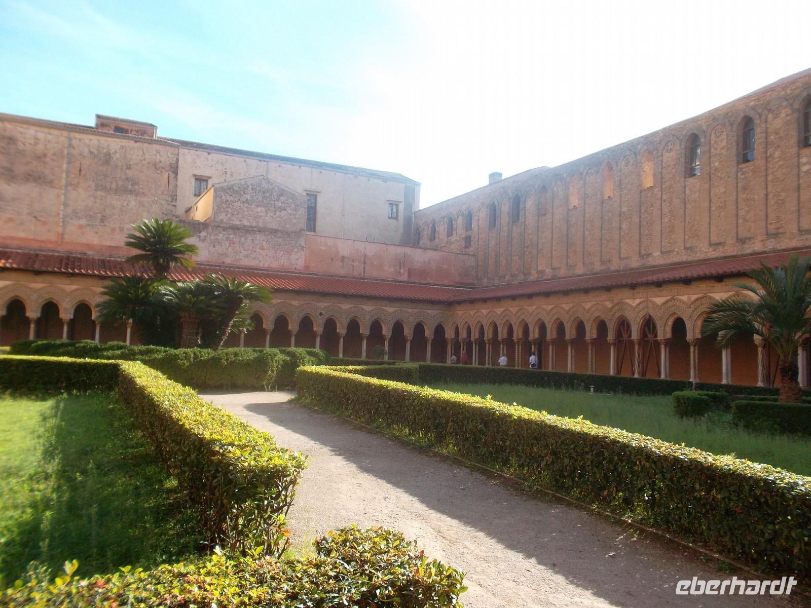 Unbedingt sehenswert ist aber auch der noch hervorragend erhaltene Kreuzgang, letzter komplett erhaltener Rest des einstigen Benediktinerklosters von Monreale. Jeweils 26 spitzbogige Arkaden, getragen von sehr unterschiedlich ausgeführten Doppelsäulen, bilden diesen Kreuzgang, der mit seiner Säulengestaltung und deren teilweise herrlich erhaltenen Kapitellen einzigartig ist. .