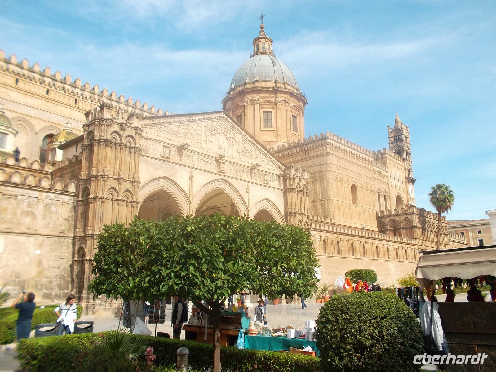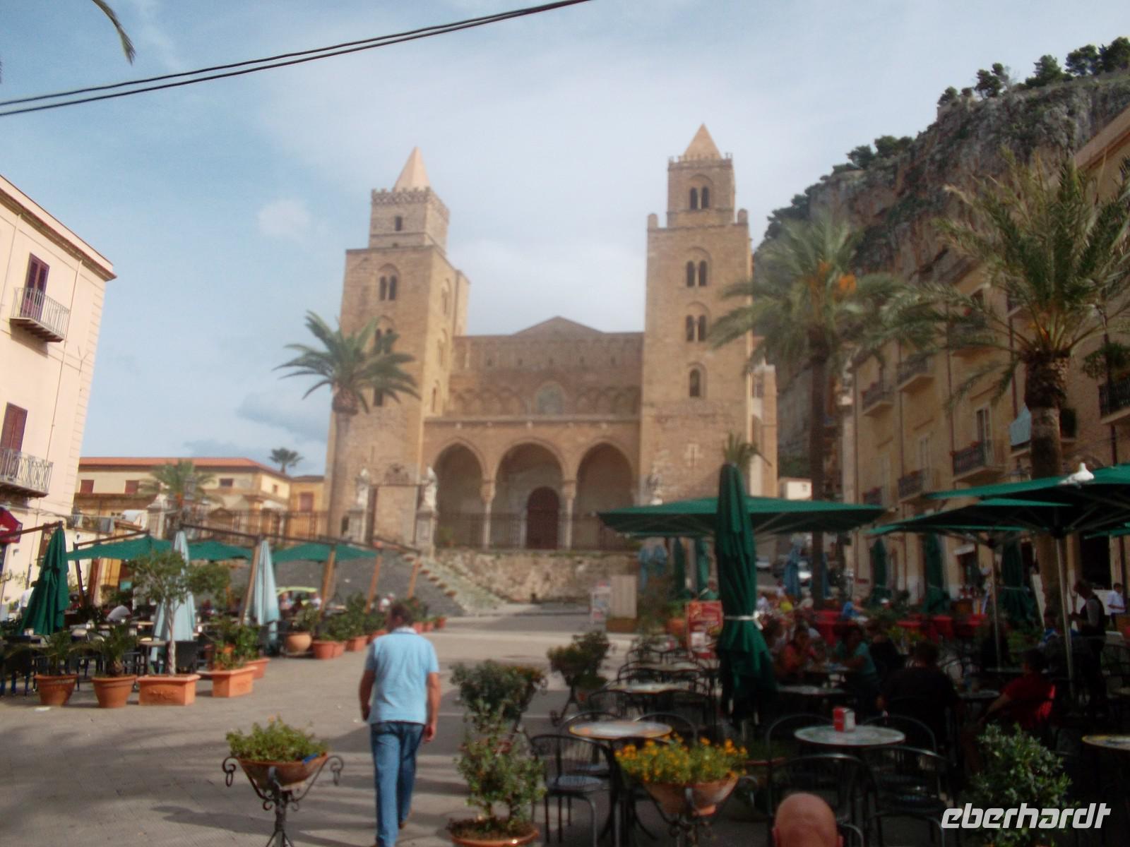 Ein paar Stufen führen vom Busparkplatz Monreale zum Dom - gesäumt von Händlern und Verkäufern, die ein nahezu mittelalterliches Bild der alten Stadt bieten. Die Besonderheit des Domes von Monreale liegt - neben seiner verschwenderischen Fülle an Wandmosaiken - in seiner Architektur als Wehr- und Kirchenbau. Niemandem entgeht der wehrhafte Aufbau mit Zinnen, Wehrplattformen und Wachtürmen - um so überraschender aber ist der Eindruck für denjenigen, der den Dom betritt: Mehr als 6000 m² Mosaiken, viele davon in Glas und Gold ausgeführt, beherrschen Wände und Decken des Bauwerkes. Wilhelm II., normannischer König von Sizilien, wollte mit seiner Kathedrale, die Wehr- und Memorialbau zugleich ist, einen Kontrapunkt zu den Bauten des unweit gelegenen Erzbistums Palermo schaffen, die Macht des Königs gegen die des Erzbischofs demonstrieren.