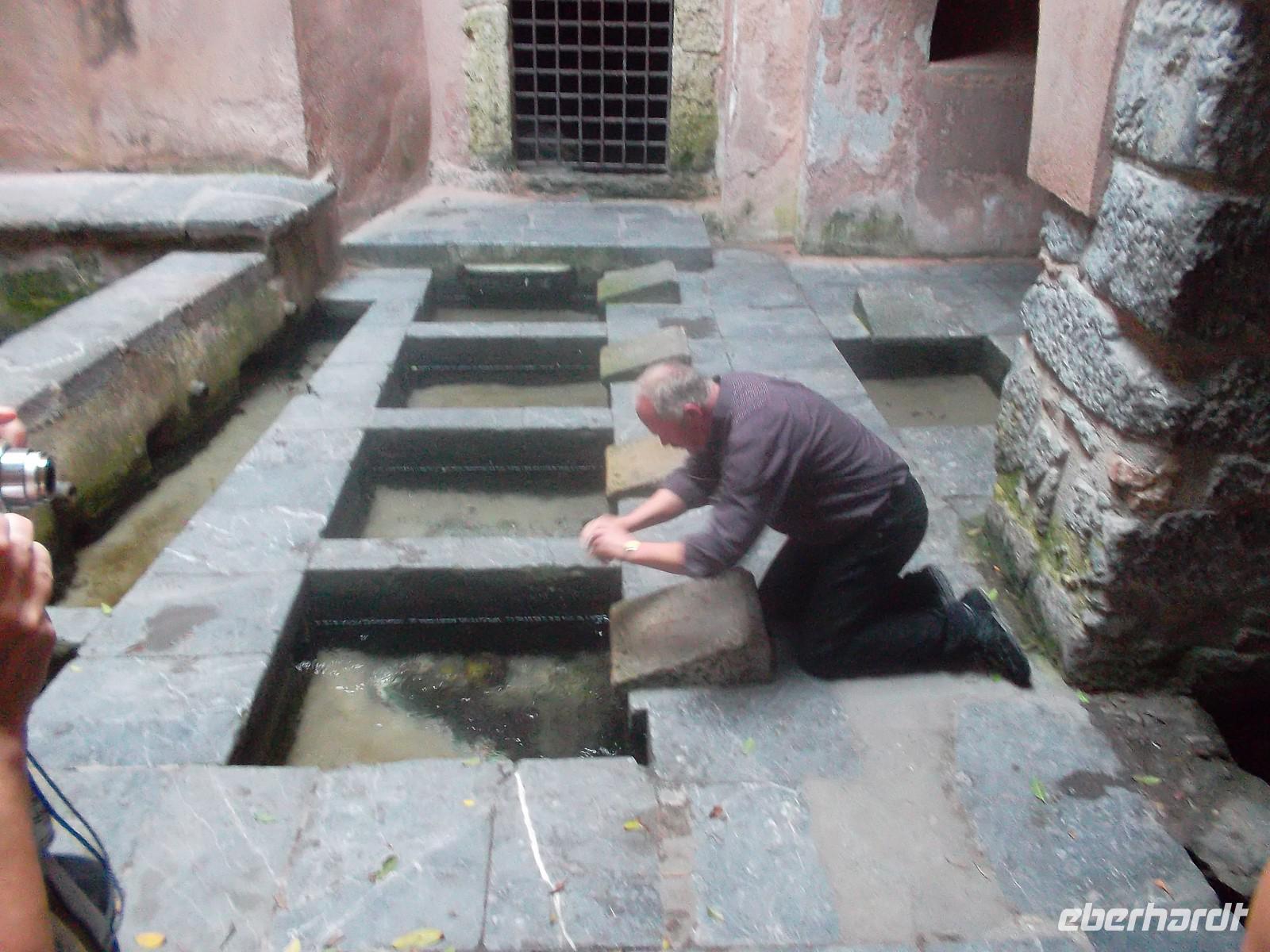 Der heutige Tag begann mit dem Besuch in einer Dorfgemeinschaft in den Bergen nahe Agrigent. Die Kooperative von Sant Angelo Muxaro hat es geschafft, ihr urwüchsiges Leben inmitten der stets moderner werdenden Zeitläufe zu bewahren. Nach einstündiger Busfahrt trafen wir auf dieses funktionierende Gemeinwesen und wurden von der örtlichen Reiseleiterin Carmelinas, die lange in Deutschland gelebt hatte, herumgeführt. Handgeschöpften Ricotta-Quark, einen Tag gereiften Schafskäse und frisches Brot mit Olivenöl konnten wir verkosten, bevor die sizilianische Natur mit aller Härte zuschlug. Obwohl wir kurz Schutz in der Dorfkirche gesucht hatten, brach beim zweiten Teil des Rundganges ein Unwetter über uns herein: selbst die Hartgesottensten unter uns konnten sich nicht die Wassermassen vorstellen, die der gerade noch freundliche Himmel über Muxaro niedergehen ließ: die Straßen und Bürgersteige verwandelten sich in Sekundenschnelle zu reißenden Flüssen, die man einfach nicht überqueren konnte. Mehr als eine halbe Stunde dauerte es, bevor wir alle Mitreisenden in der Dorfgaststätte zum Mittagessen versammelt hatten - und jeder der später ins Restaurant Gelangten hatte seine ganz persönliche Erfahrung mit der Freundlichkeit und Hilfsbereitschaft der Dorfbewohner gemacht. Einhellige Meinung: Der Wolkenbruch kam unerwartet, aber er gehört untrennbar nunmehr zum „Erfahrungsschatz Sizilien" dazu!